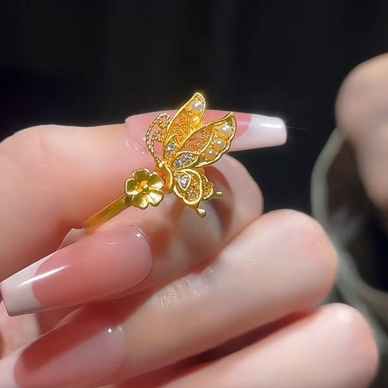 Anillo de flor de mariposa de amor de oro antiguo diseño exquisito de nicho temperamento de alta gama de lujo ligero anillo abierto ajustable