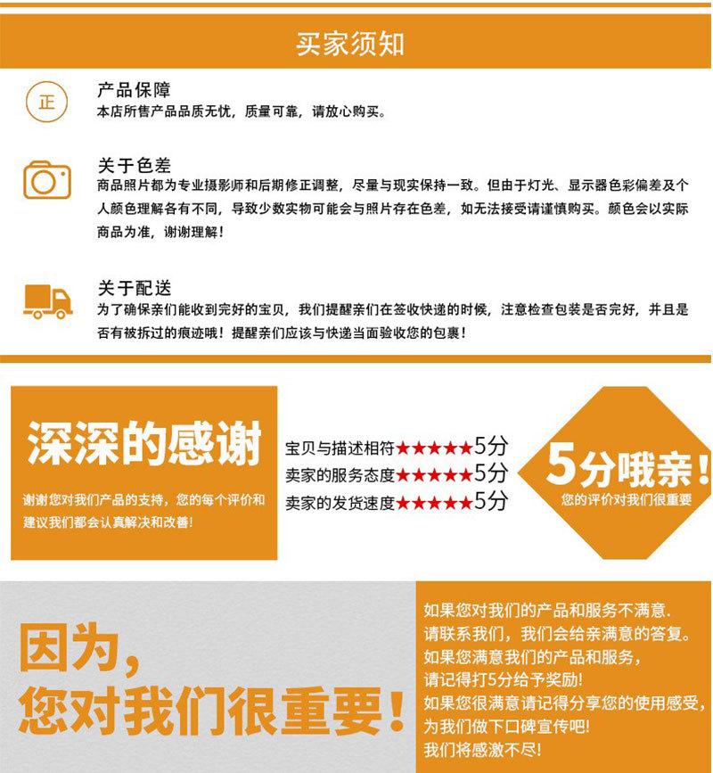 (1) Admite transacciones garantizadas de Alipay, pago completo, procesamiento del pedido dentro de las 24 horas y envío dentro de las 48 horas posteriores al pago a través de Alipay. (2) Los clientes deben revisar la mercancía el día que la reciban o al día siguiente. Si encuentra algún problema, por favor, tome fotos y envíenoslas. Le daremos una solución satisfactoria. (3)Debido a que los consumidores tienen requisitos diferentes, algunos compradores tienen requisitos demasiado elevados o demasiado sensibles para los productos en línea.Por lo tanto, no reembolsaremos ni cambiaremos los productos si no hay ningún problema de calidad después de la venta. Lea atentamente antes de comprar.Por favor, considere cuidadosamente antes de realizar el pedido, problemas de calidad del cambio. (4) Debido a la tecnología de disparo y a problemas con el monitor de la computadora, inevitablemente habrá alguna diferencia de color entre el producto real y la imagen. ¡Gracias por su comprensión! (5) Las imágenes son solo de referencia. No se permiten imágenes que den lugar a su imaginación ni a ideas subjetivas.La imaginación de cada uno es infinita y no se puede satisfacer individualmente. ¡Consulte el producto real! (6) Si no hay ningún problema de calidad, no se aceptarán devoluciones ni cambios. Sin embargo, si al comprador no le gusta el producto, es muy diferente a la imagen, no le gusta, no está satisfecho con él o no es tan bueno como lo imaginaba, etc., no se aceptarán devoluciones ni cambios.Pero si el producto apareceÓxido, pintura descascarada,Todos los productos serán devueltos o cambiados si hay algún problema de calidad objetivo.Si encuentra algún problema de calidad, comuníquese con nosotros dentro de las 48 horas.¡Póngase en contacto con atención al cliente, ya no se aceptarán solicitudes vencidas! |