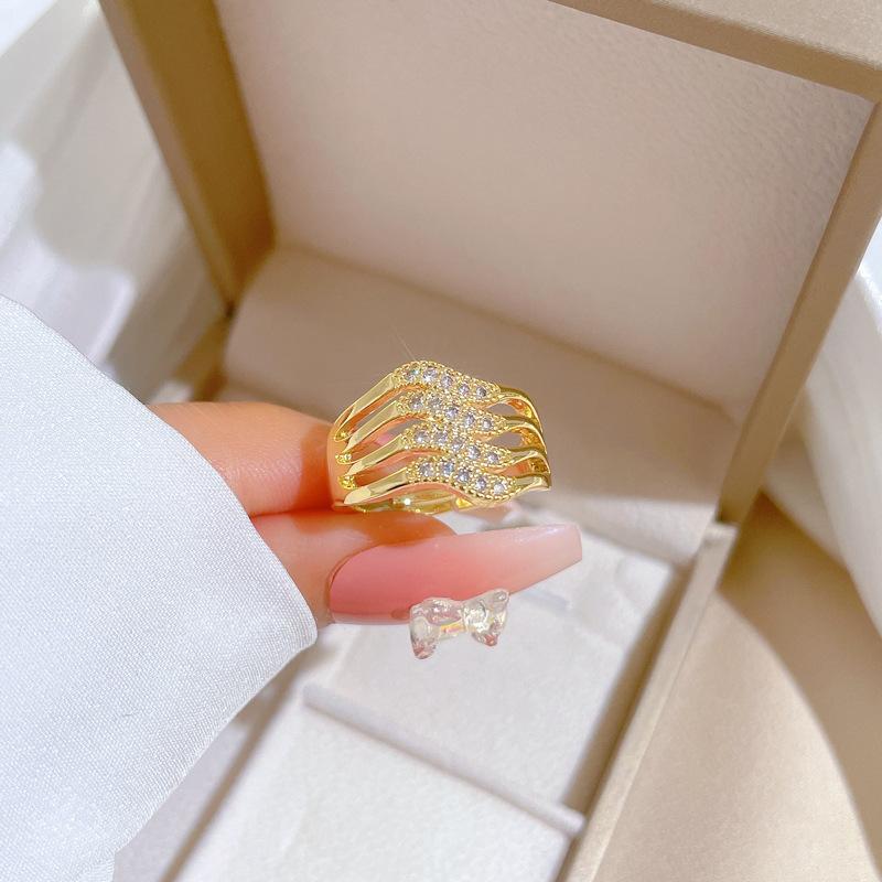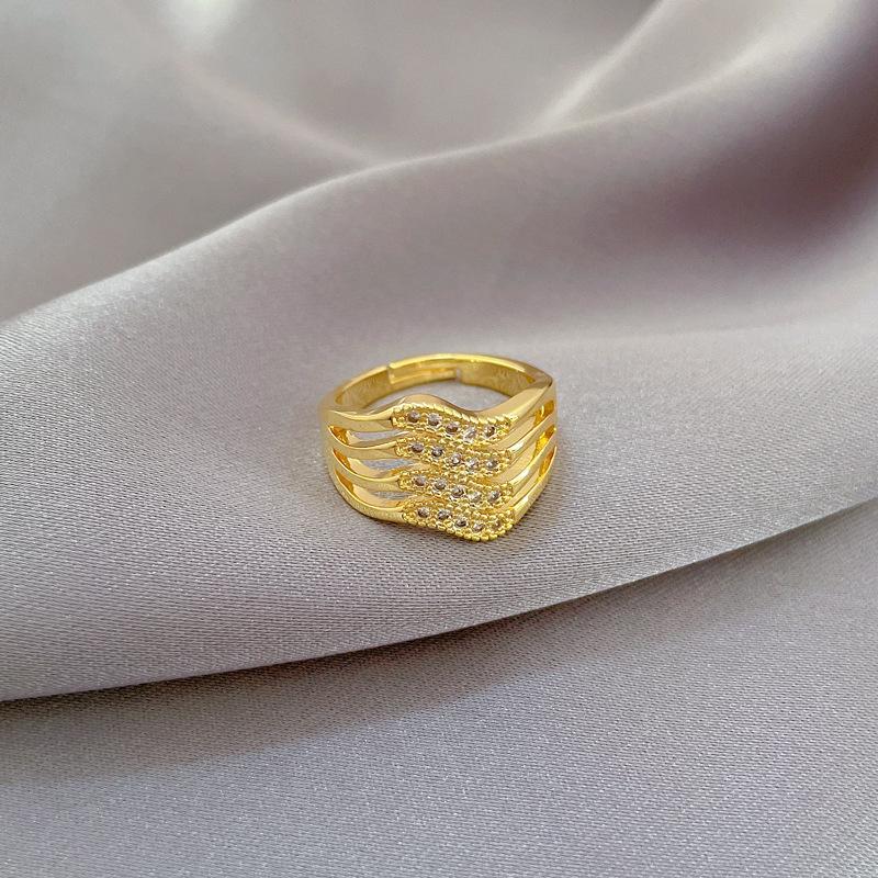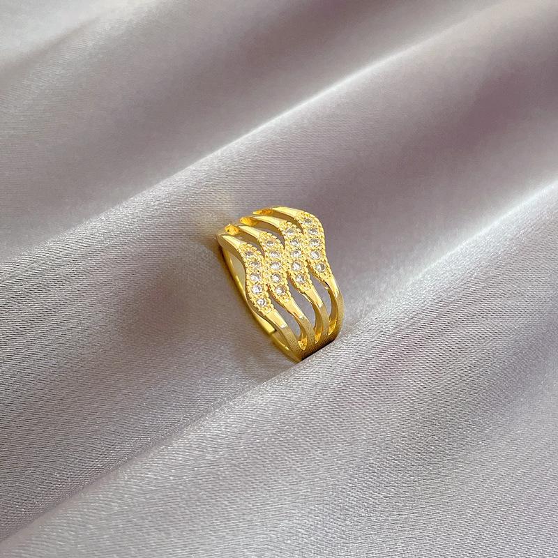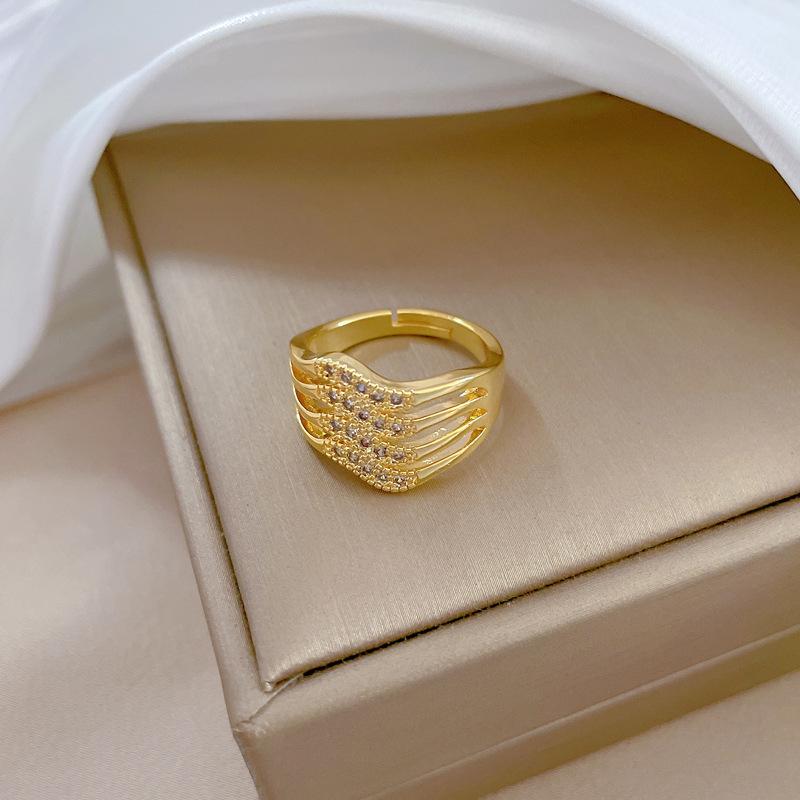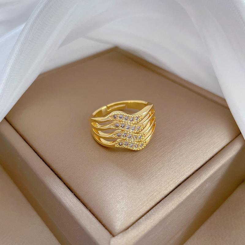 [Oro Real] Anillo de Moda de Zirconia de Cuatro Capas Abierto Ajustable Simple Teléfono Japonés Anillo de Pareja