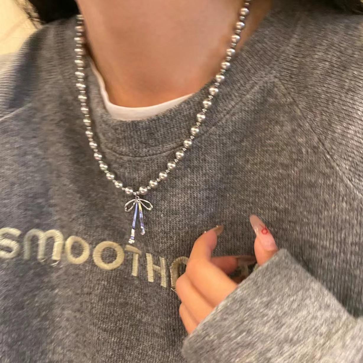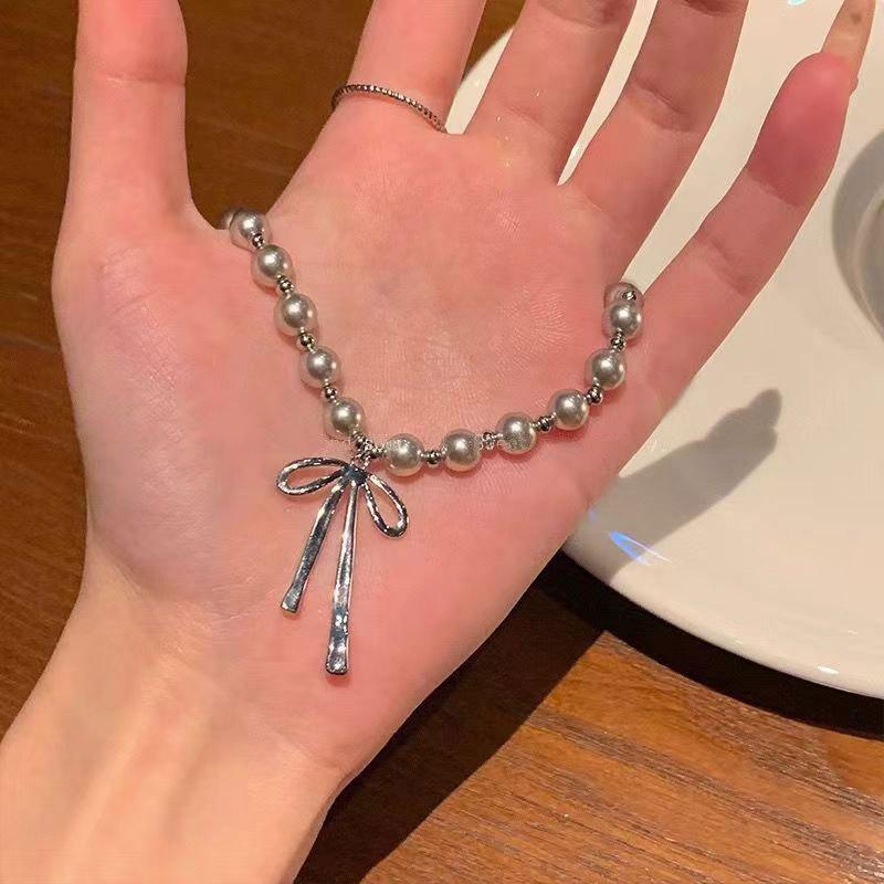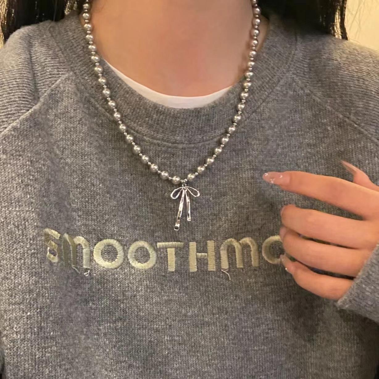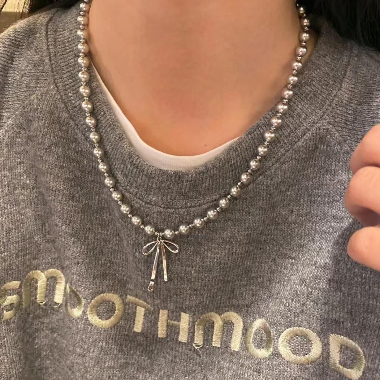 Collar de perlas con lazo de estilo frío, estilo nicho, ligero, de lujo, de alta gama, a la moda, sencillo, combinable con todo, de color gris.