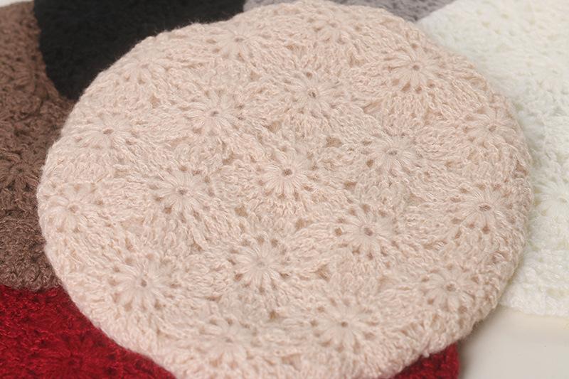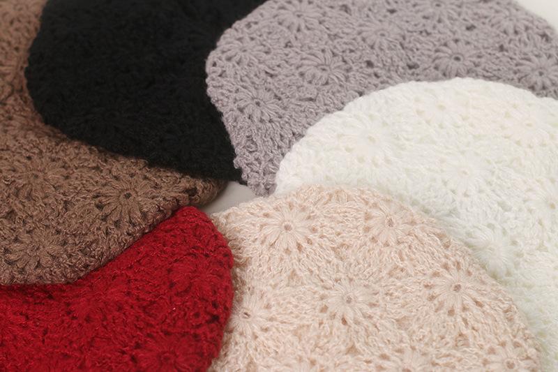 Boina de flor hueca retro japonesa tejida a mano, sombrero de lana de punto para mujer, otoño e invierno, diseño de nicho, sombrero de pintor cálido