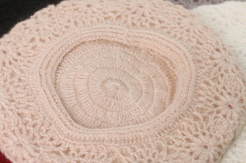 Boina japonesa vintage hueca con gancho de mano y flores para mujer, gorro de pintor de mohair de nicho para otoño e invierno, gorro cálido.