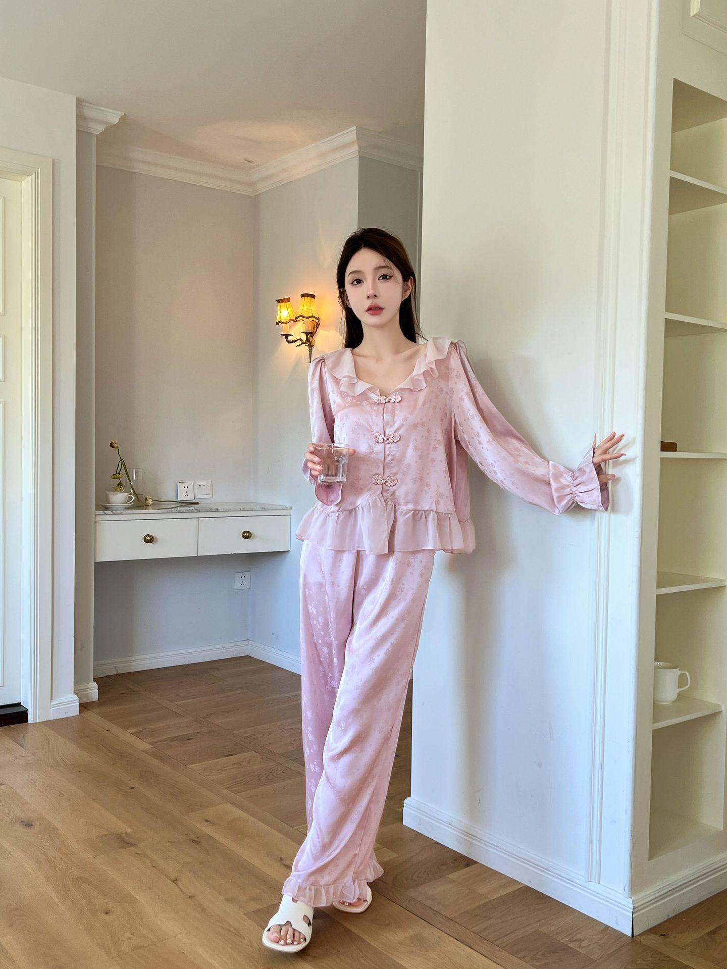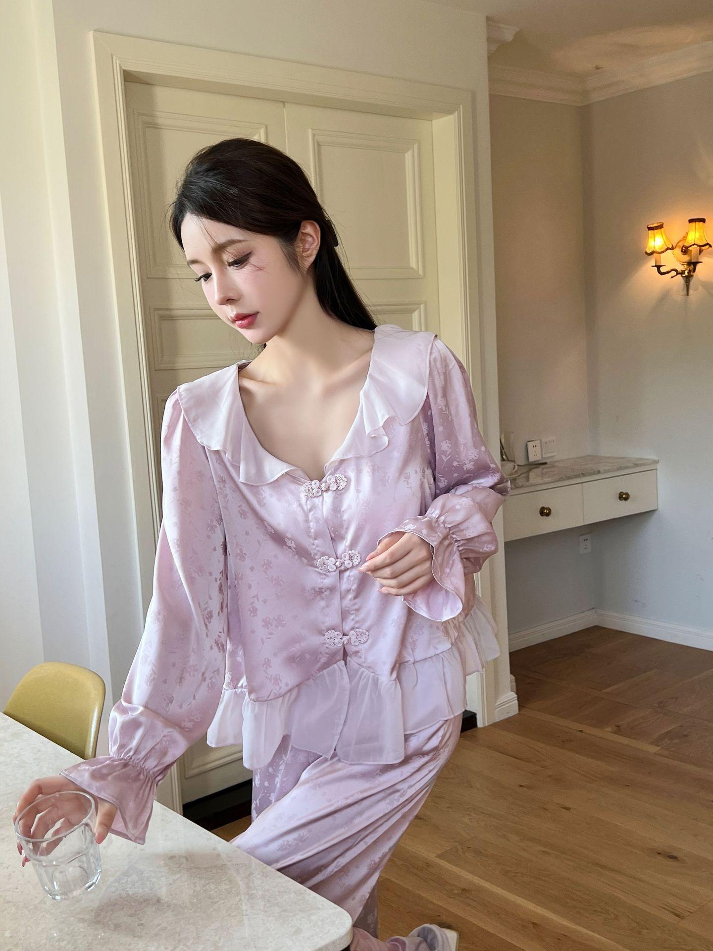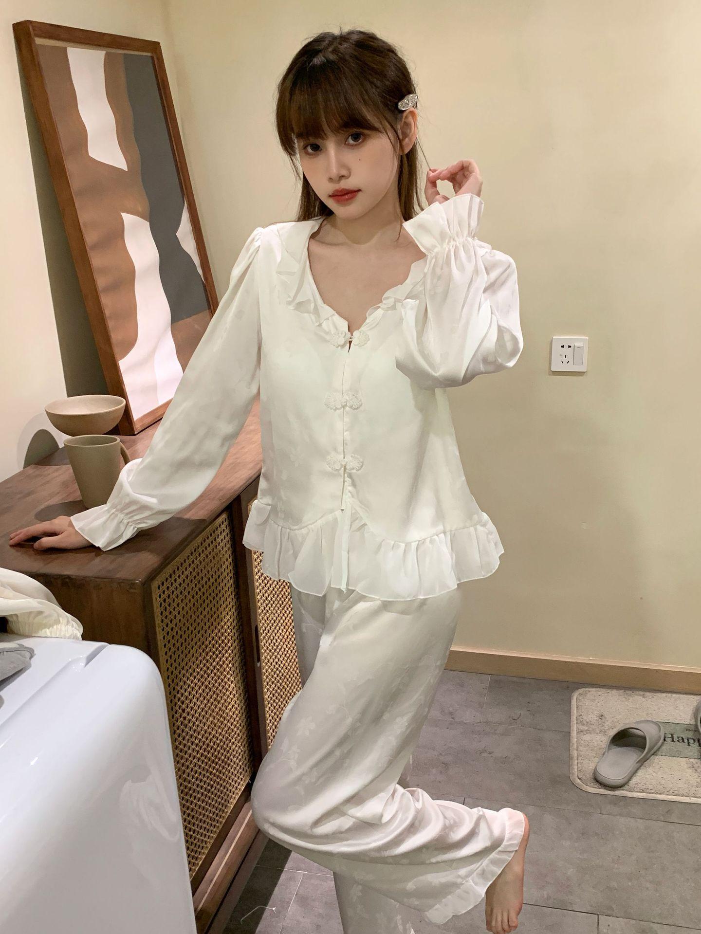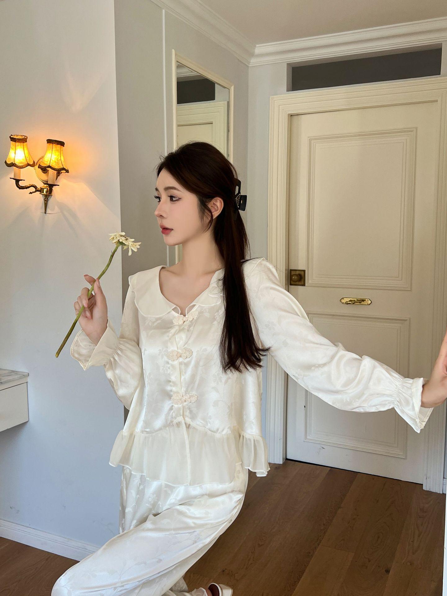 Pijama nuevo de otoño de jacquard de seda de hielo para mujer, estilo japonés de corte dulce de manga larga, ropa de casa para niña, pijama estilo Chanel