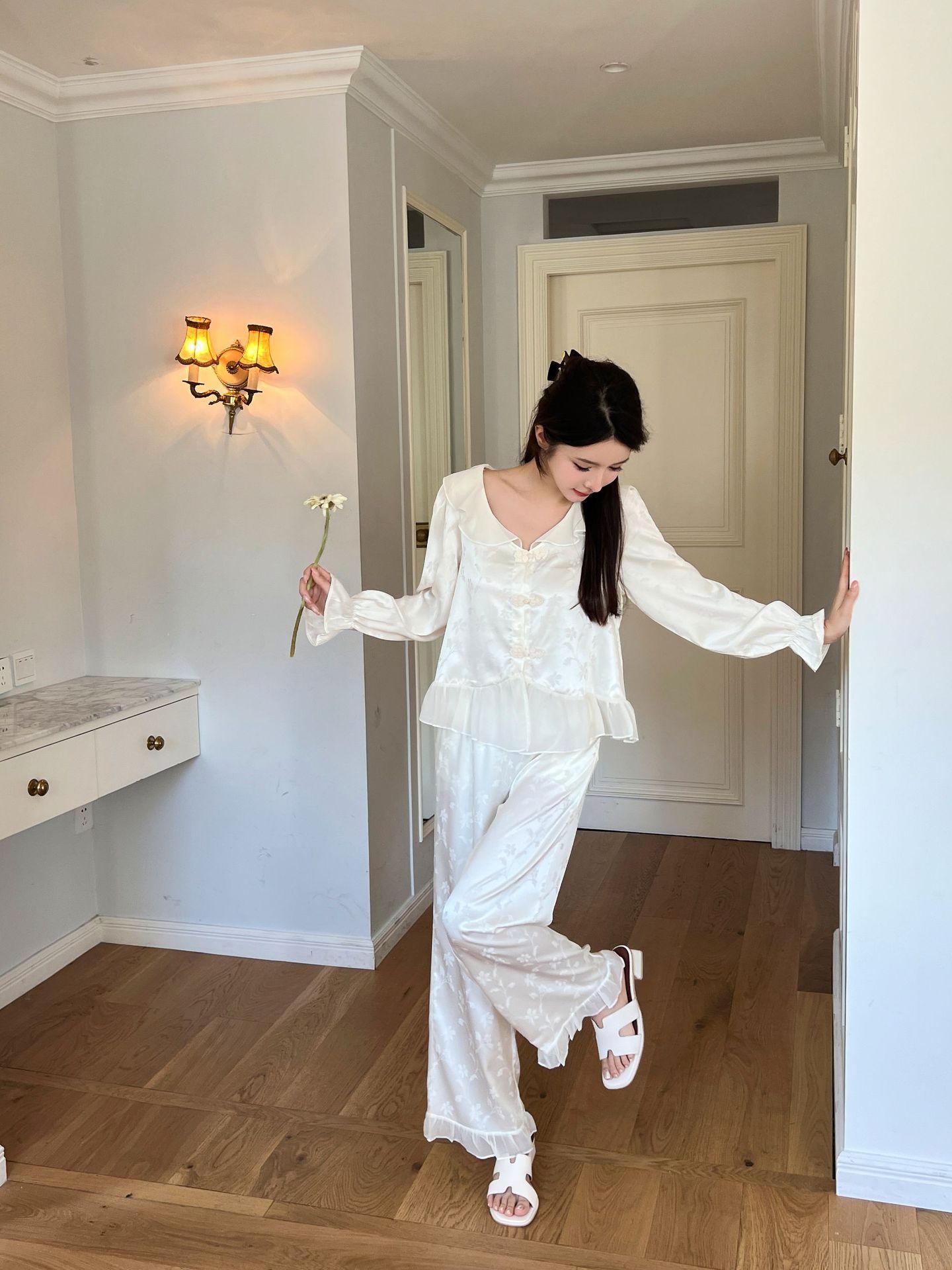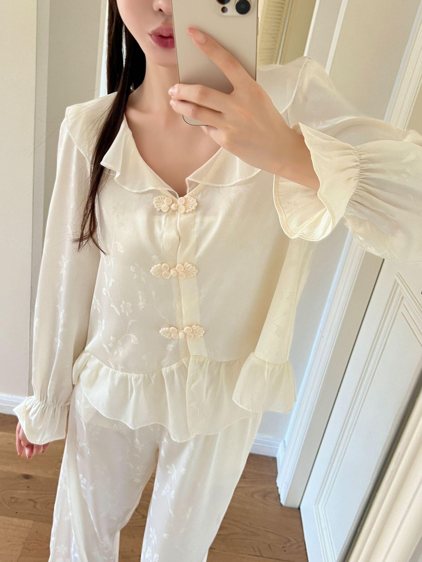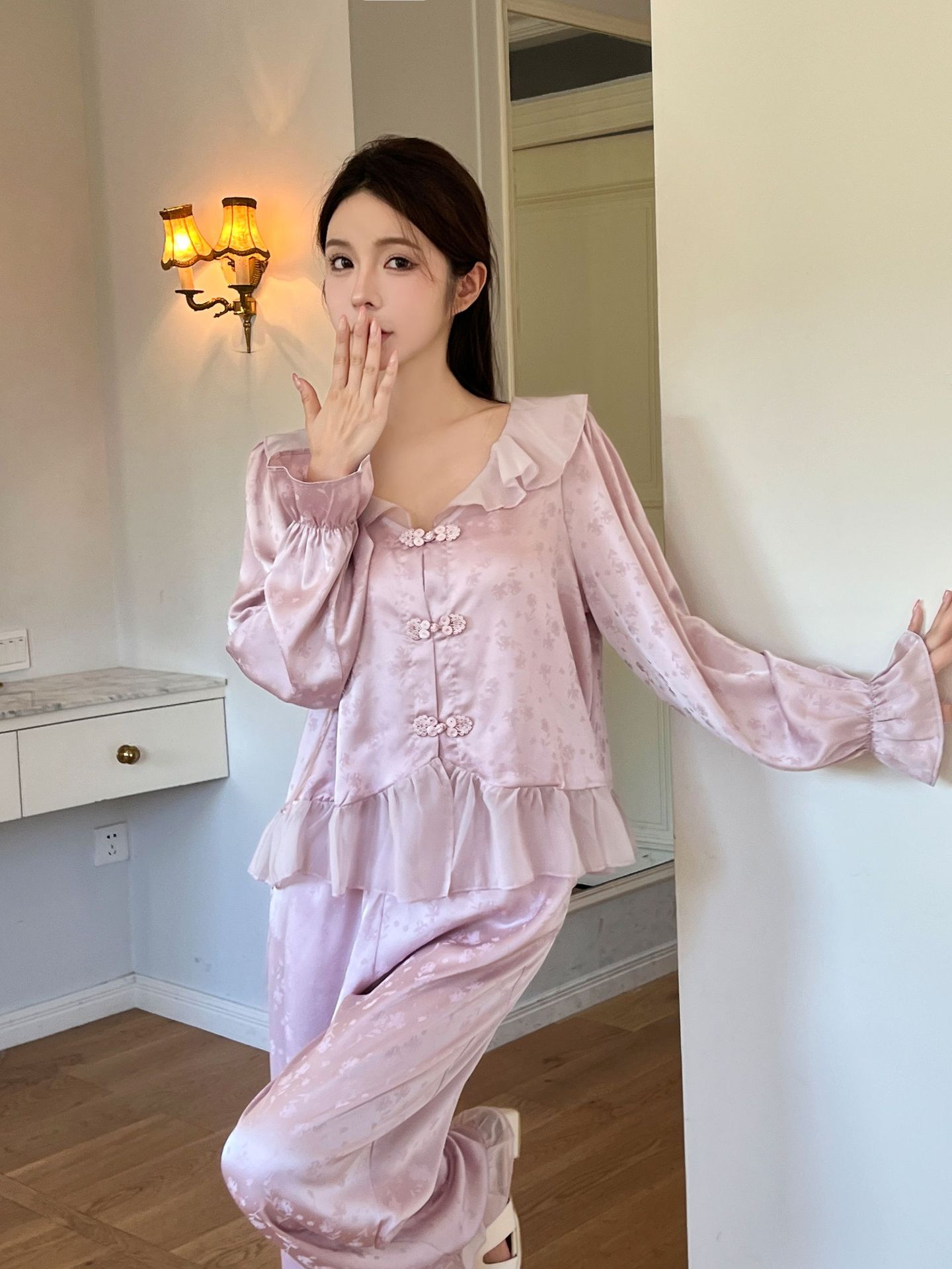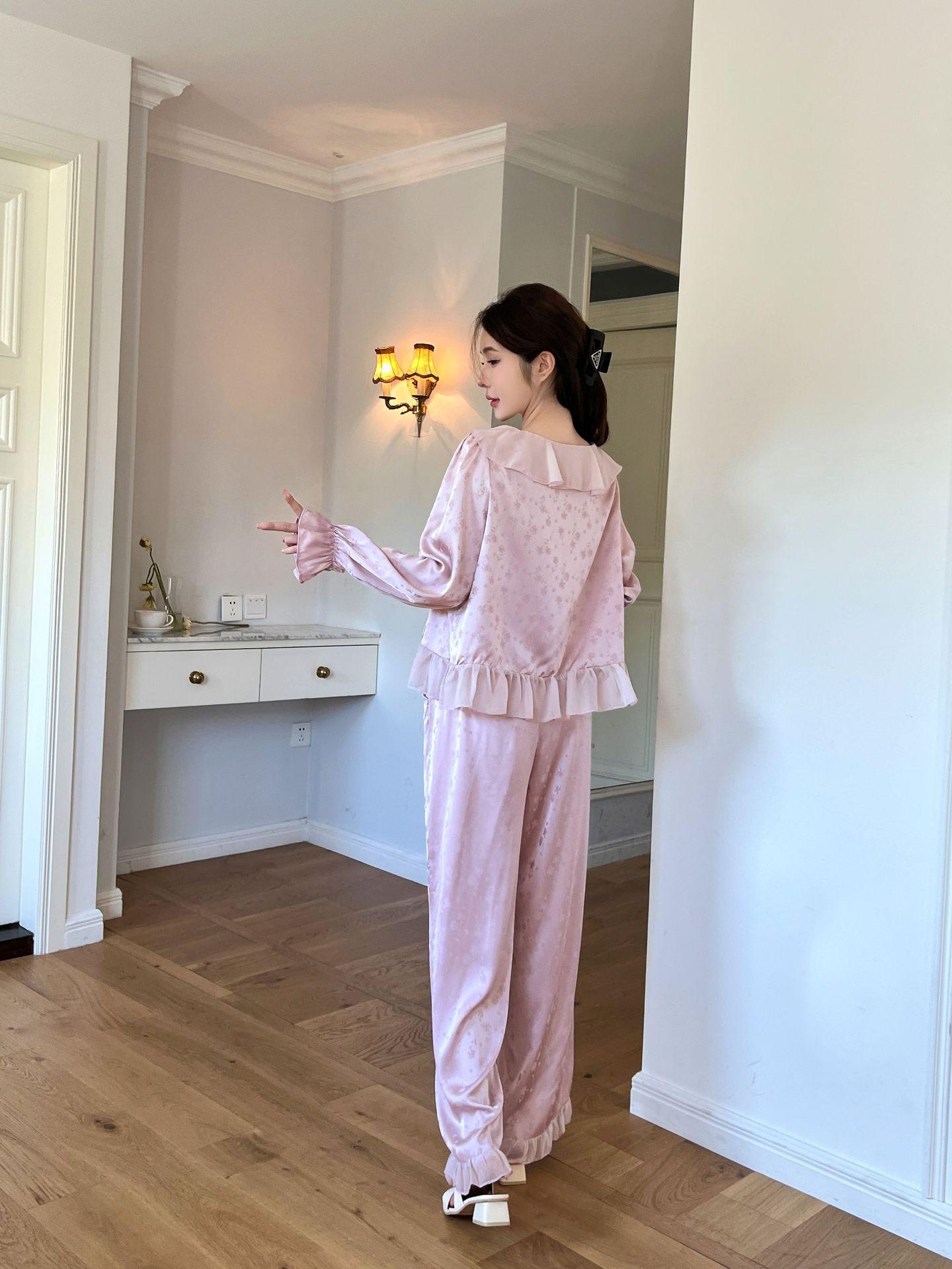 Pijama nuevo de otoño de jacquard de seda de hielo para mujer, estilo japonés de corte dulce de manga larga, ropa de casa para niña, pijama estilo Chanel