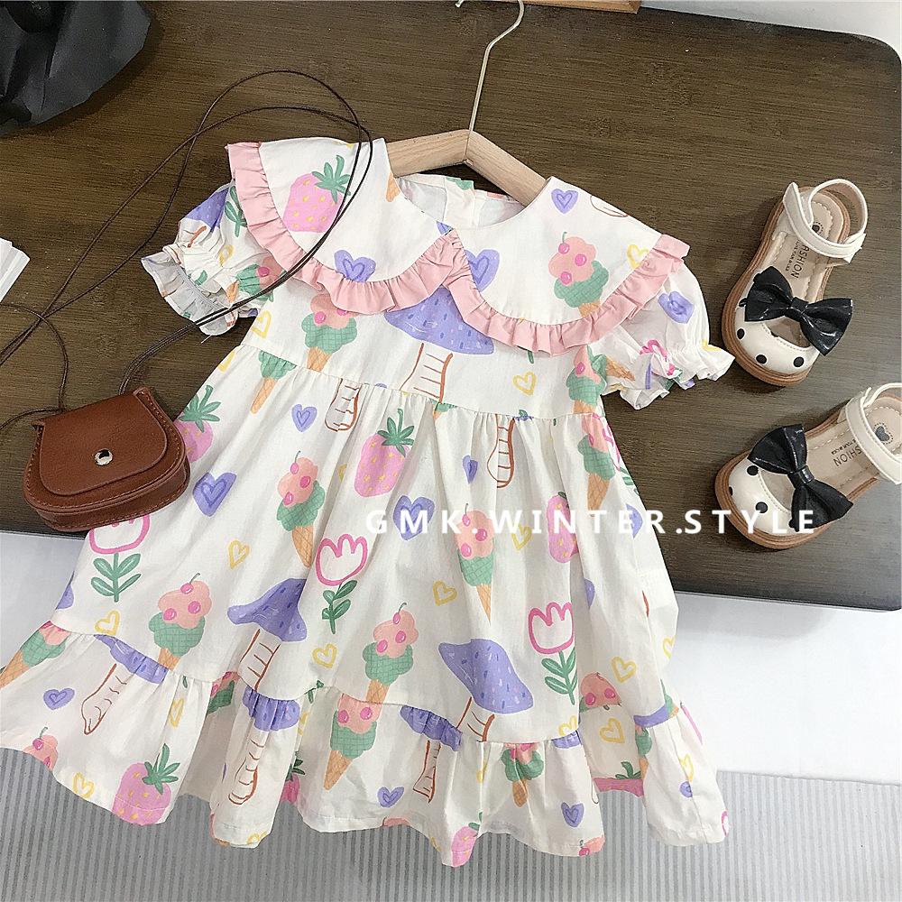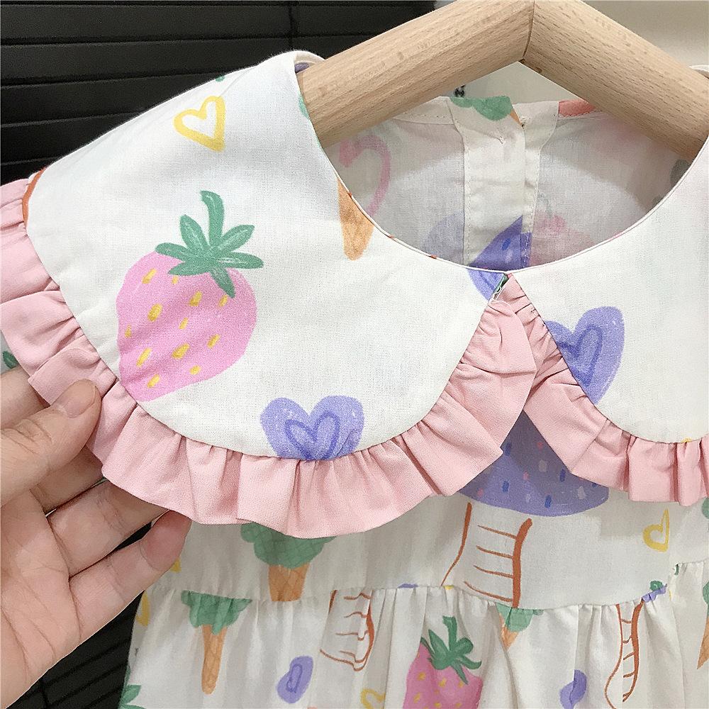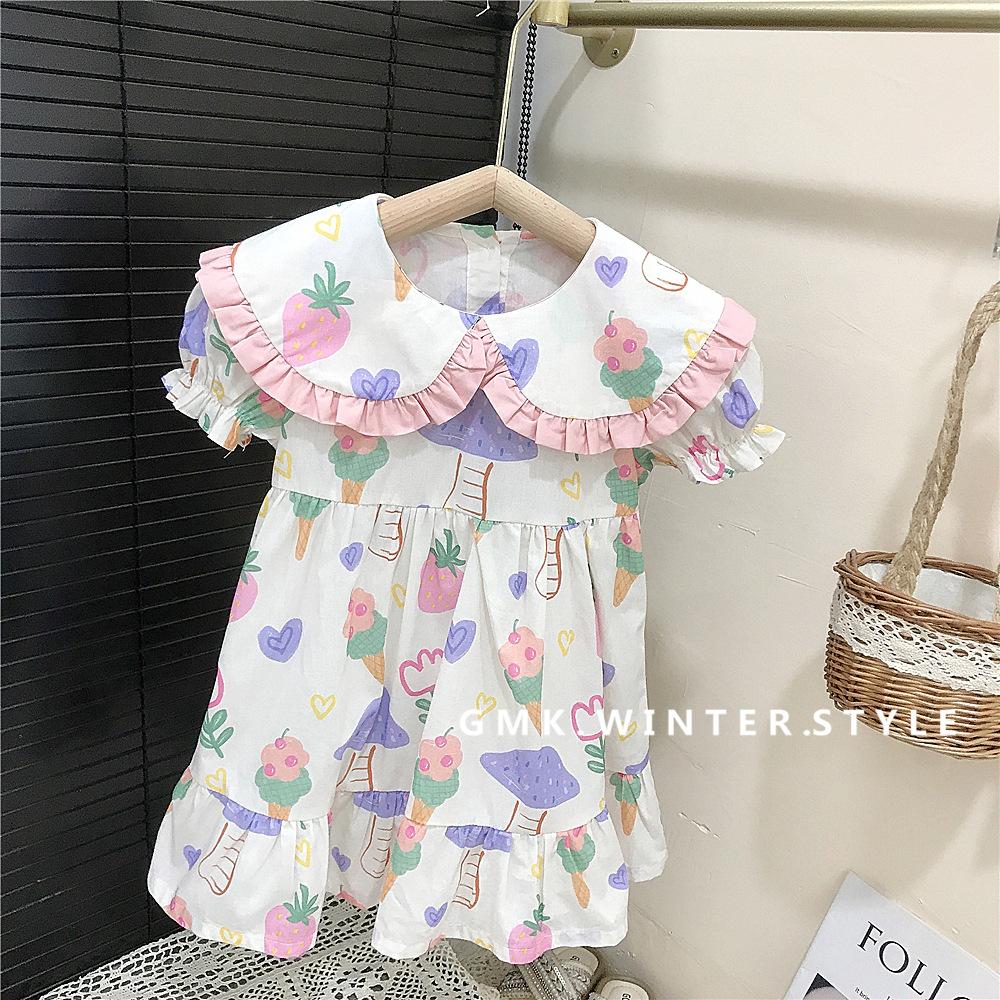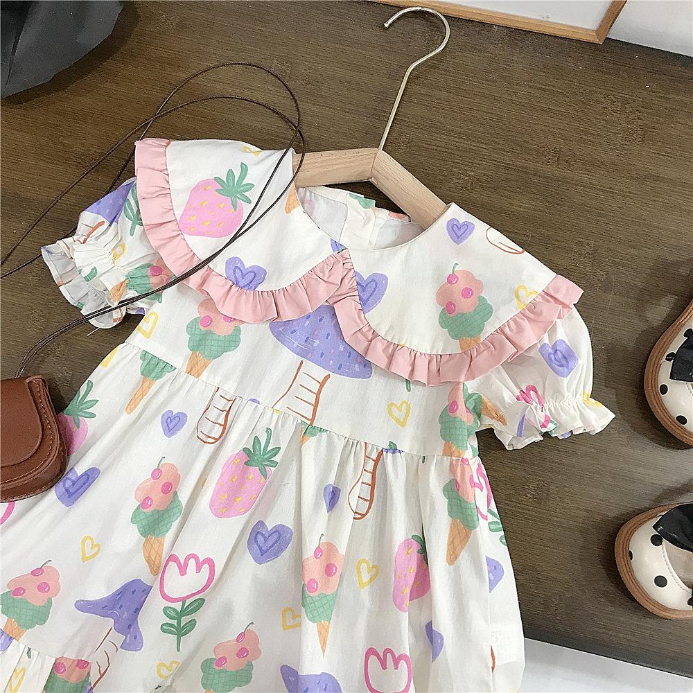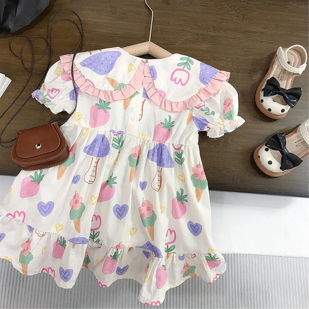 Vestido de manga corta para niña Verano Nuevo Vestido estampado para niños Lindo niña Bebé Solapa Algodón Vestido de princesa