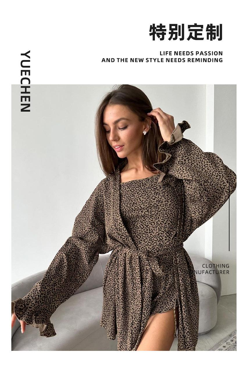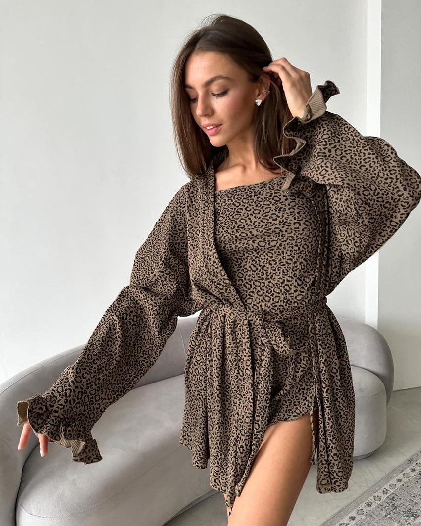 Pijama de verano de tres piezas para mujer, ropa interior de manga larga con volantes y estampado de leopardo, estilo europeo y americano