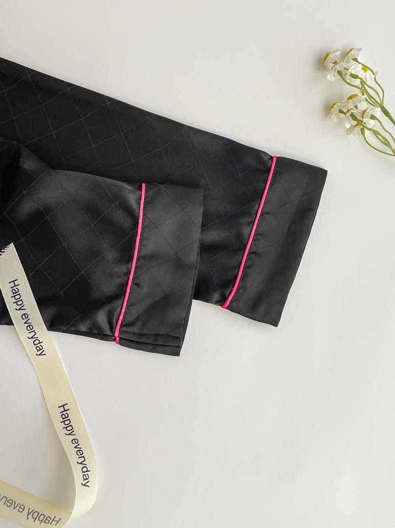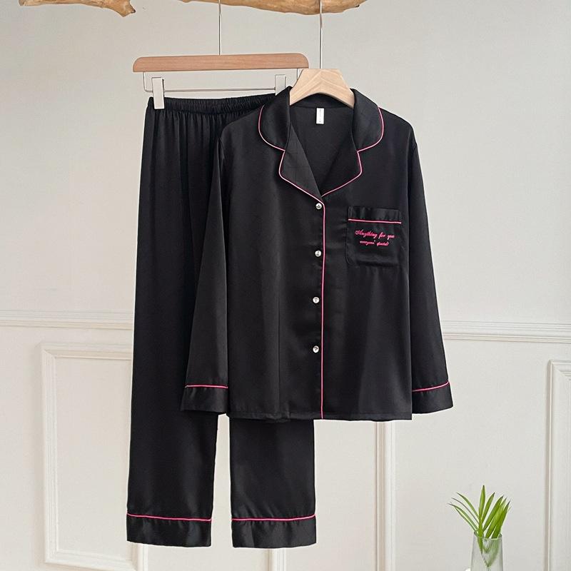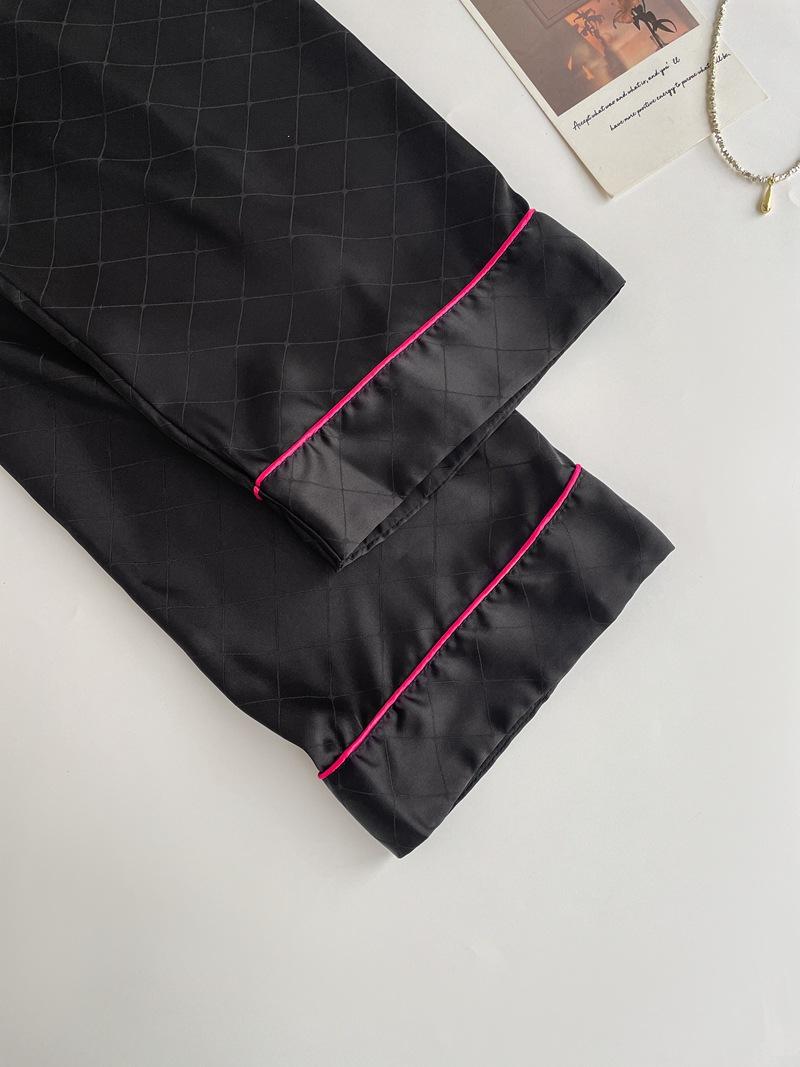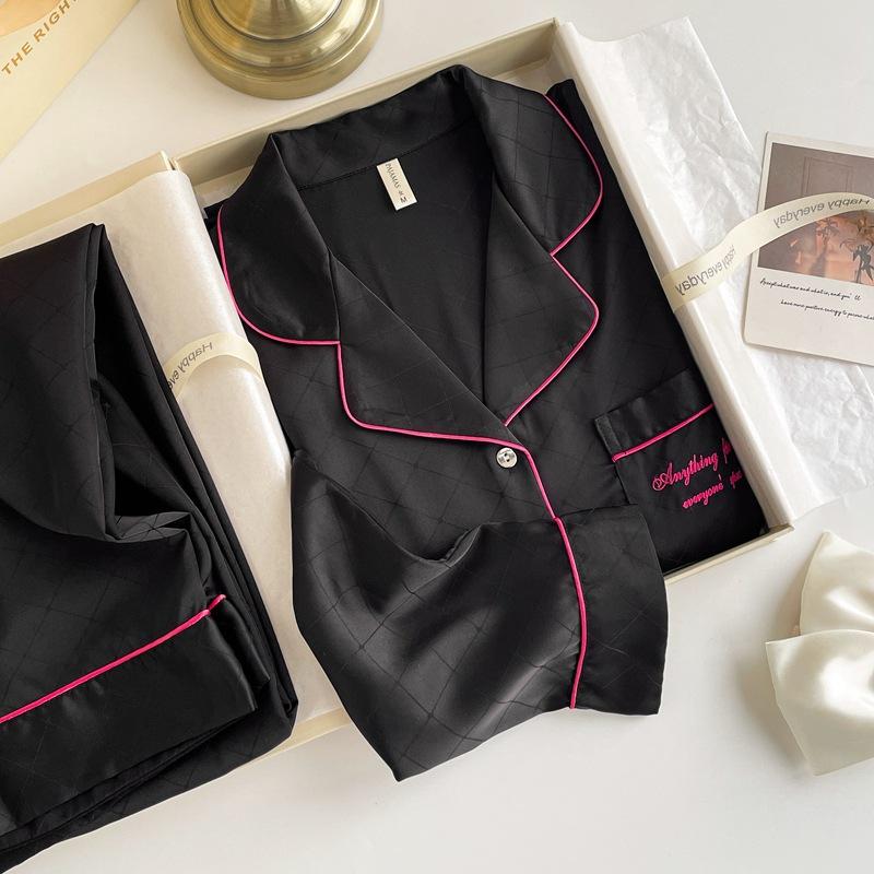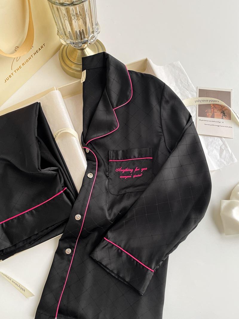 Pijama de color contrastante para mujer, primavera y otoño, seda de hielo, manga larga, fino, de alta gama, cárdigan negro, ropa de casa de seda, traje