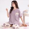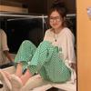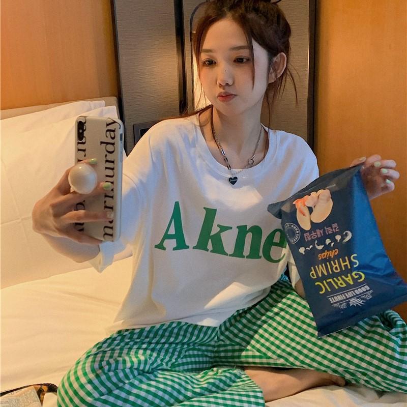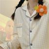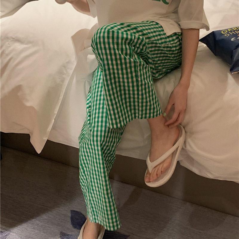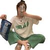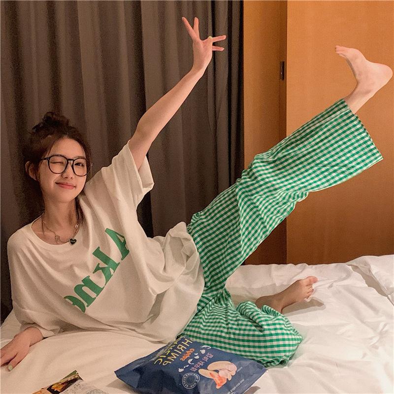Pijama de Traje de Cuadros Verdes para Mujer Nuevo Estilo Coreano Holgado Verano Top de Manga Corta Pantalones Casuales Conjunto de Dos Piezas