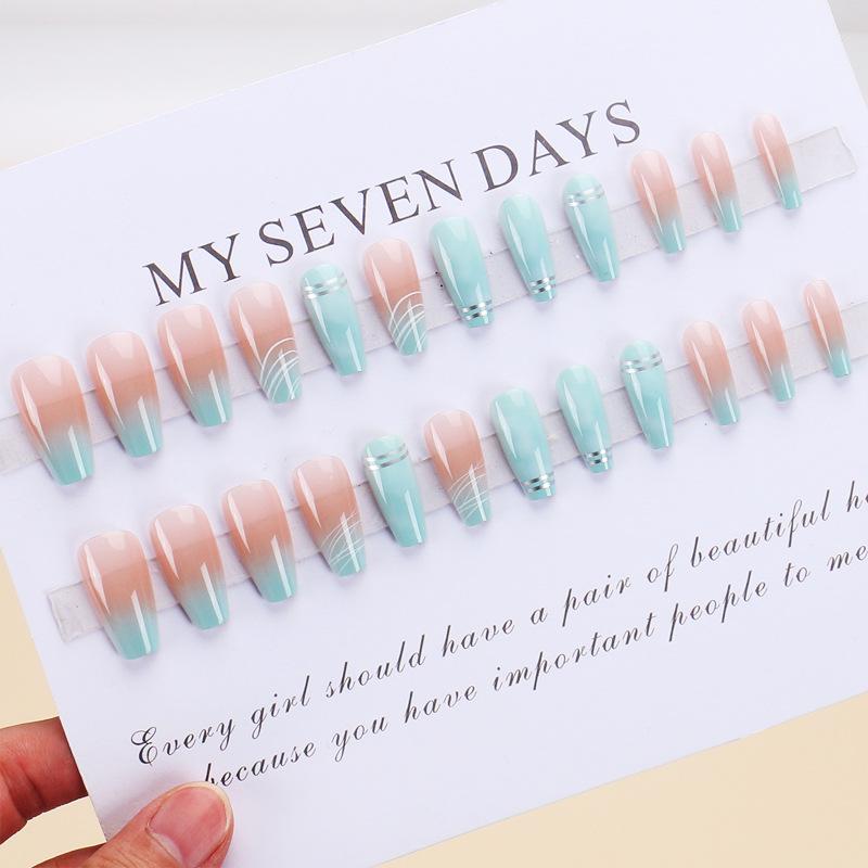Explosiones transfronterizas: Armadura con degradado, rayas de contraste, borde plateado, manicura, acabado largo, 24 uñas postizas.