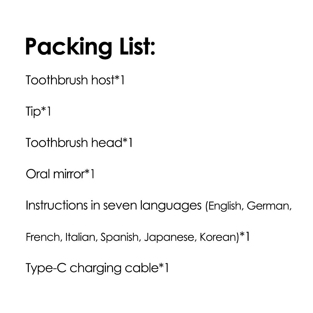 Lista de embalaje: Unidad principal del cepillo de dientes * 1, punta del cepillo de dientes * 1, cabezal del cepillo de dientes * 1, espejo bucal * 1, manual de instrucciones en siete idiomas (inglés, alemán, francés, italiano, español, japonés, coreano) * 1, cable de carga tipo C * 1.