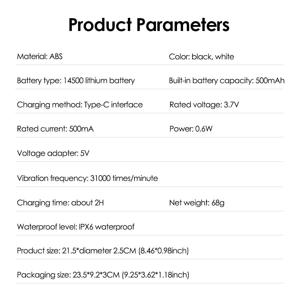 Corriente nominal: 500 mA, potencia: 0,6 W, adaptación de voltaje: 5 V, frecuencia de vibración: 31000 veces/minuto, tiempo de carga: aproximadamente 2 H, nivel de impermeabilidad: IPX6 a prueba de agua, protección del temporizador de 10 minutos.