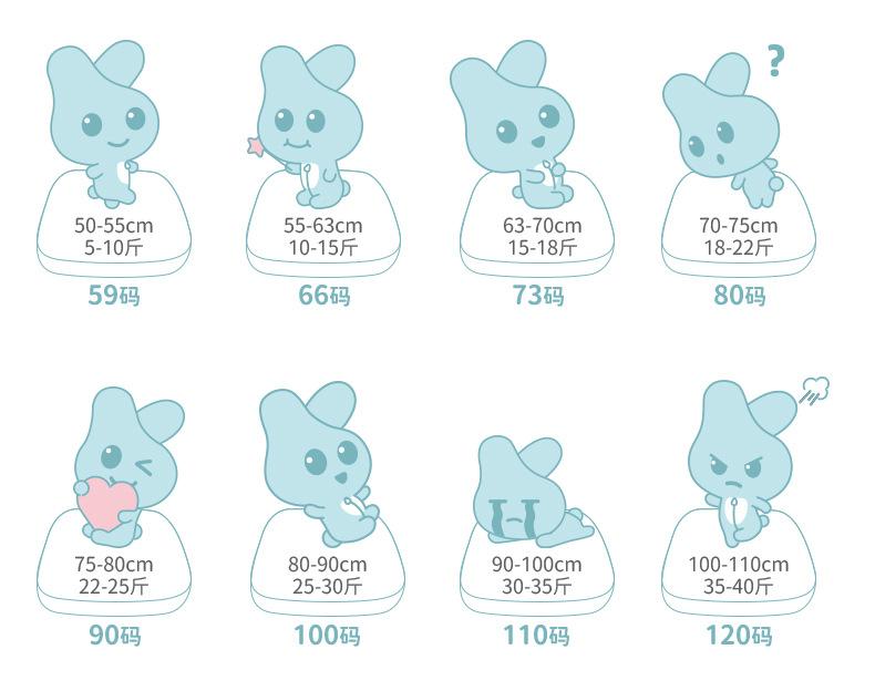 66/44(59-66cm), 73/48(66-73cm), 80/48(73-80cm), 90/52(80-90cm), 100/56(90-100cm), 110/58(100-110cm)