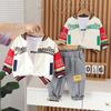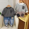 Traje infantil de otoño, nuevo polo informal a rayas con jeans, estilo infantil moderno, traje de dos piezas de manga larga para niño de algodón
