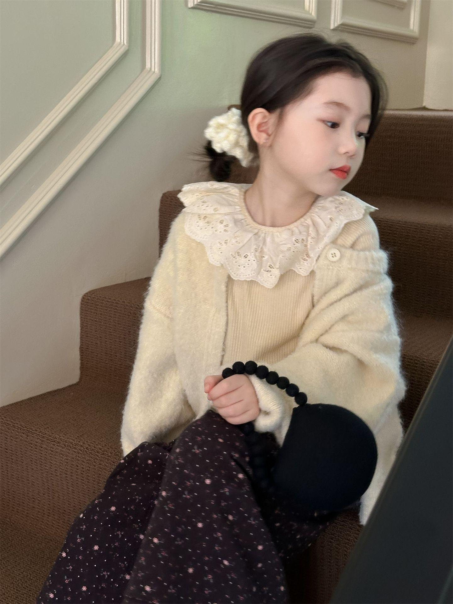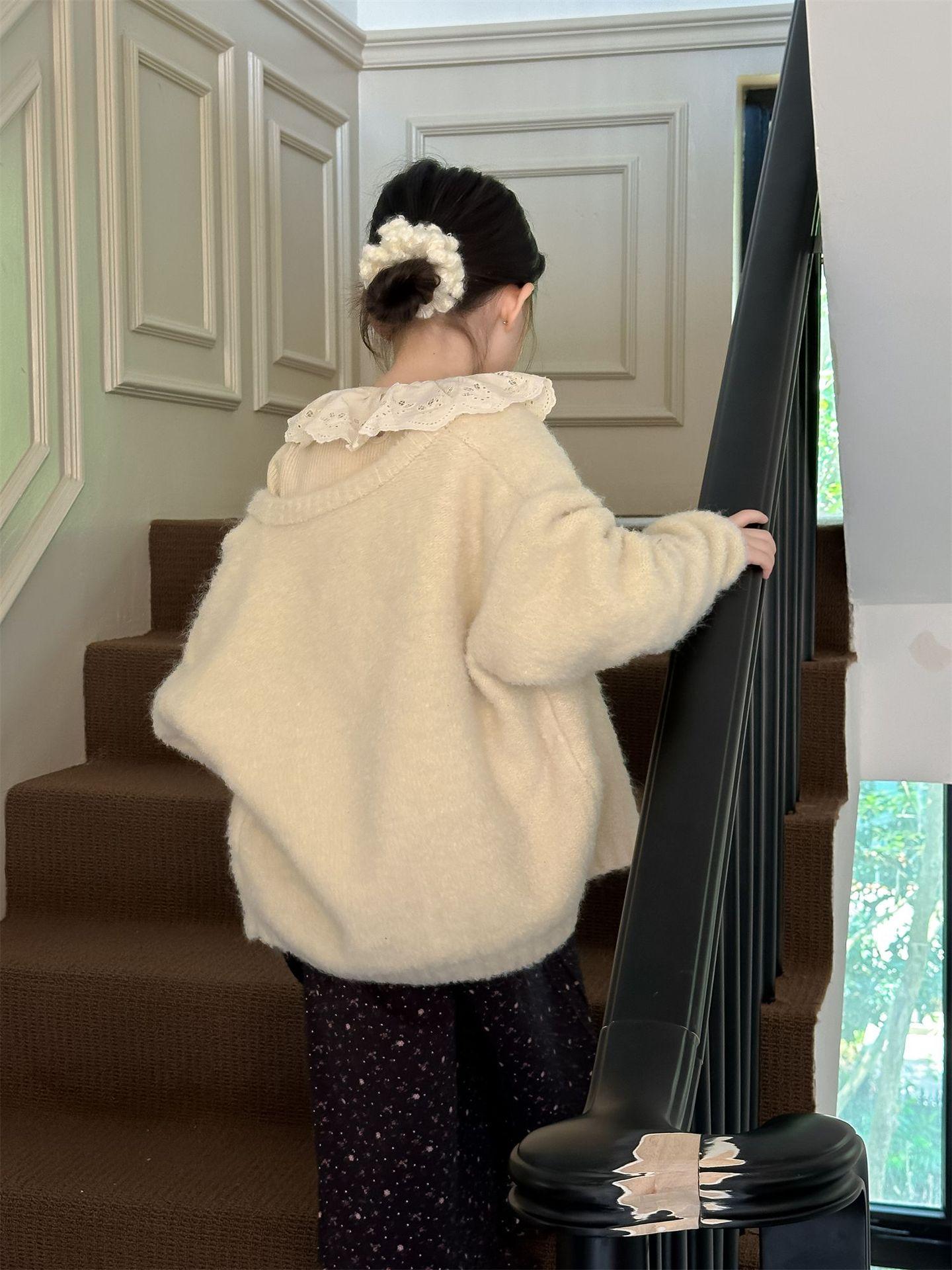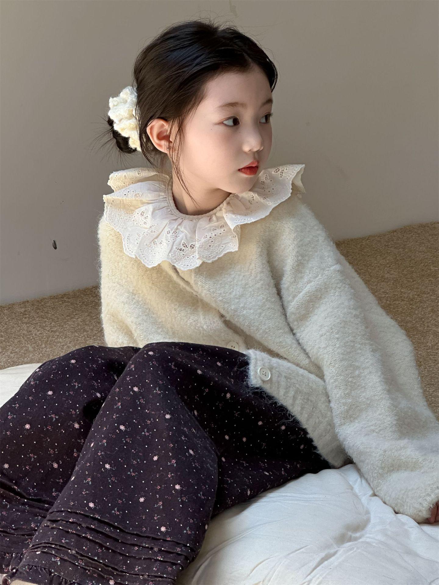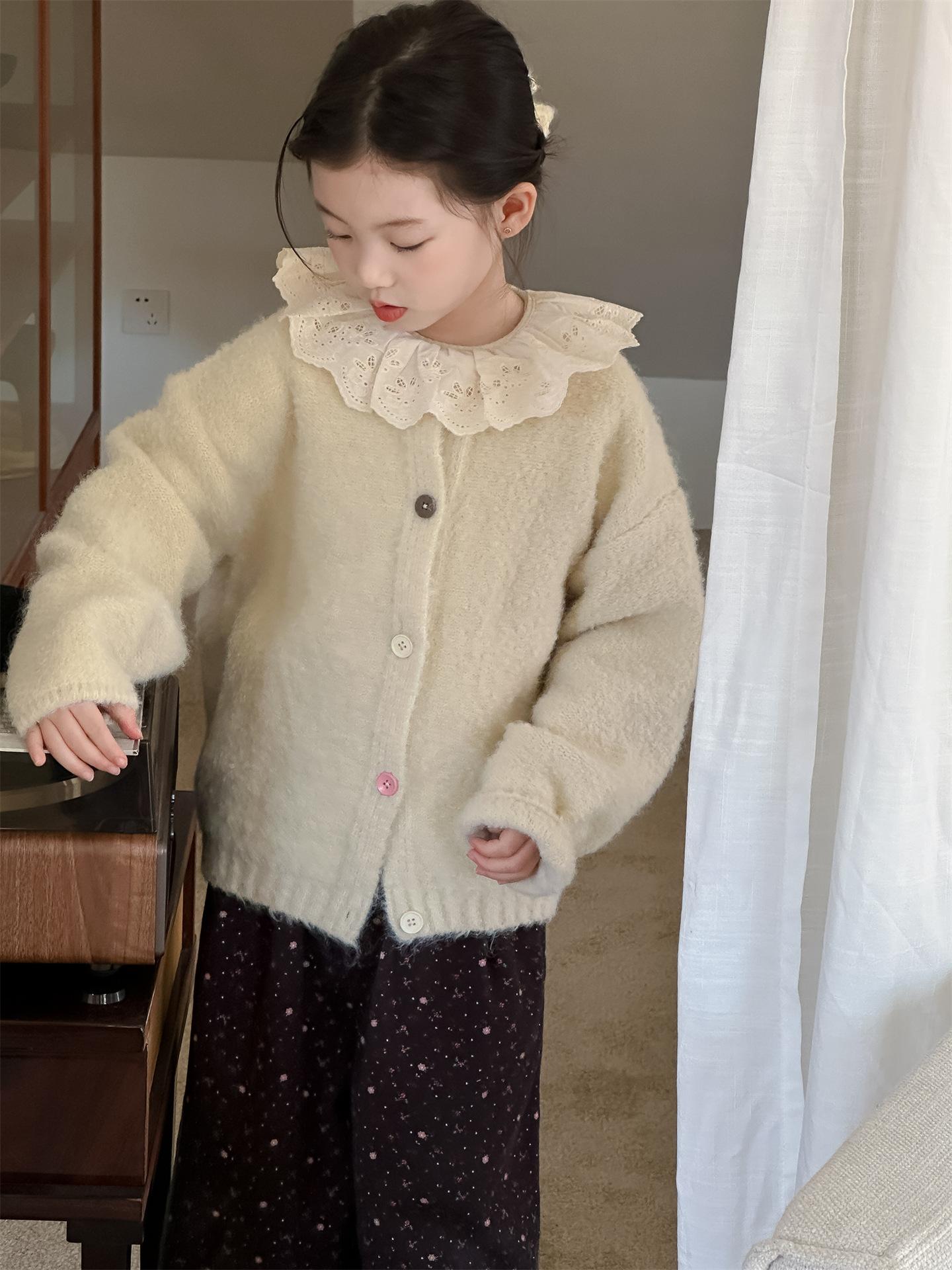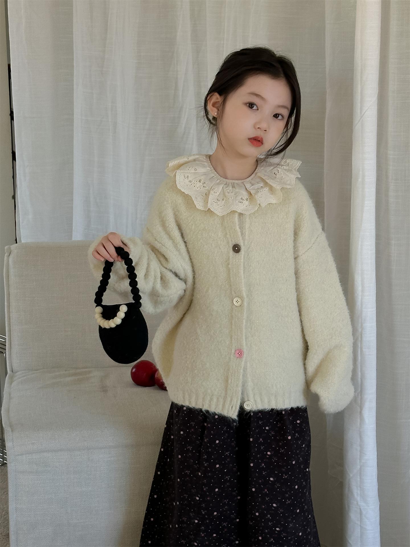 Flor y Ropa Infantil de Aspecto Cárdigan de Mohair para Niñas Otoño 2024 Nuevo Estilo Coreano Suéter Suave y Ceroso para Niños Bebés