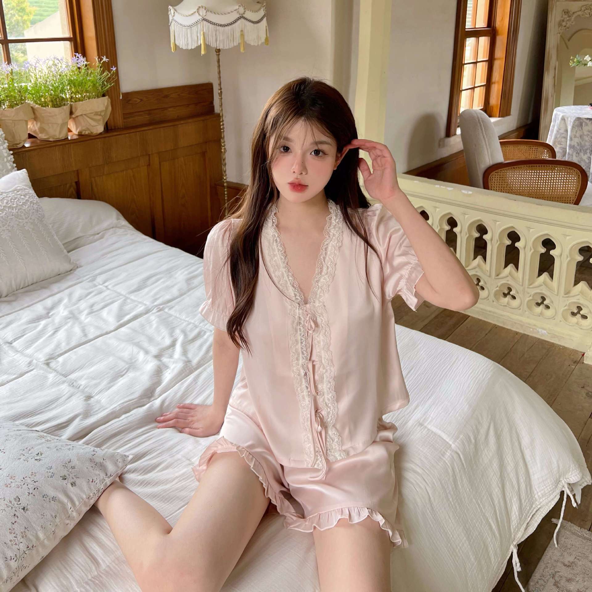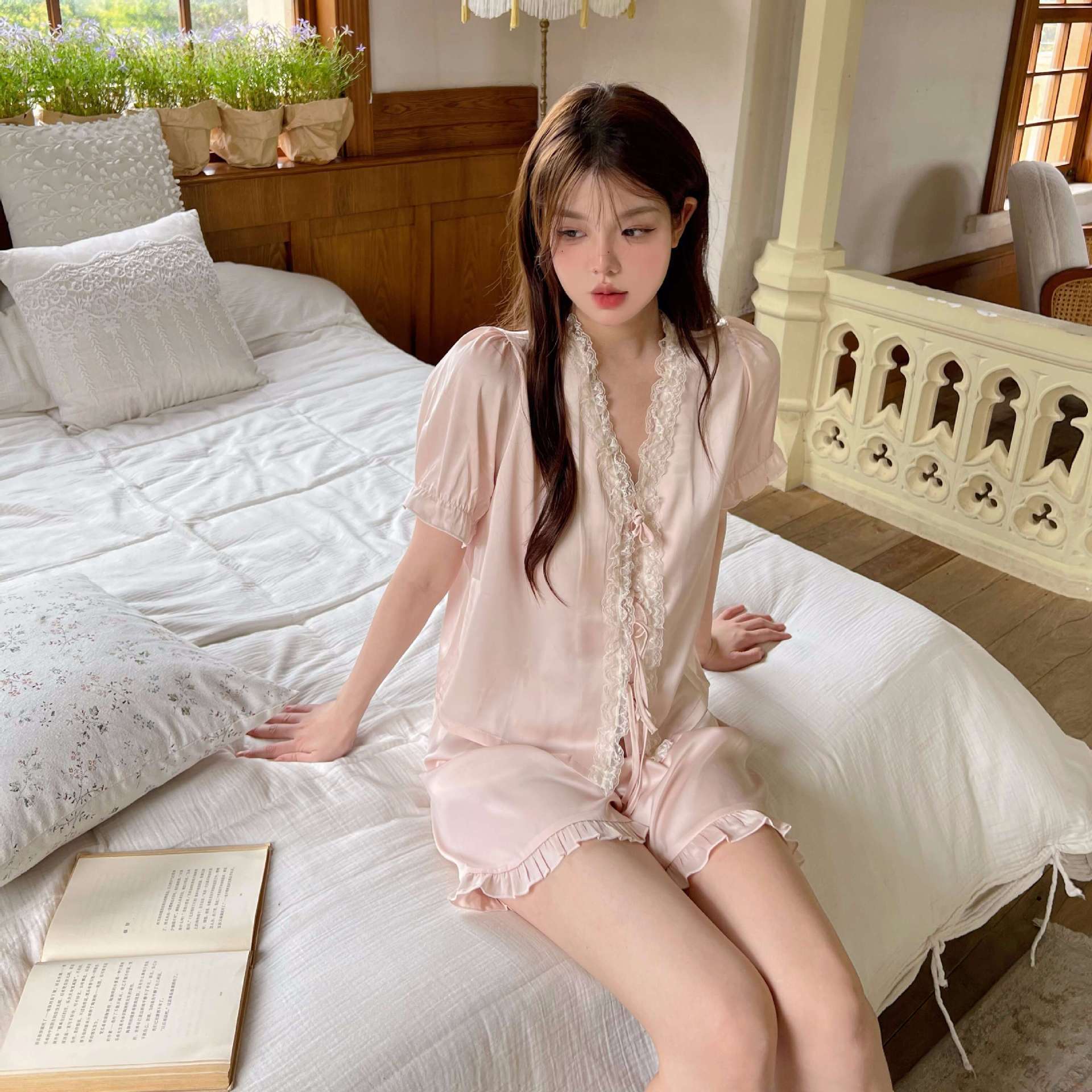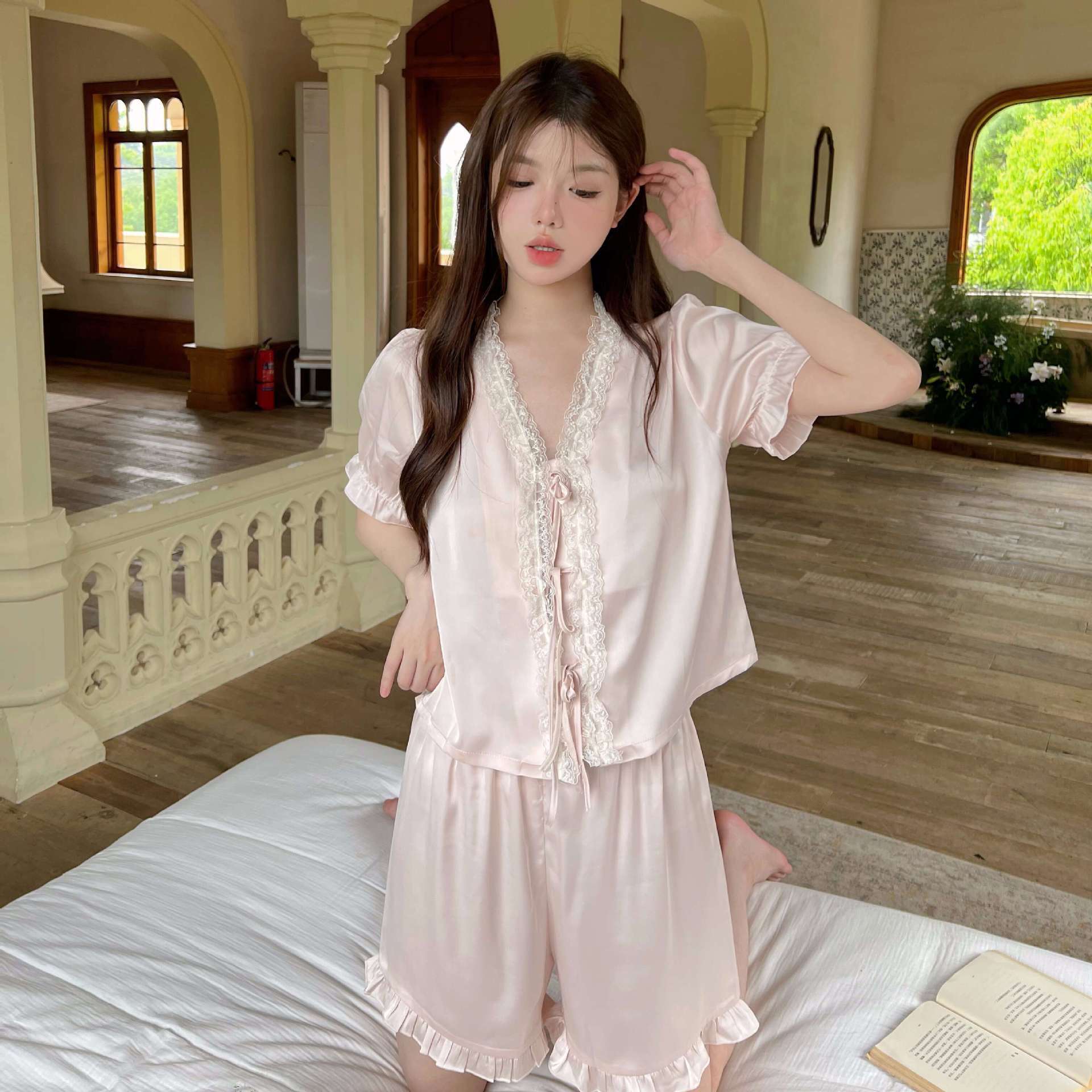 Pijamas de seda de hielo para mujer, ropa de dormir fina de verano con encaje dulce, de manga corta, para el hogar, 2024