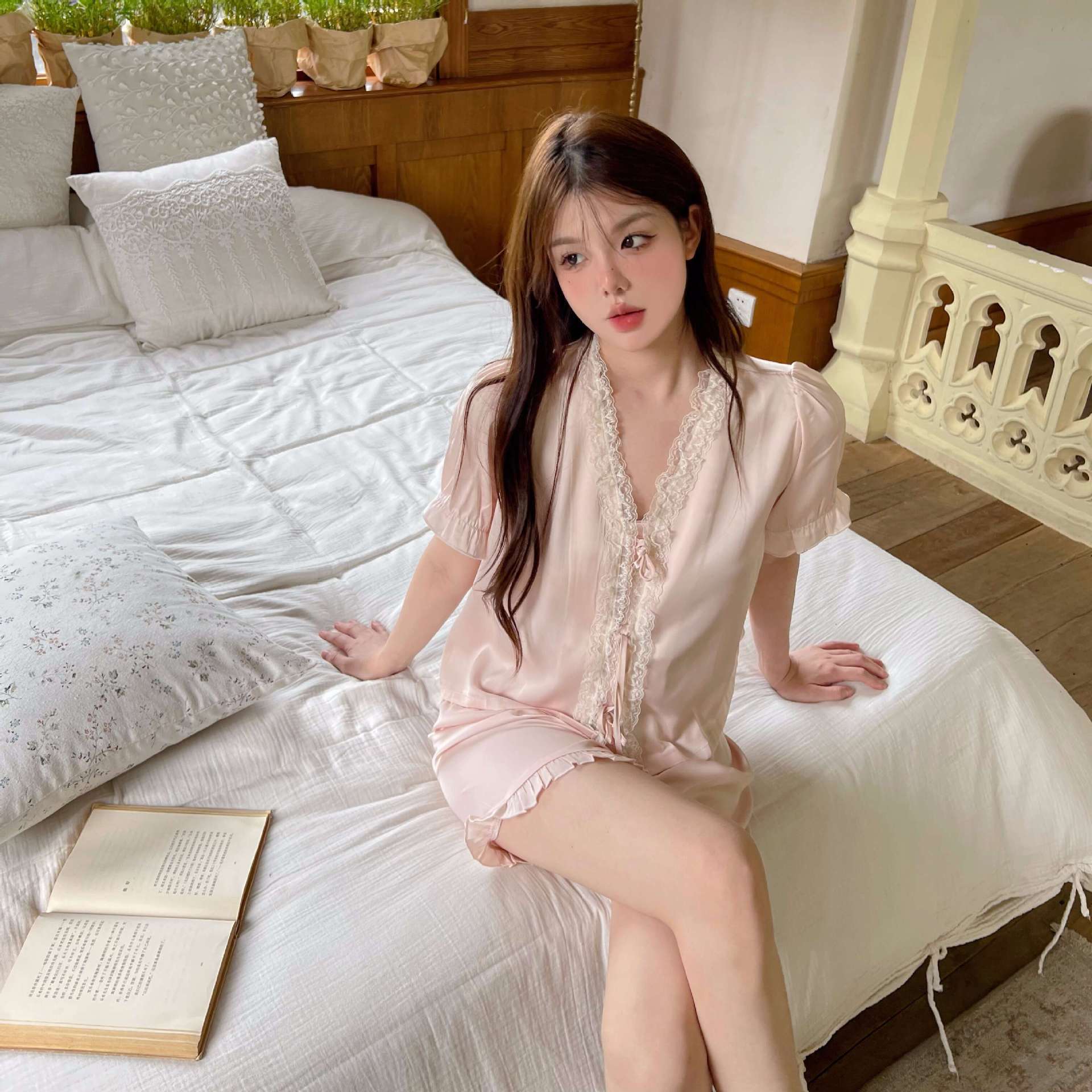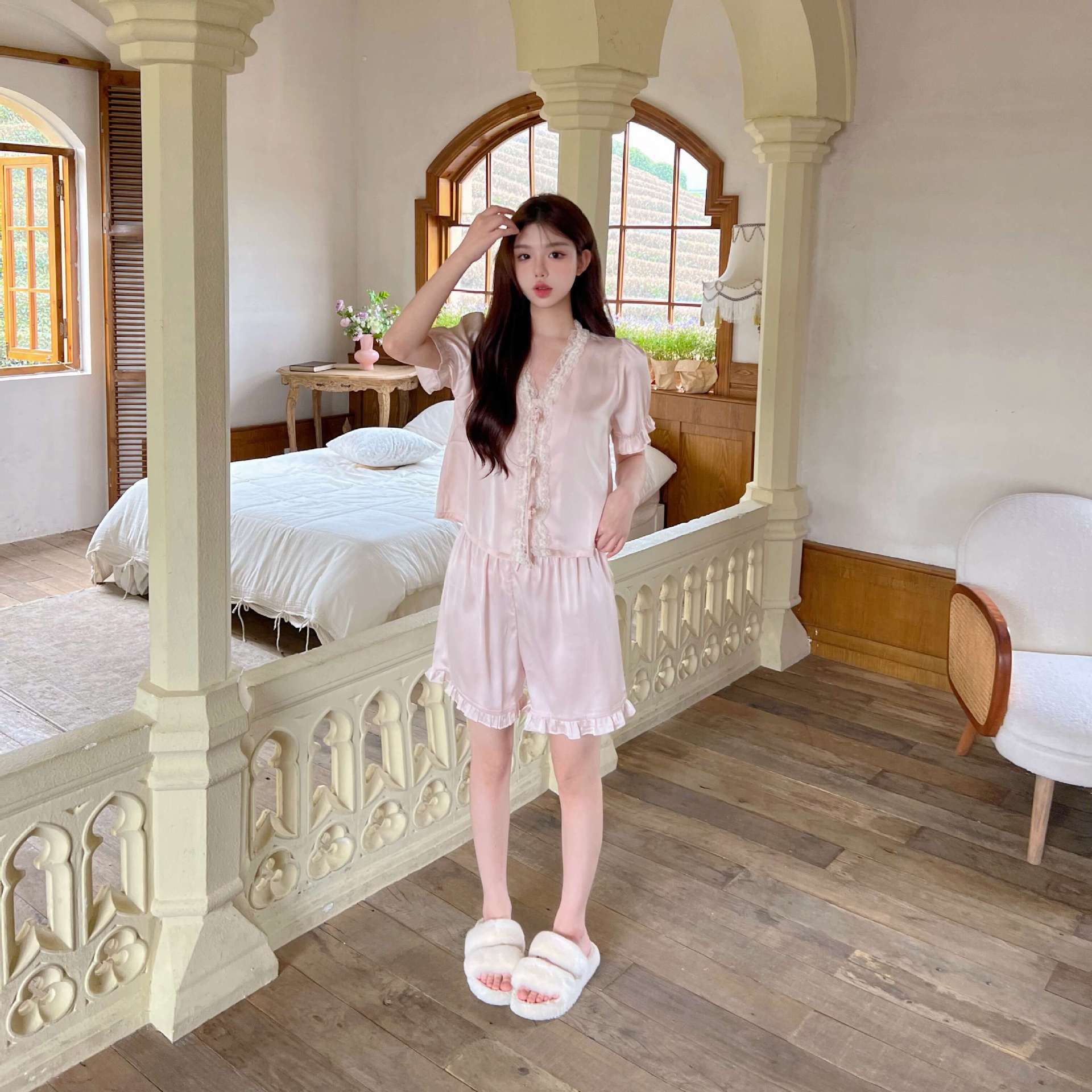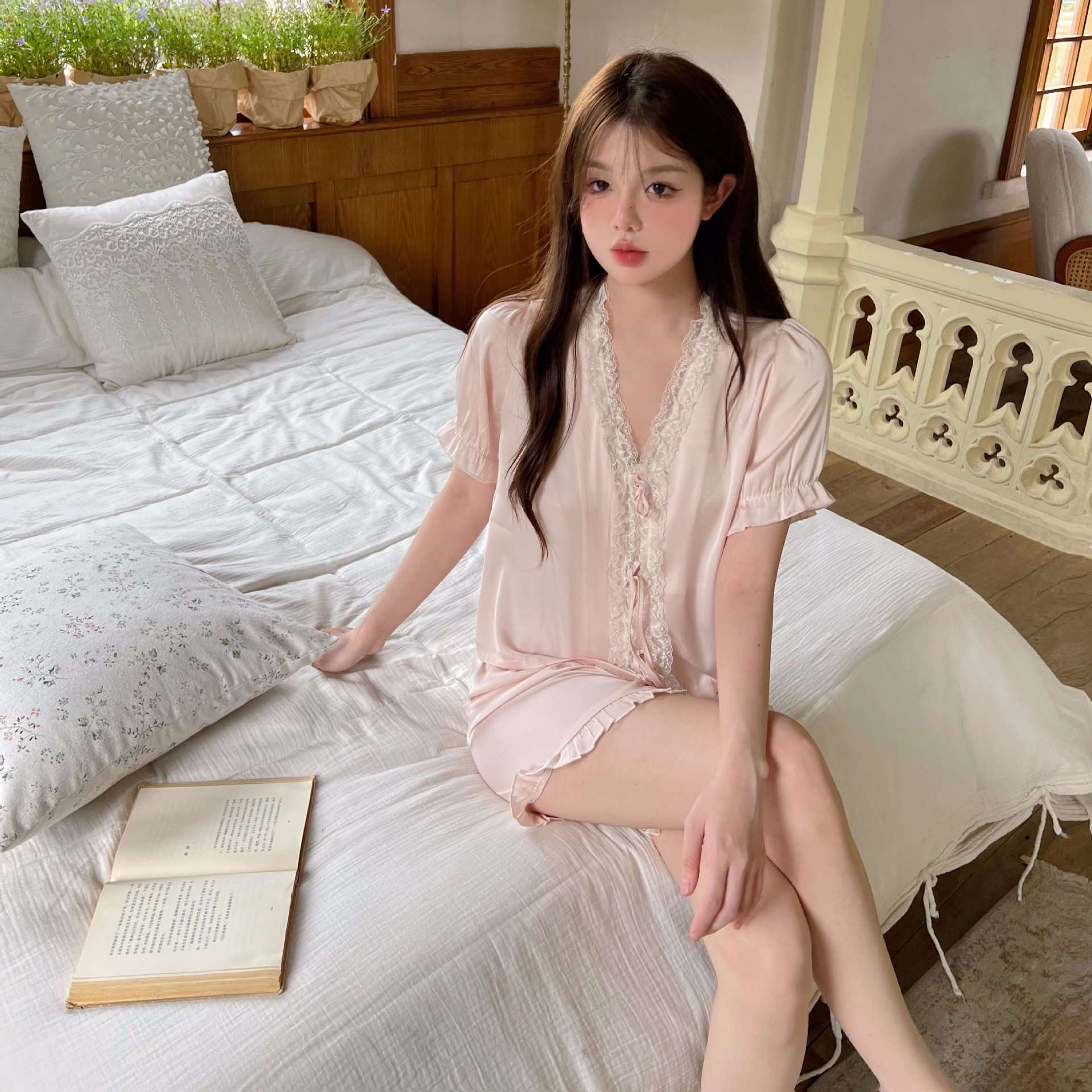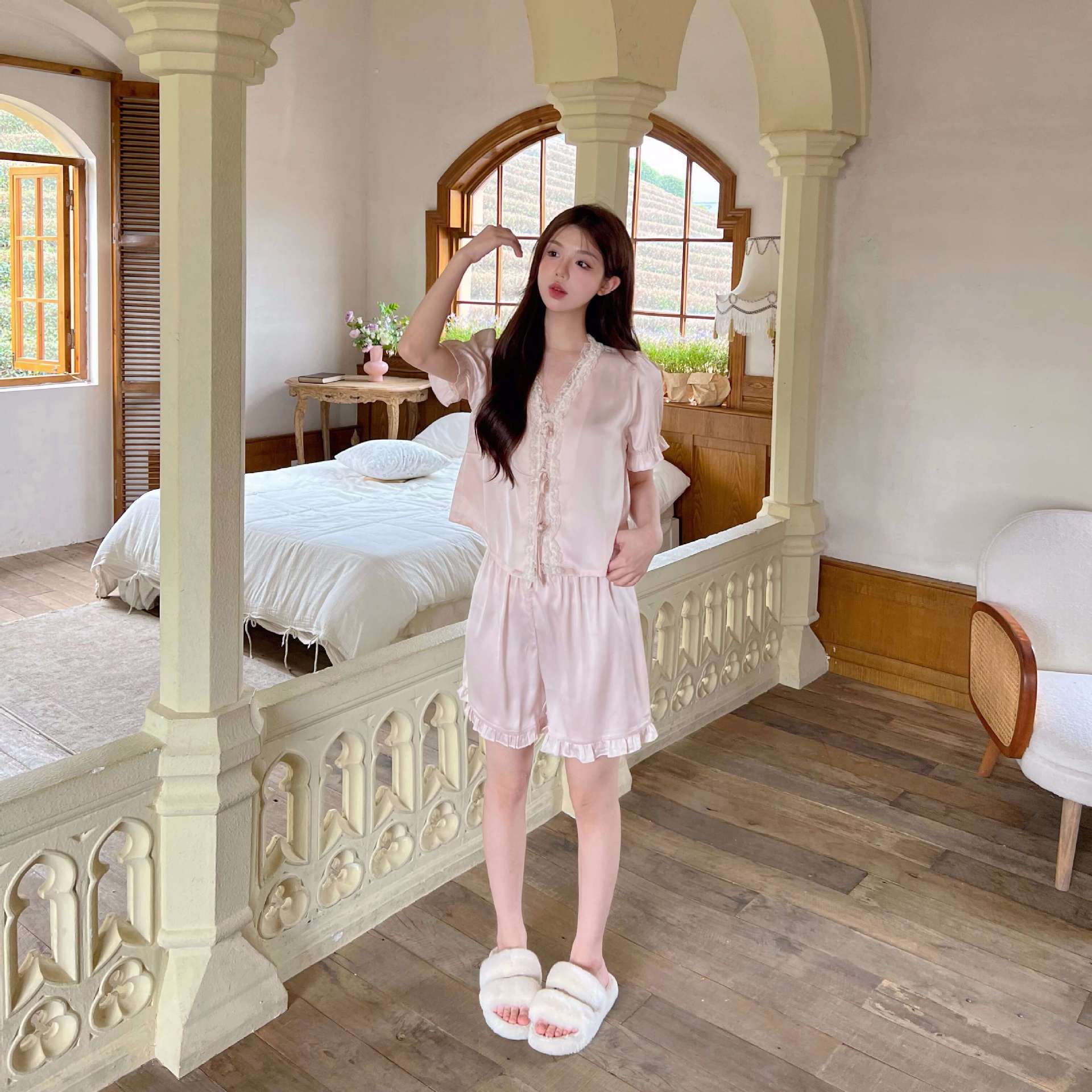 Pijamas de seda de hielo para mujer, ropa de dormir fina de verano con encaje dulce, de manga corta, para el hogar, 2024