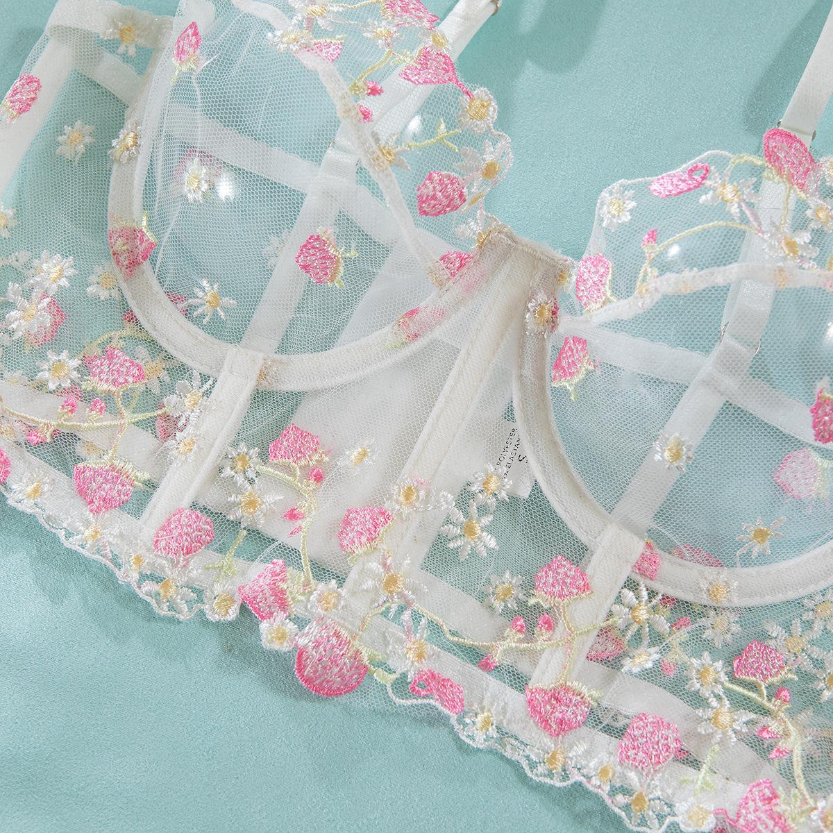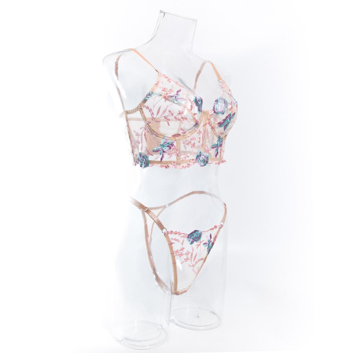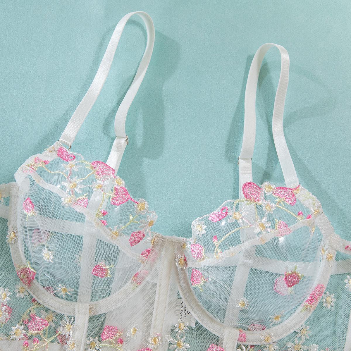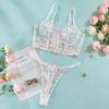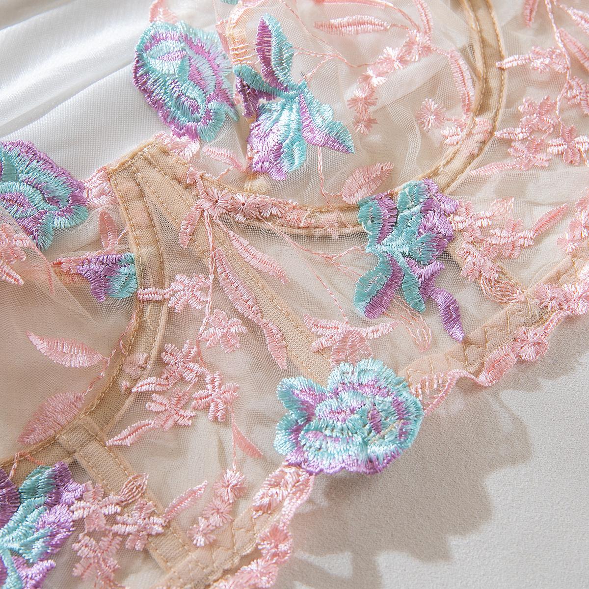 Lencería Sexy Malla Transparente Bordada Flor Multicolor Ballena Pequeño Chaleco Aro de Acero Push-up Bra Set de Dos Piezas