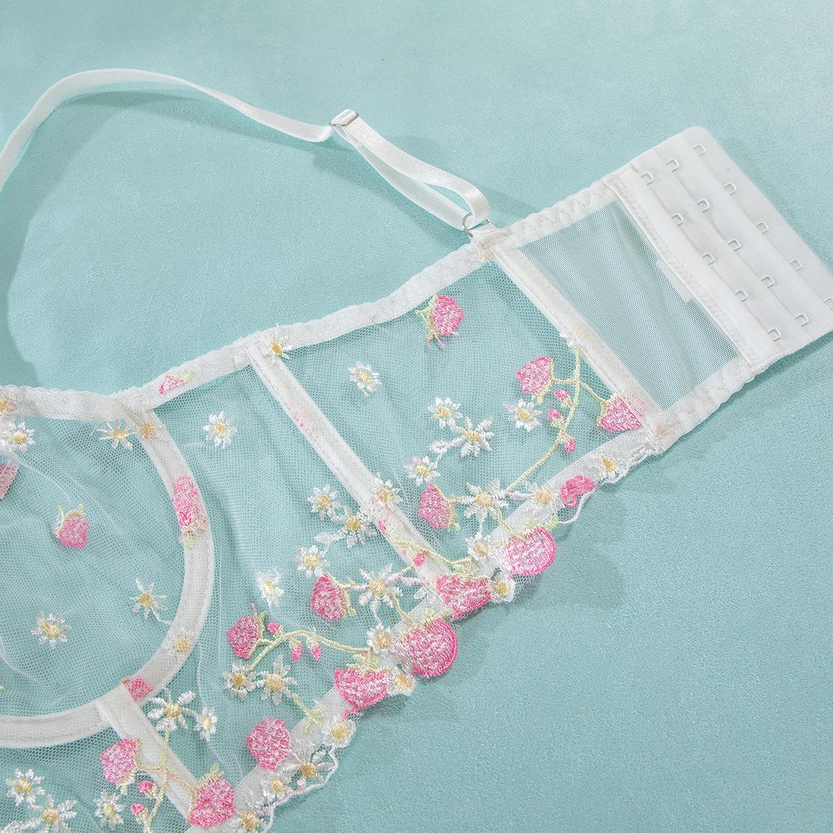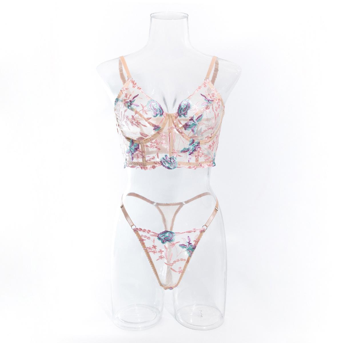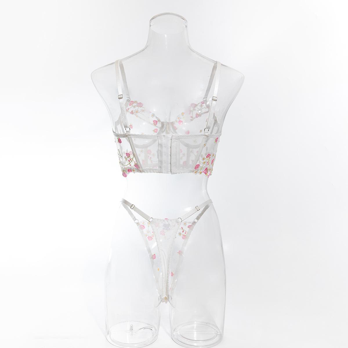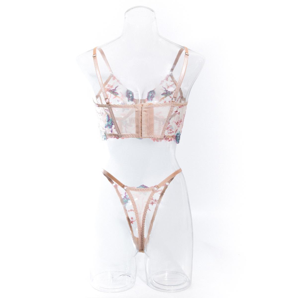 Lencería Sexy Malla Transparente Bordada Flor Multicolor Ballena Pequeño Chaleco Aro de Acero Push-up Bra Set de Dos Piezas