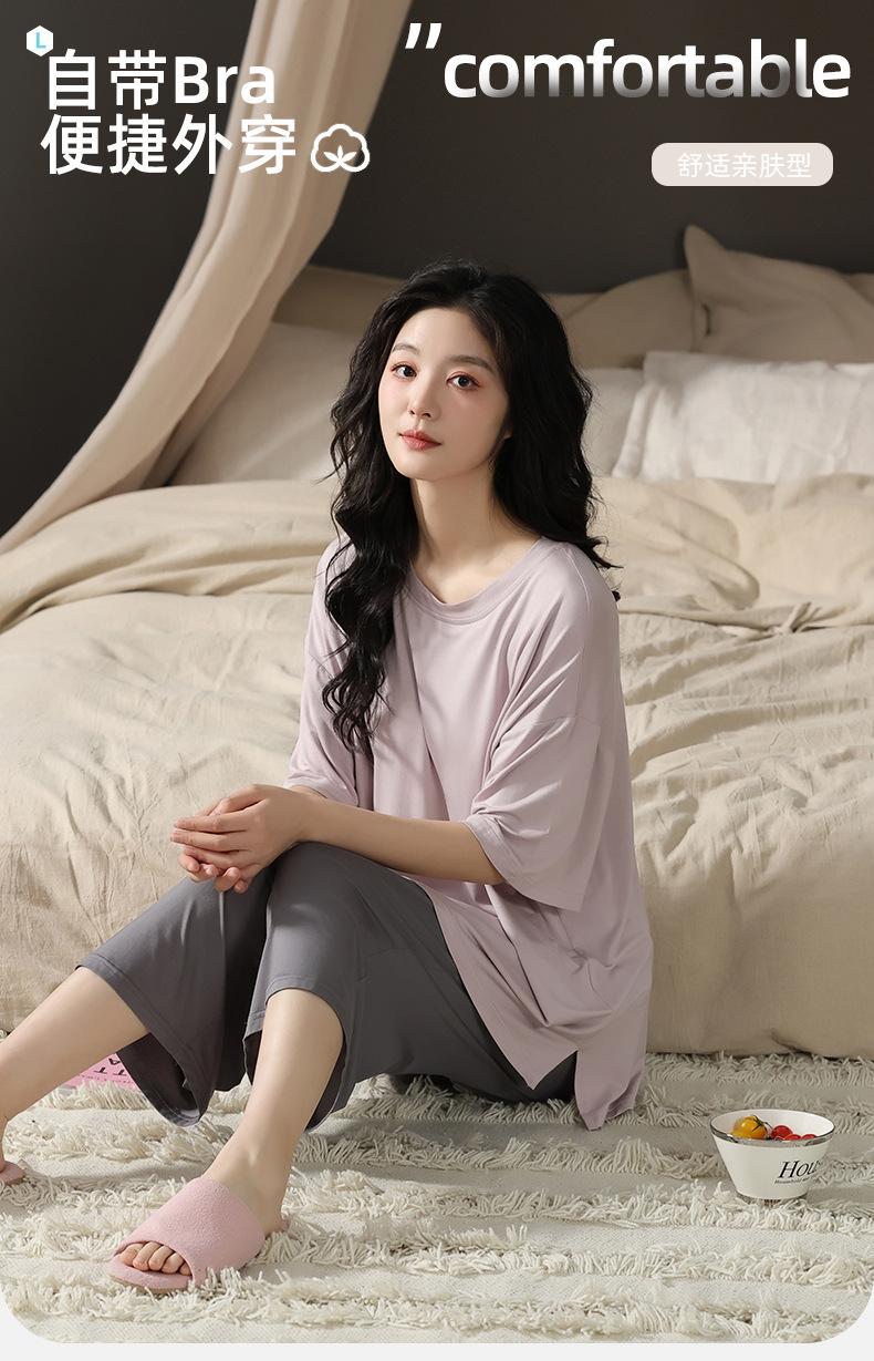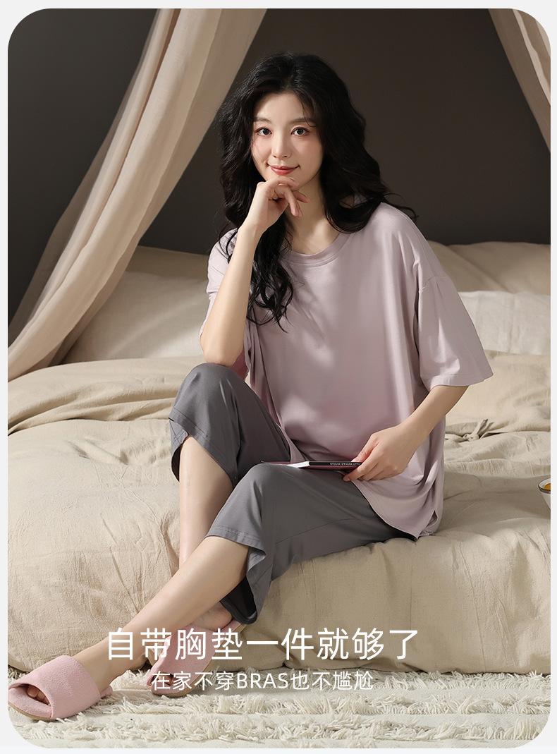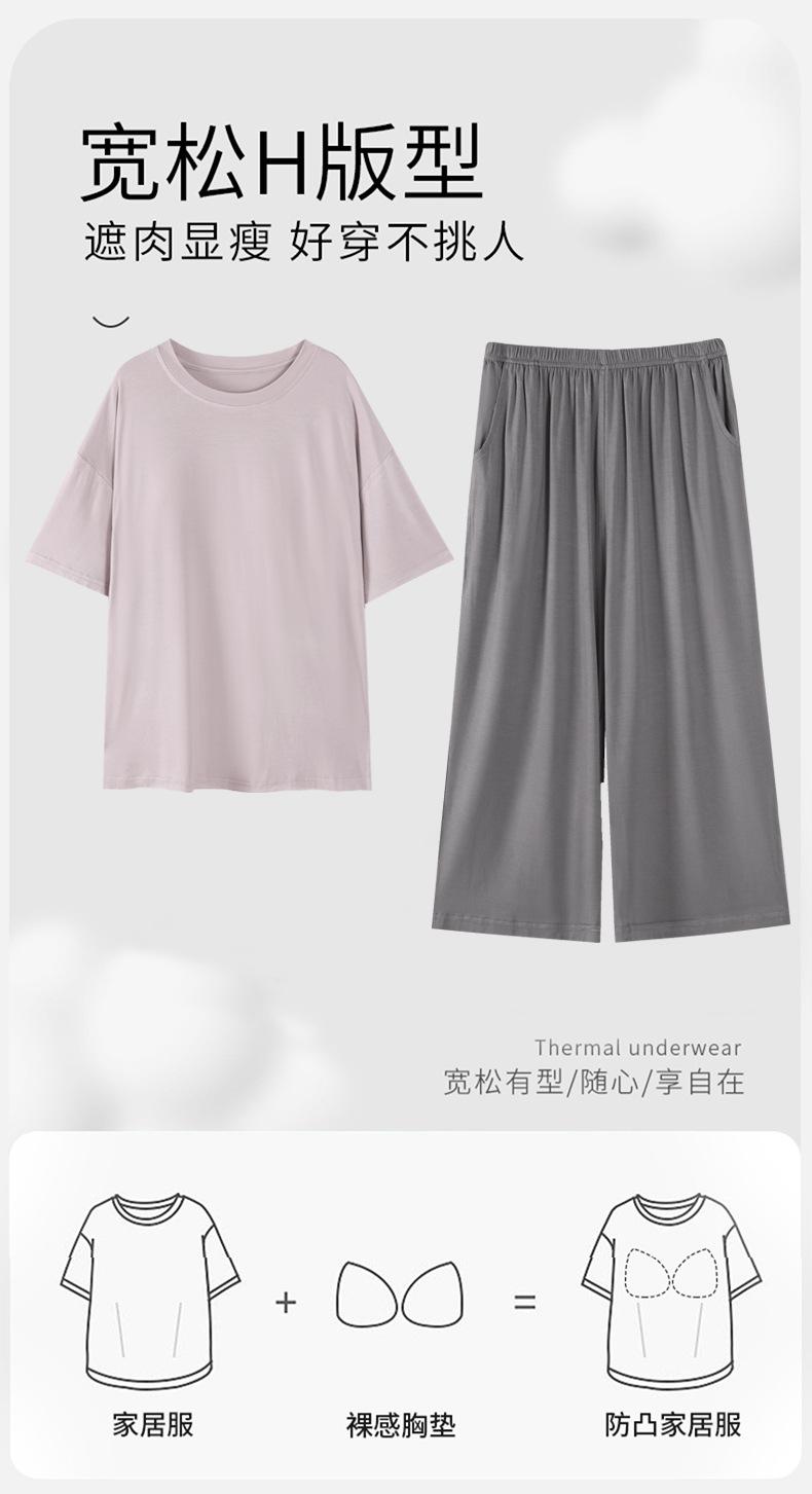 Pijama de modal con almohadilla para el pecho para mujer, pantalón capri fino de verano de manga corta, ropa informal sencilla de color liso para el hogar