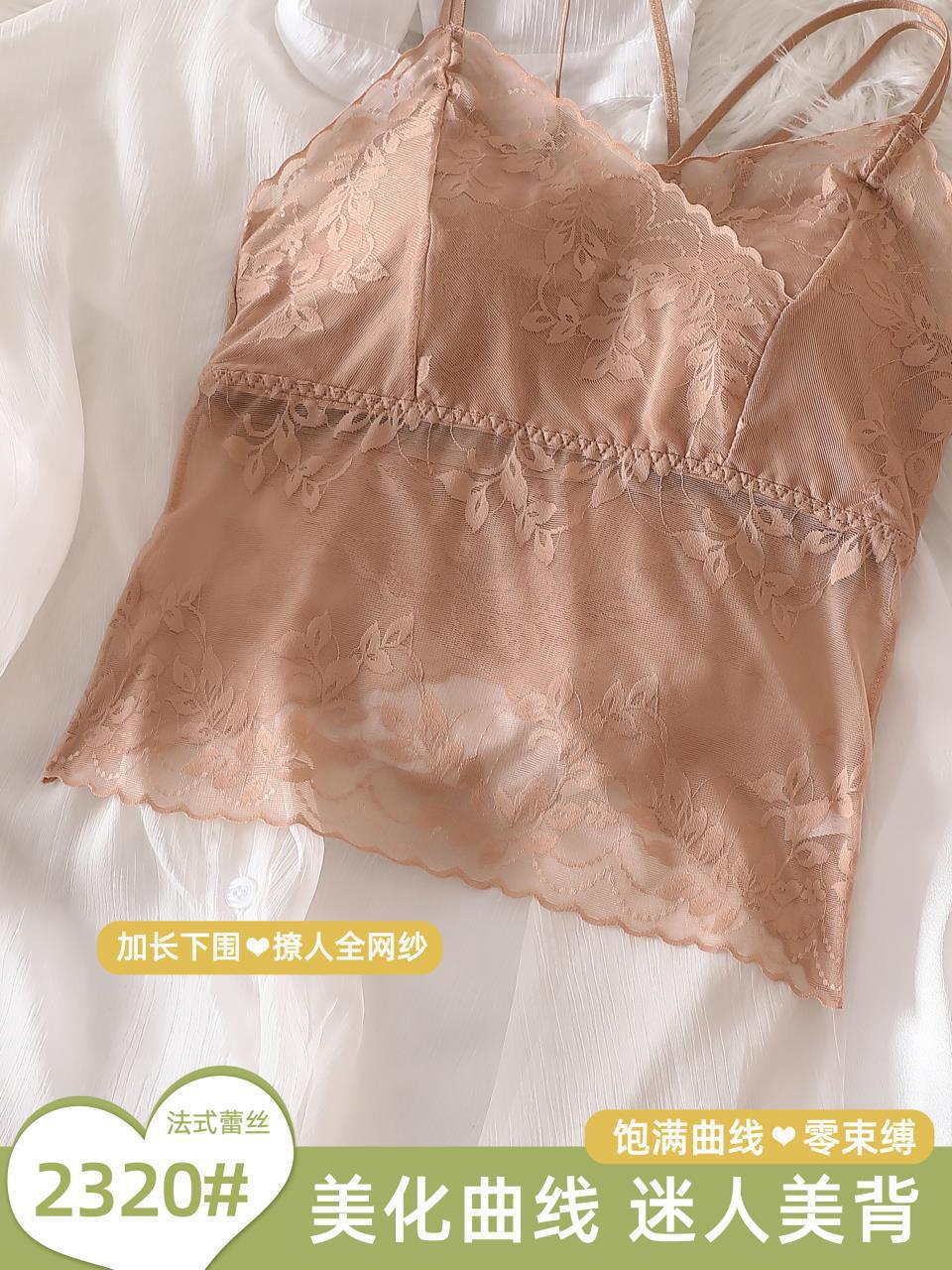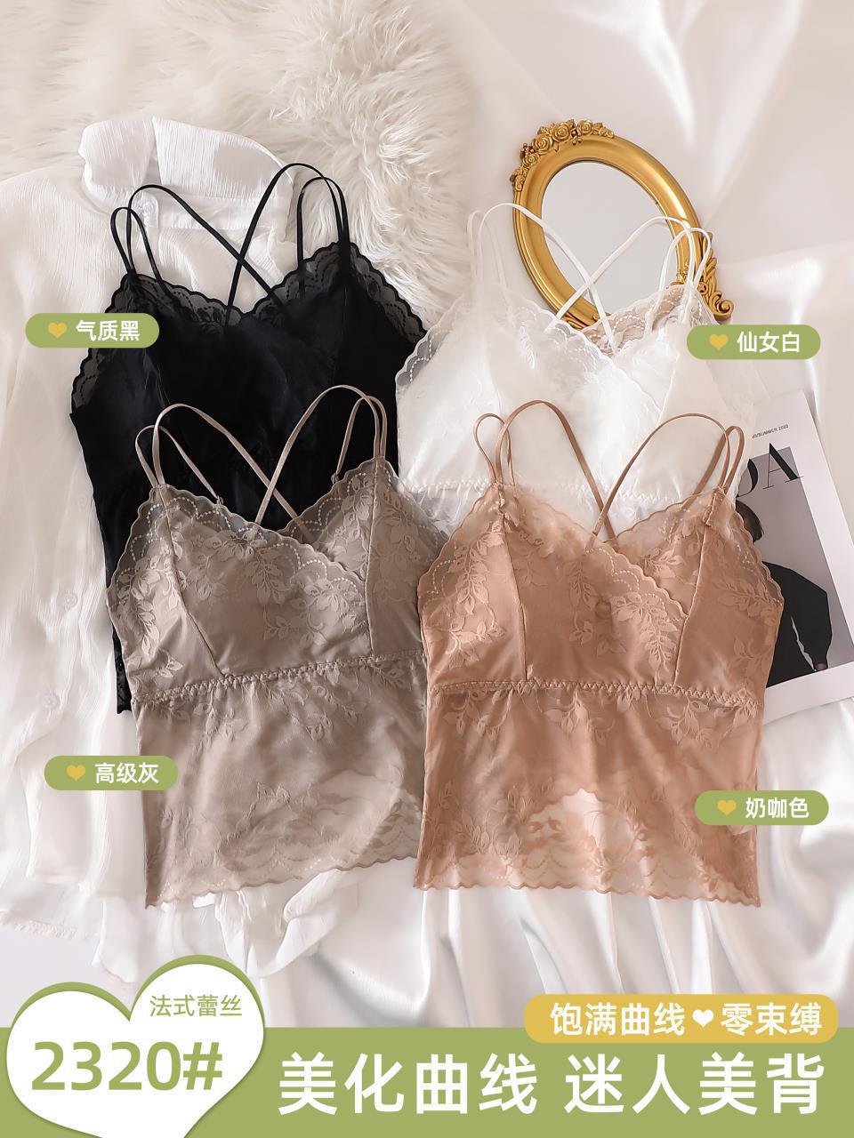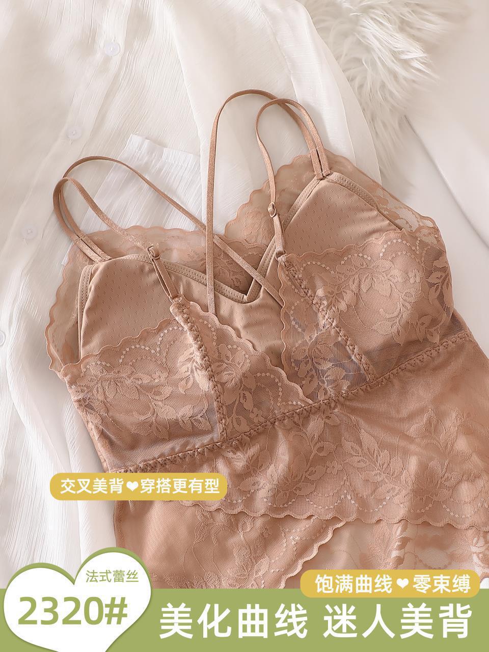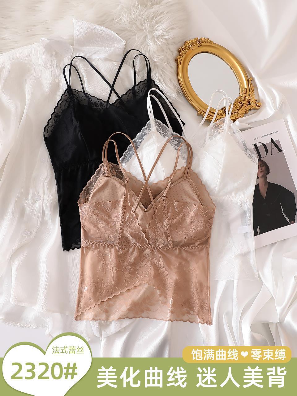 Chaleco exterior push-up con tirantes finos de encaje sexy de estilo francés, pequeño cabestrillo cruzado con hermosa espalda extraíble.