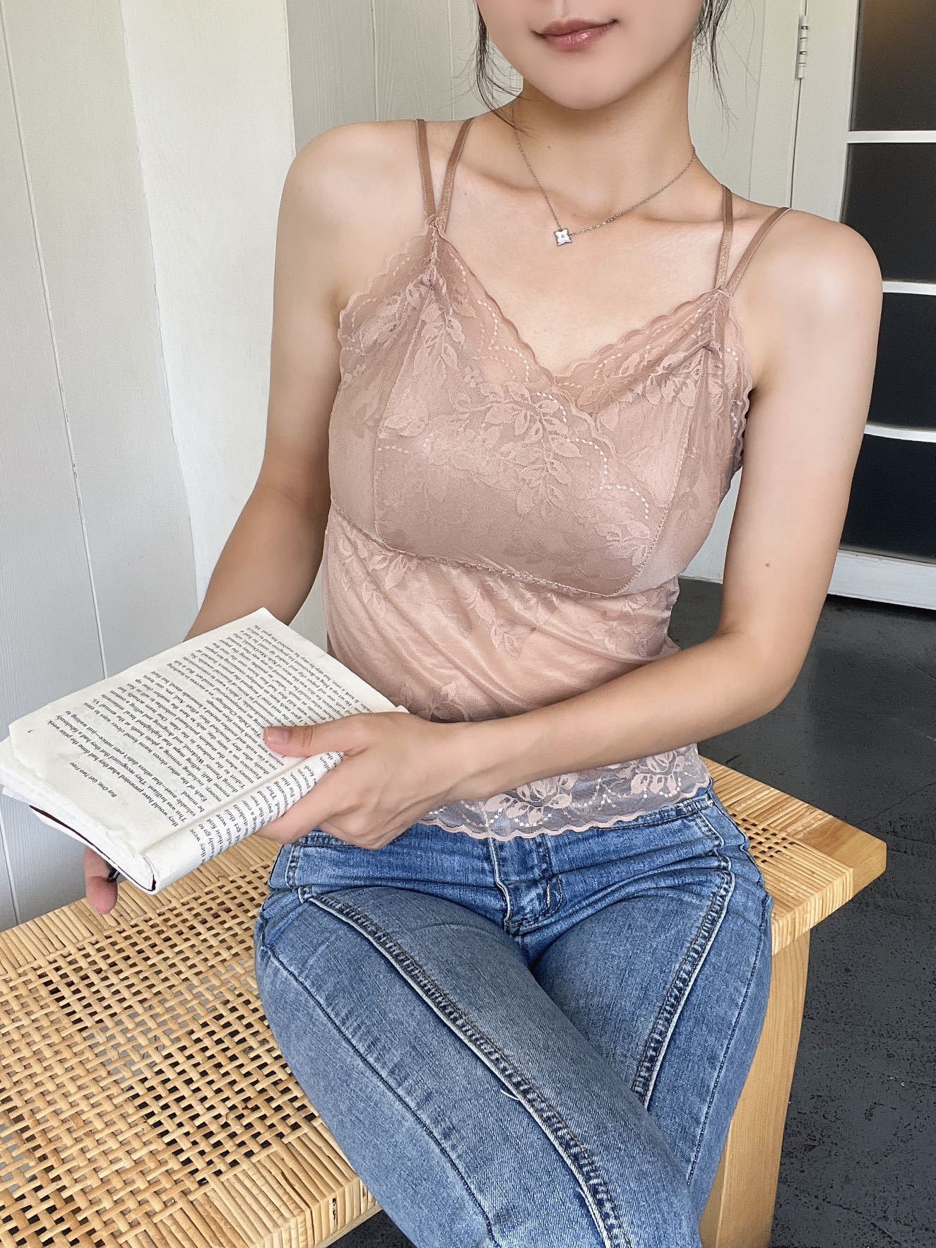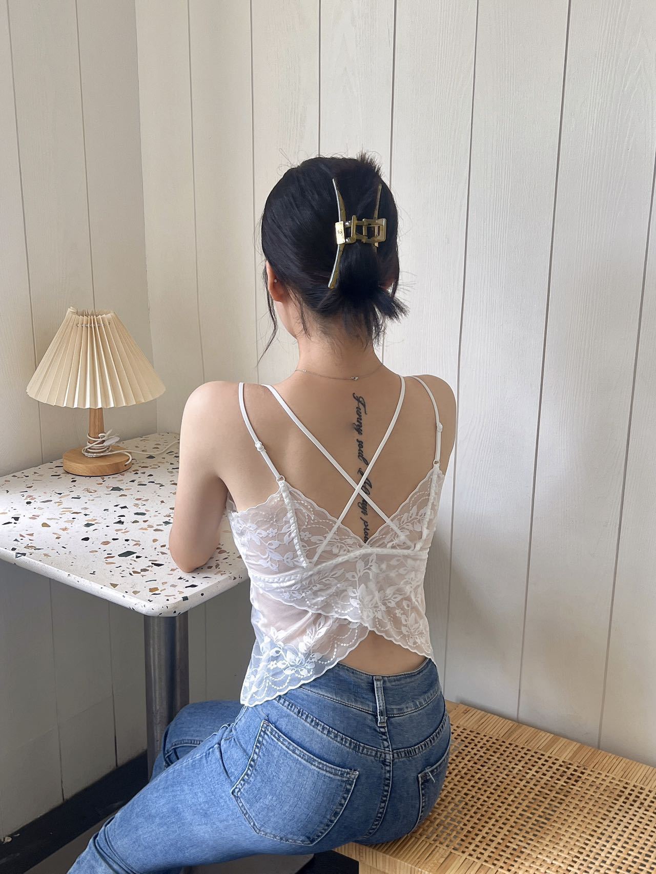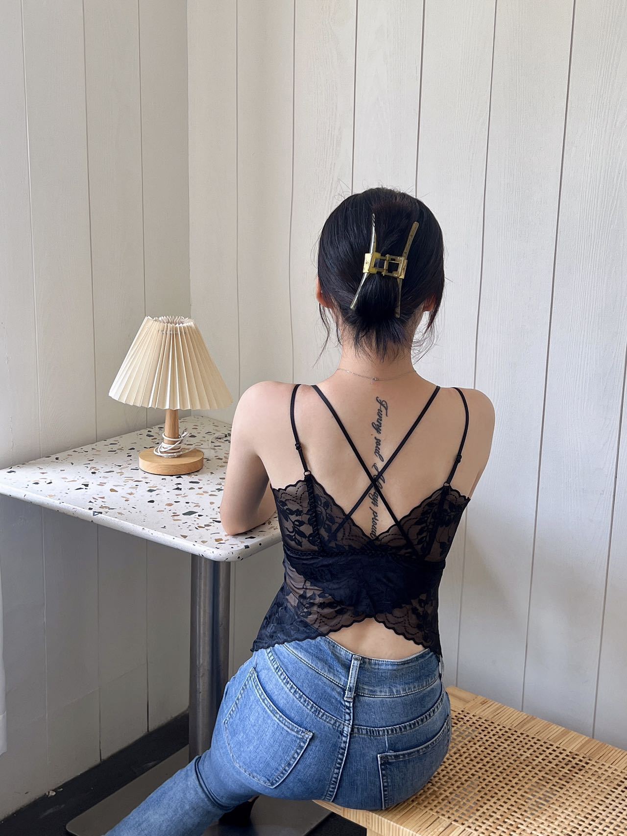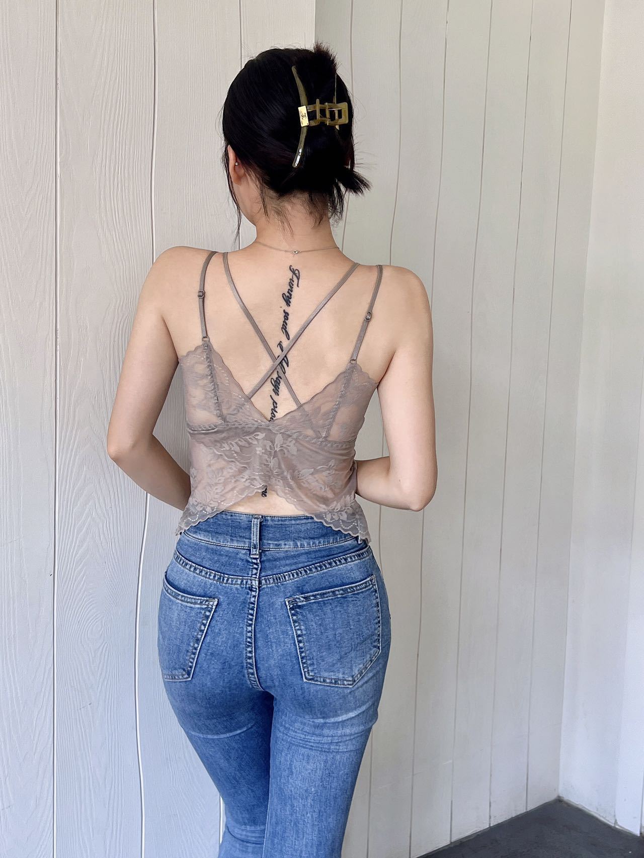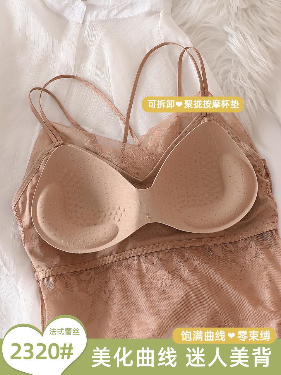 Chaleco exterior push-up con tirantes finos de encaje sexy de estilo francés, pequeño cabestrillo cruzado con hermosa espalda extraíble.