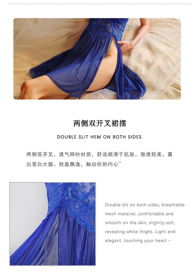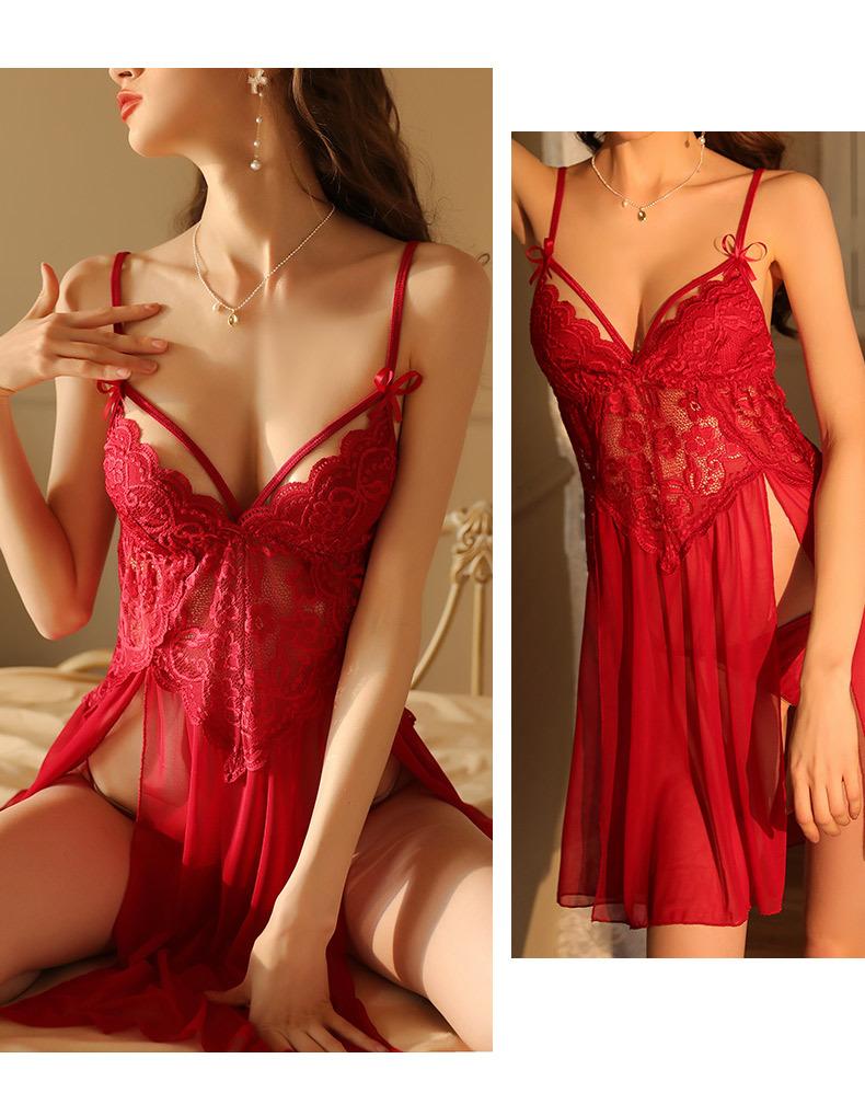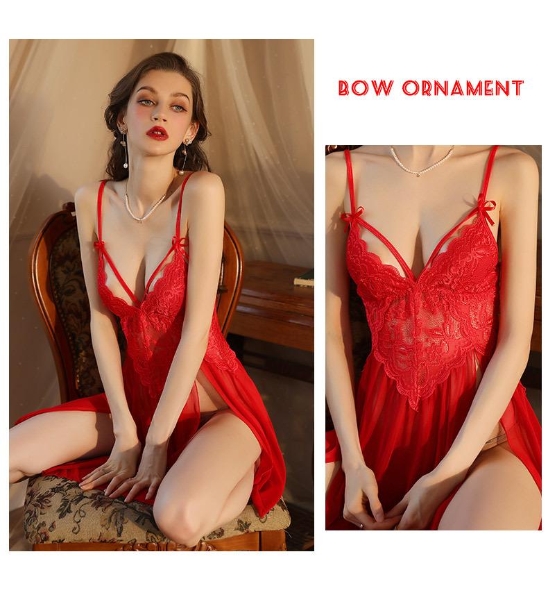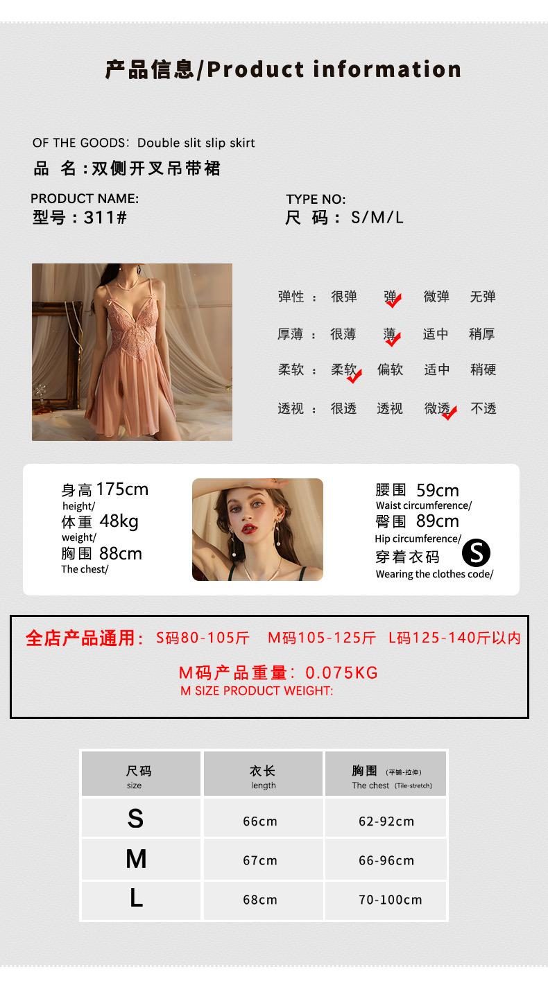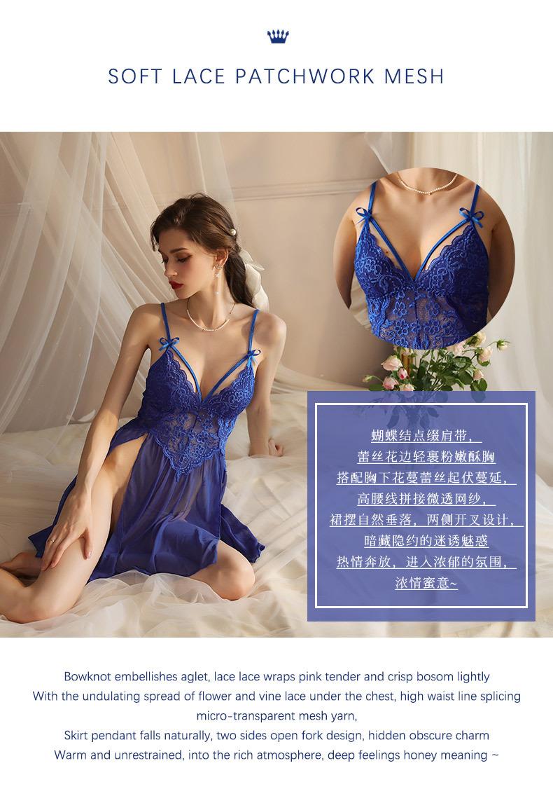 Nuevo Pijama Sexy de Malla con Encaje de Escote en V Profundo Falda con Tirantes y Abertura Lateral Tentación Ropa de Casa Camisón Traje de Mujer 311