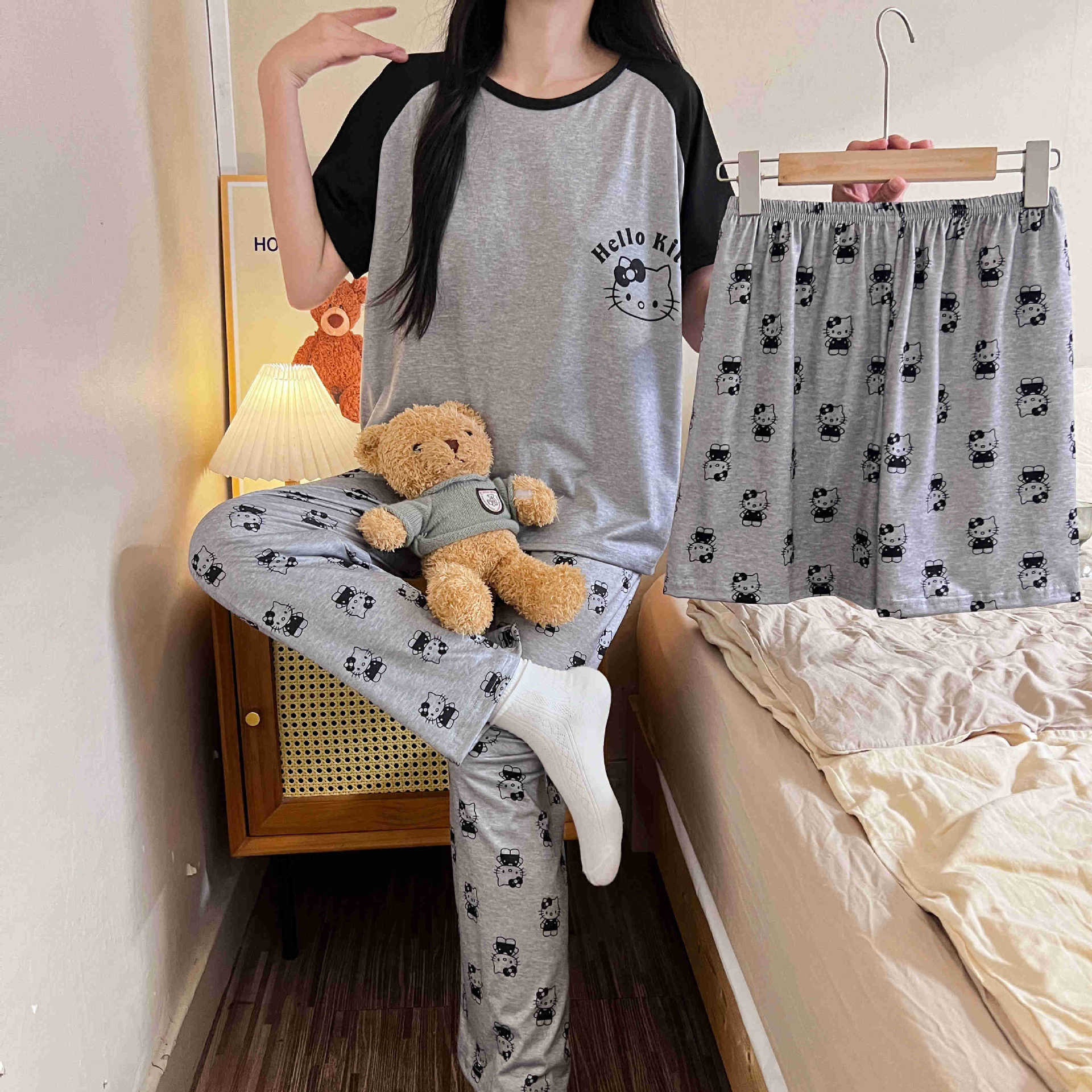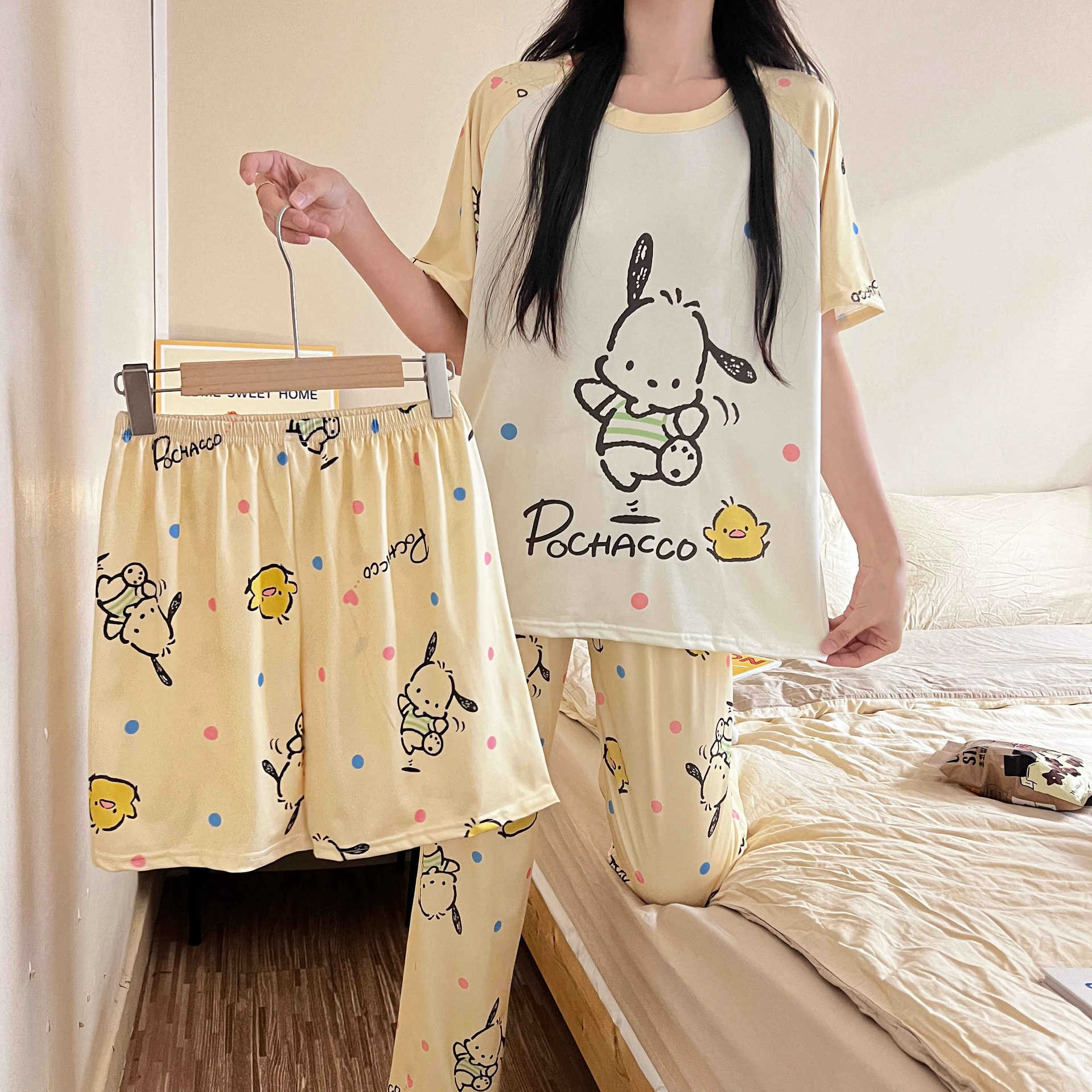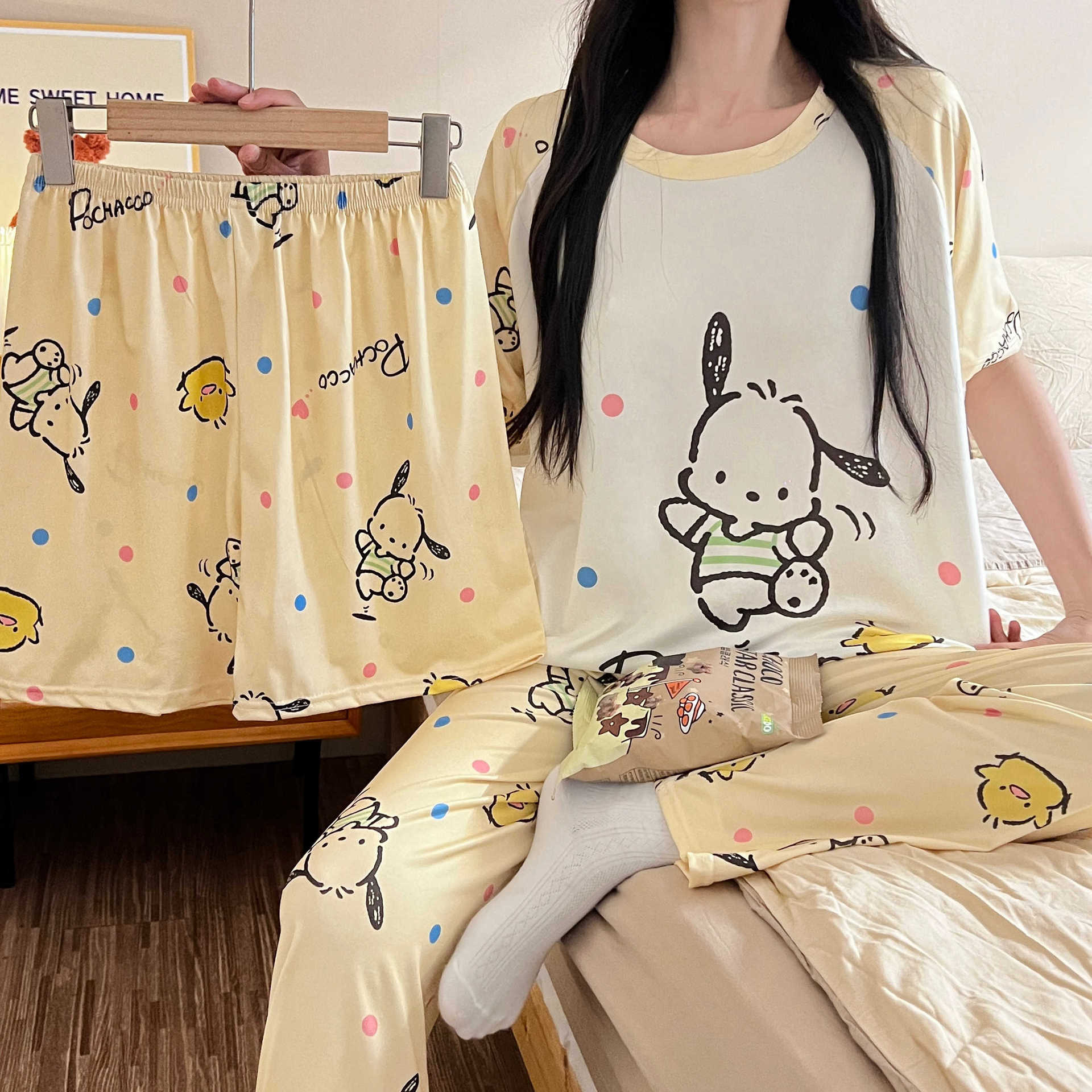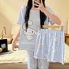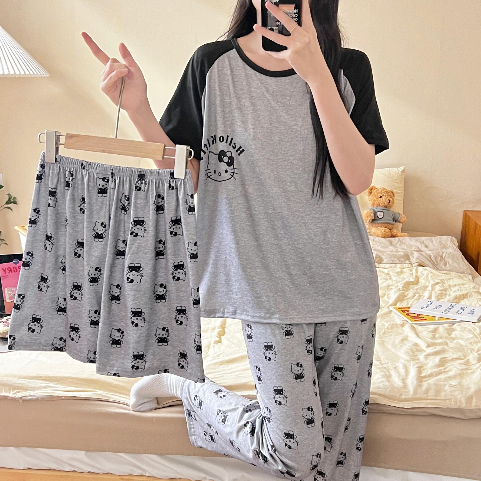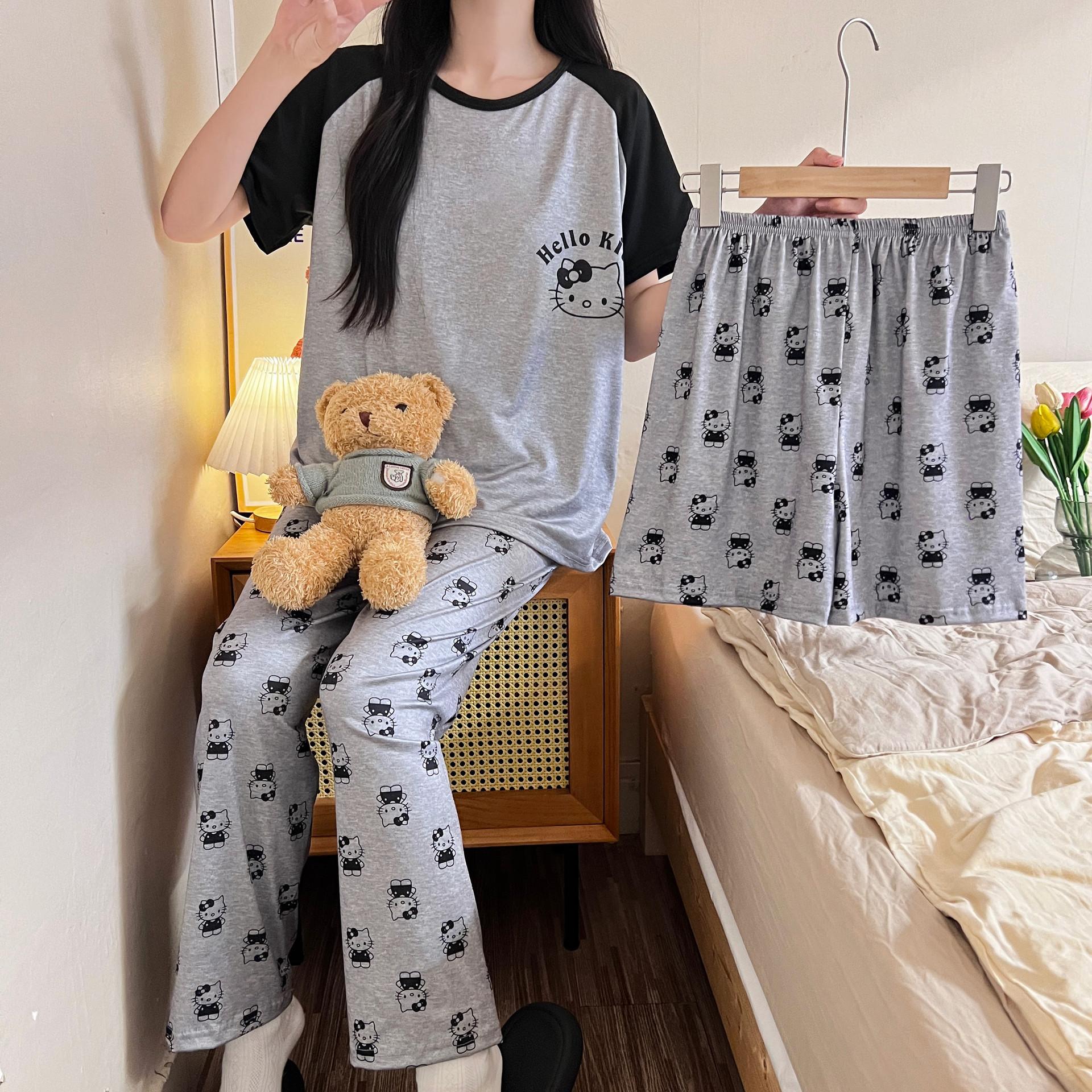 Pijama de verano para mujer, conjunto de tres piezas 2024, nuevo, fino, dulce, bonito, con dibujos animados, estilo popular en línea, ropa de abrigo, ropa para el hogar