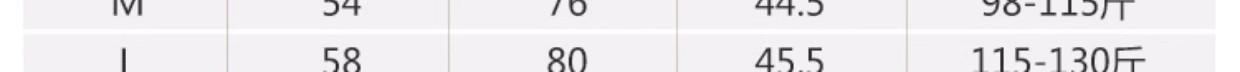 S (42.50 kg-50.00 kg, M (50.00 kg-57.50 kg, L (57.50 kg-65.00 kg, XL (65.00 kg-72.50 kg