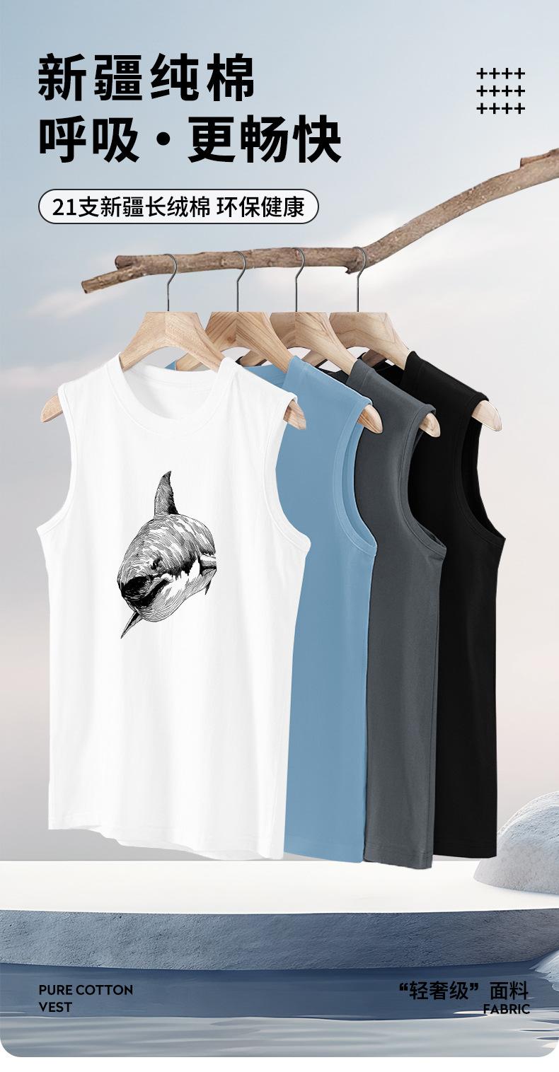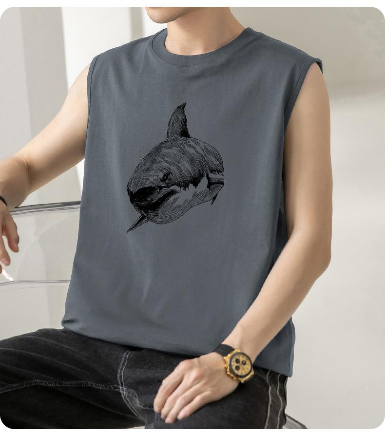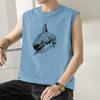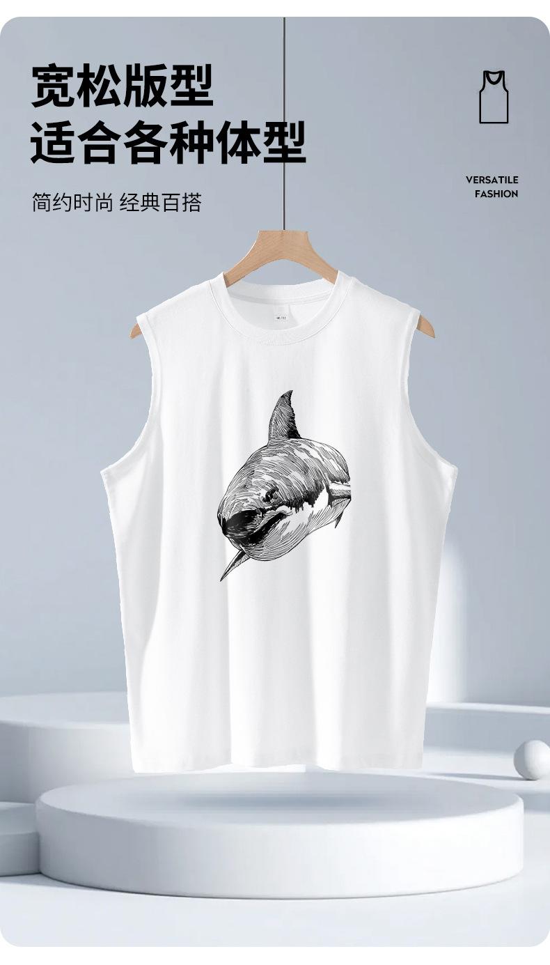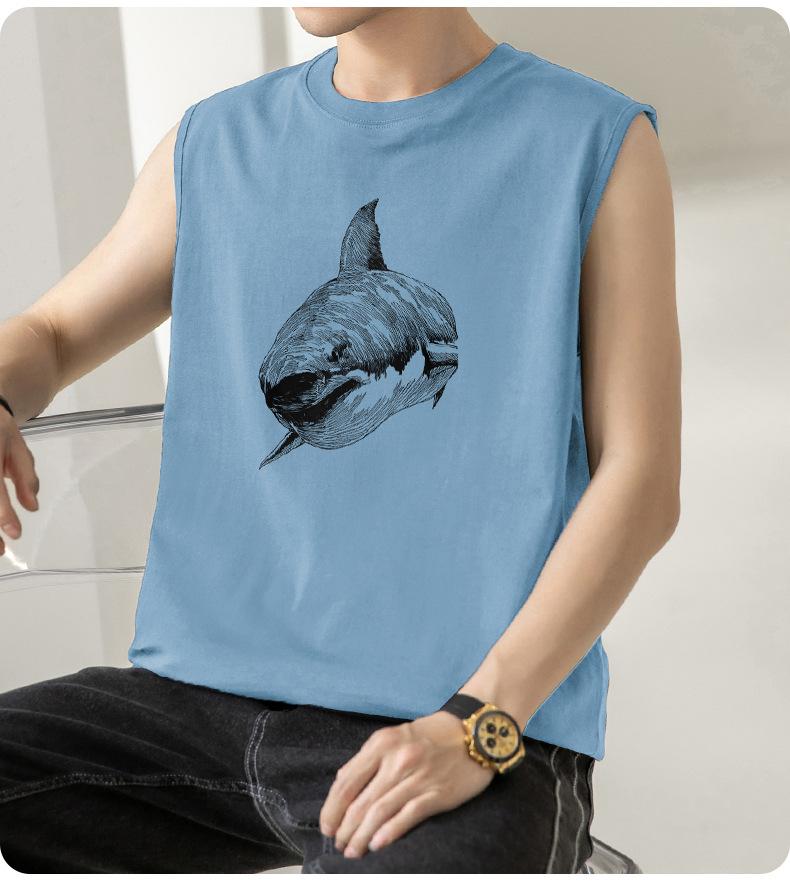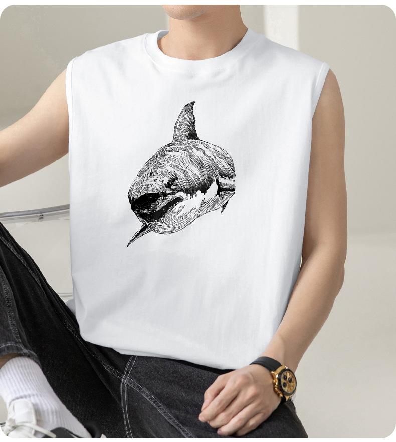Playera sin mangas de algodón puro Chaleco para hombre 2025 Nuevo Verano Deportes Fitness Tendencia Estampado de Tiburón Blanco Chaleco