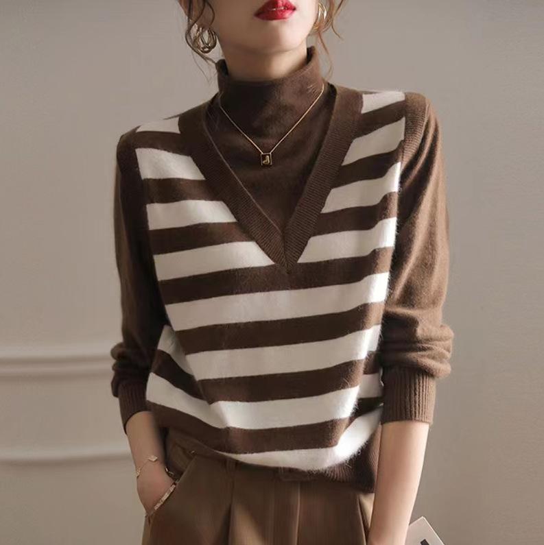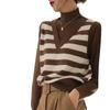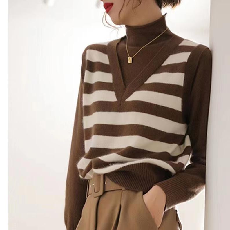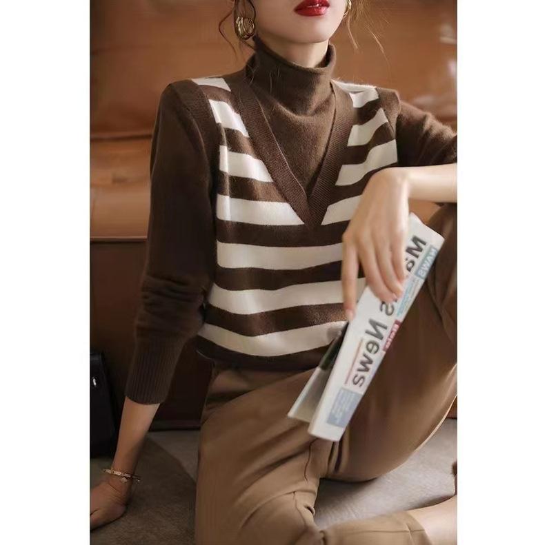 Bienes europeos otoño e invierno 2022 Nuevo sentido del diseño falso de dos piezas color contraste chaleco a rayas cuello alto suéter interior suéter de moda