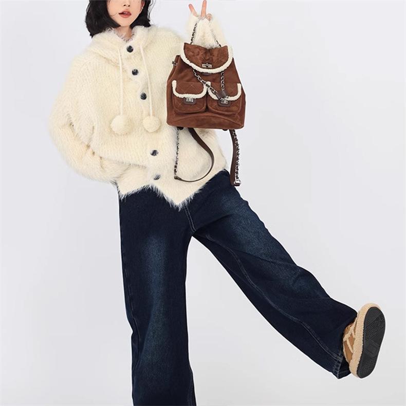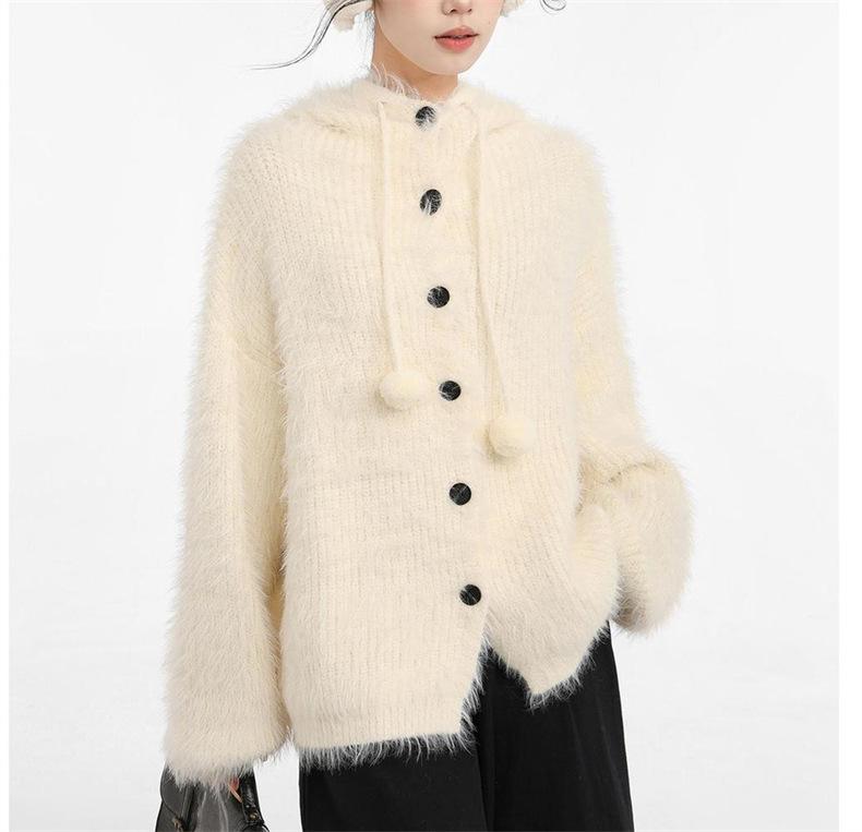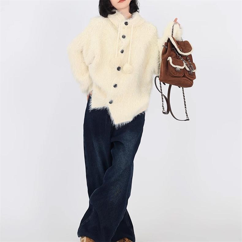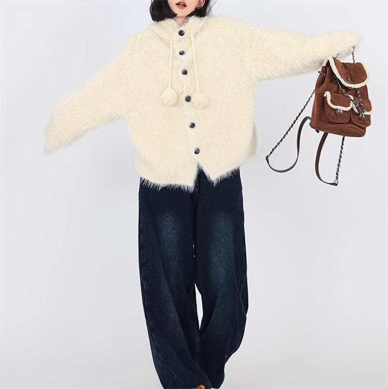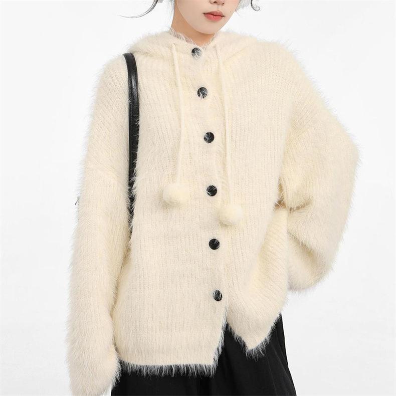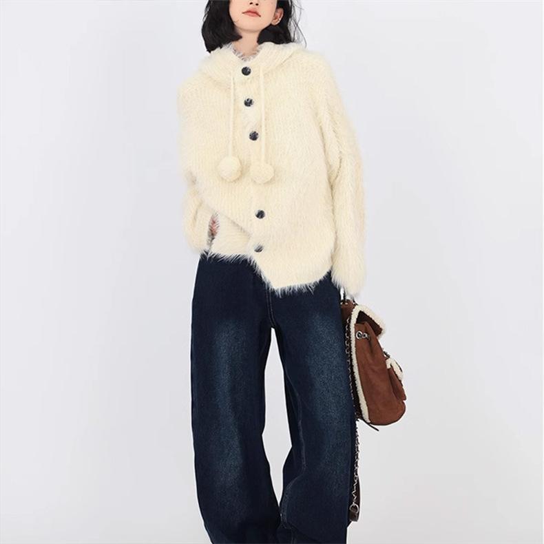 Suéter Cárdigan de Cachemira de Visón Imitación para Mujer Otoño e Invierno 2024 Nuevo Abrigo de Punto con Capucha Holgado Grueso Top para Mujer