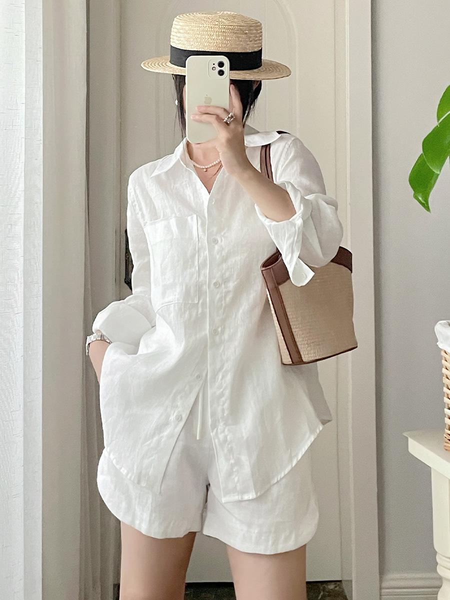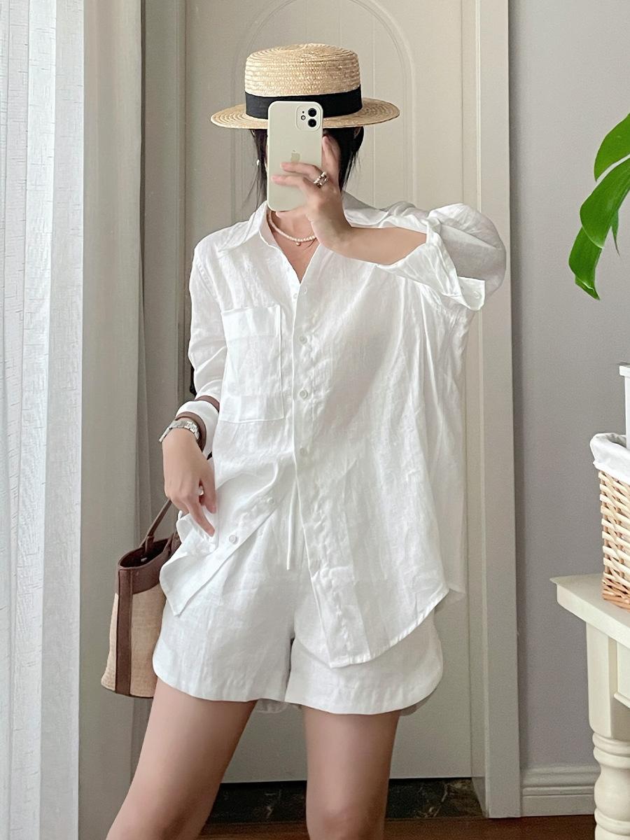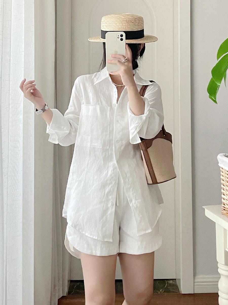 Camisa larga blanca lino retro francés bloqueador solar traje de dos piezas nuevo 2024