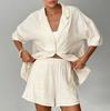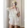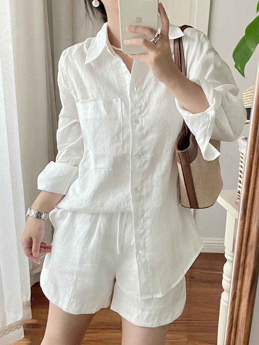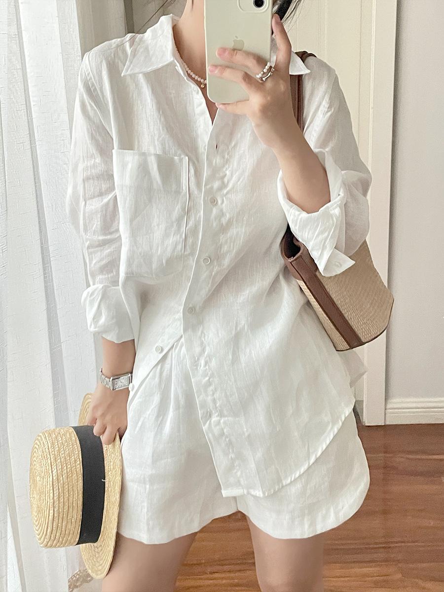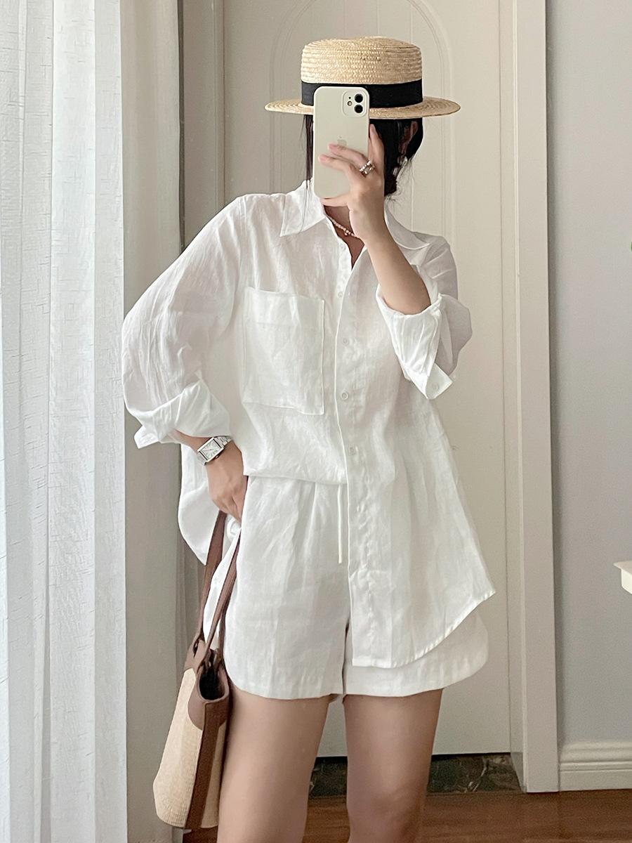 Camisa larga blanca lino retro francés bloqueador solar traje de dos piezas nuevo 2024