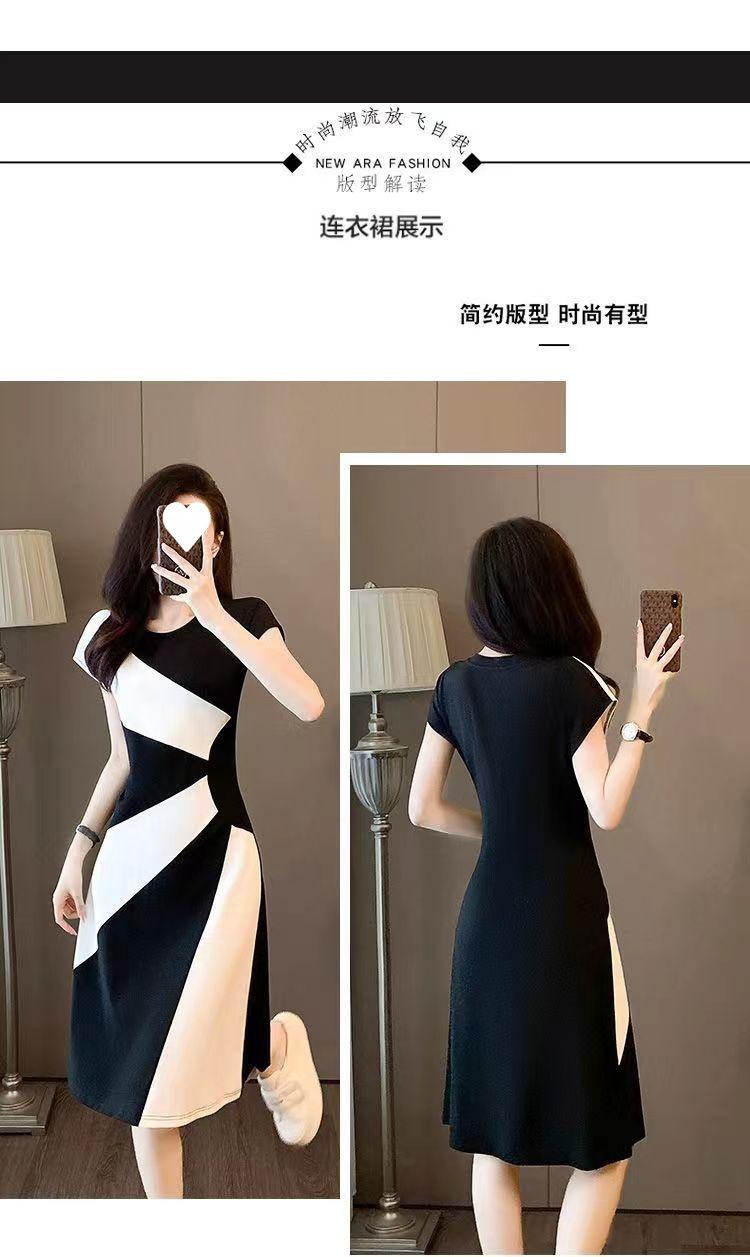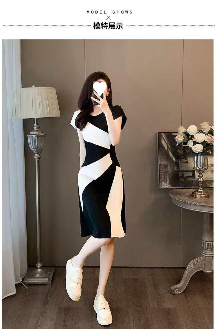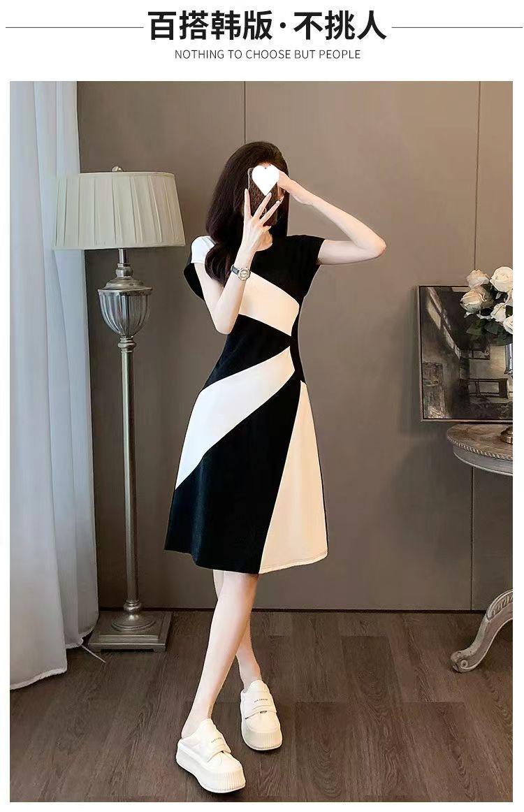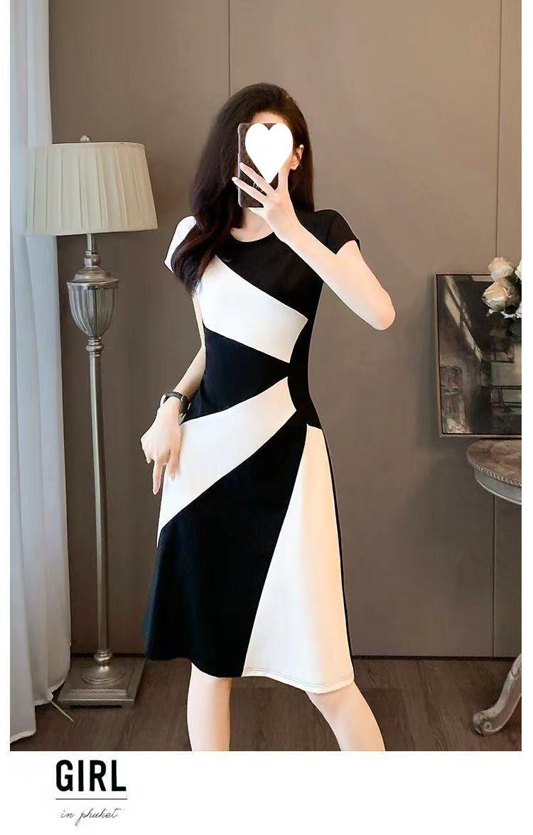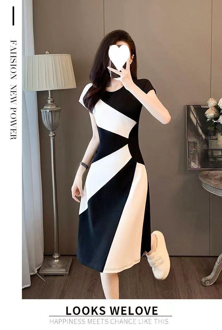 Vestido francés de verano 2024, nuevo temperamento, cintura ajustada, adelgazante, falda informal con costuras en blanco y negro de alta calidad.