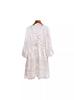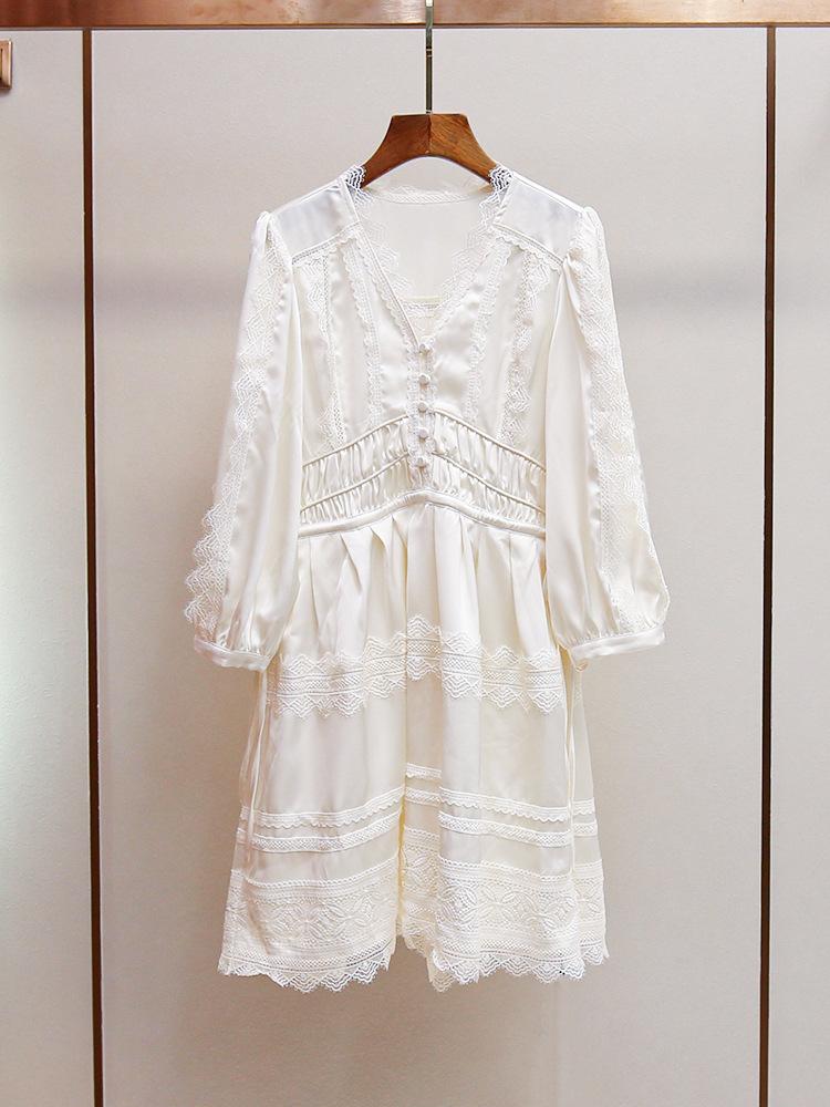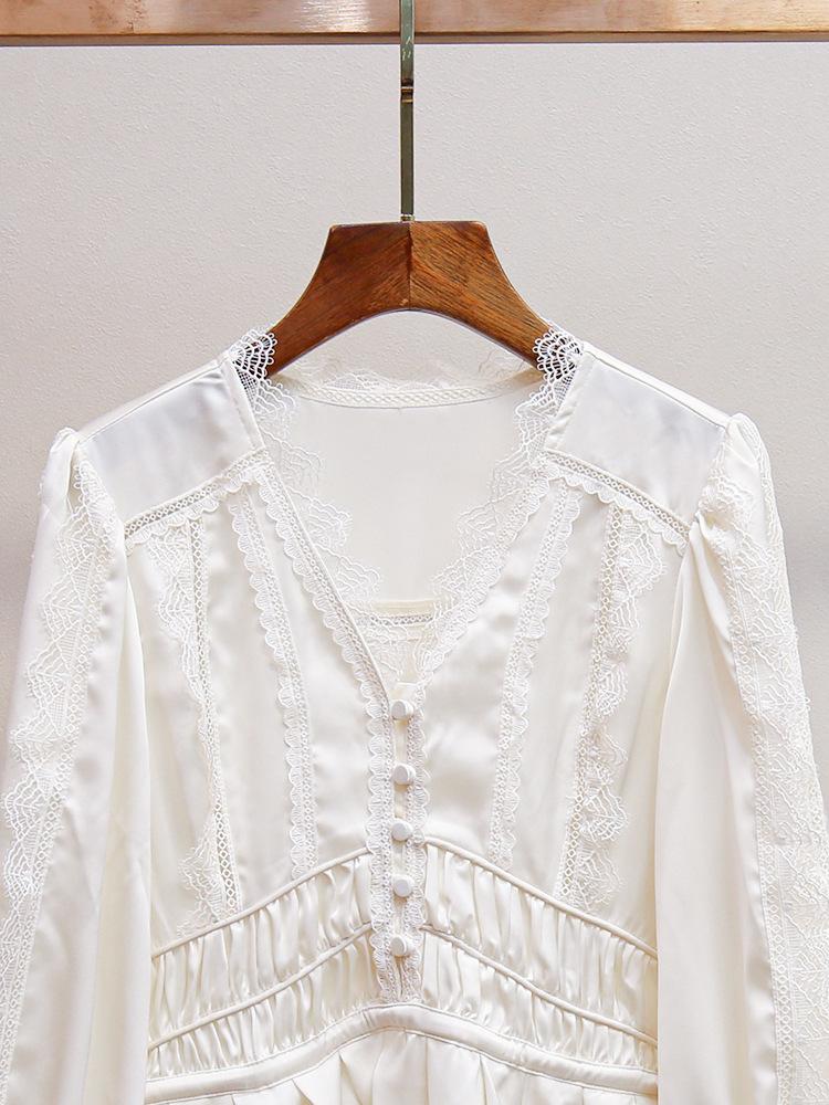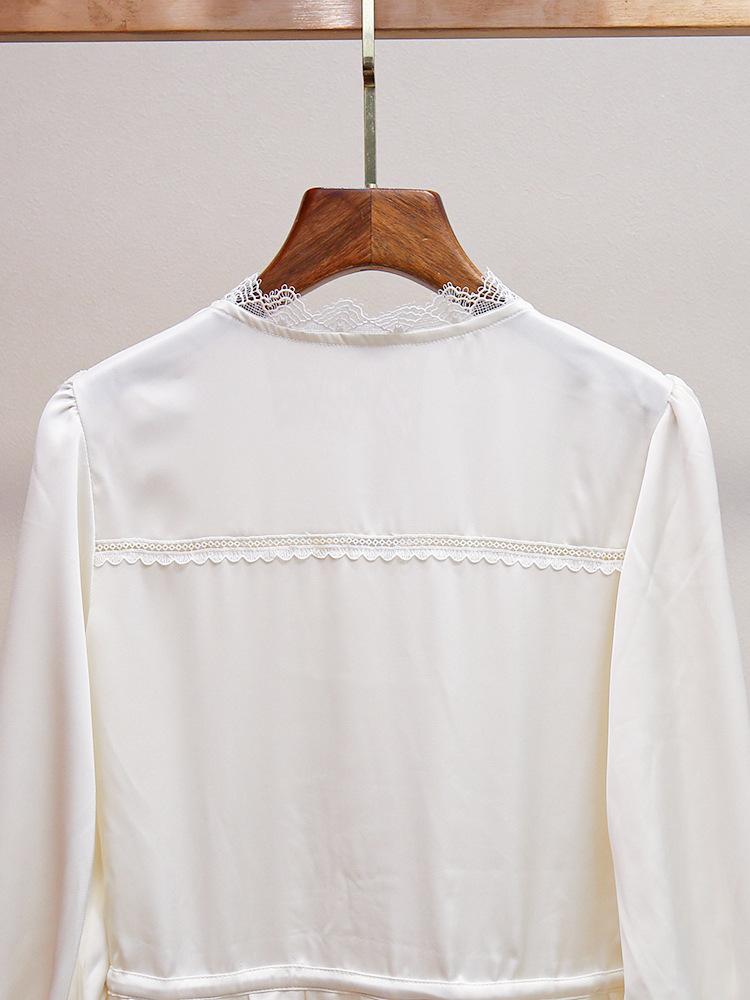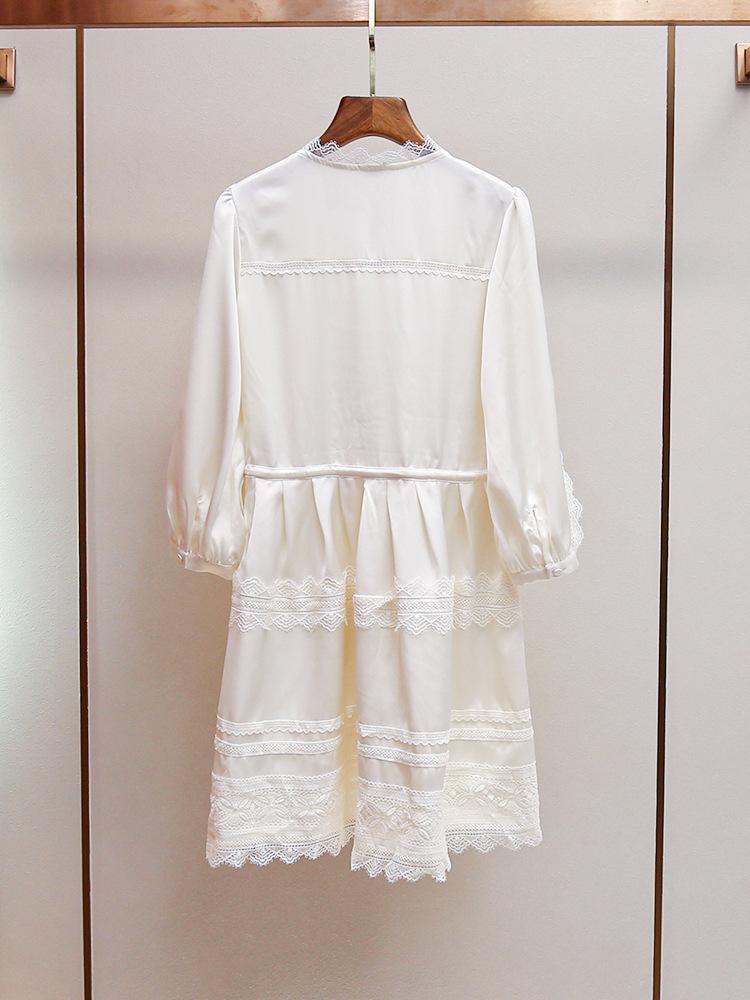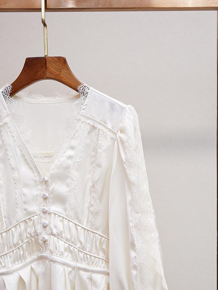Vestido de Encaje de Manga Larga con Cuello en V y Diseño de Cordón Ajustable en la Cintura de Estilo Elegante y Relajado para Mujer
