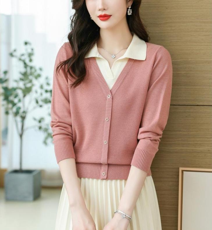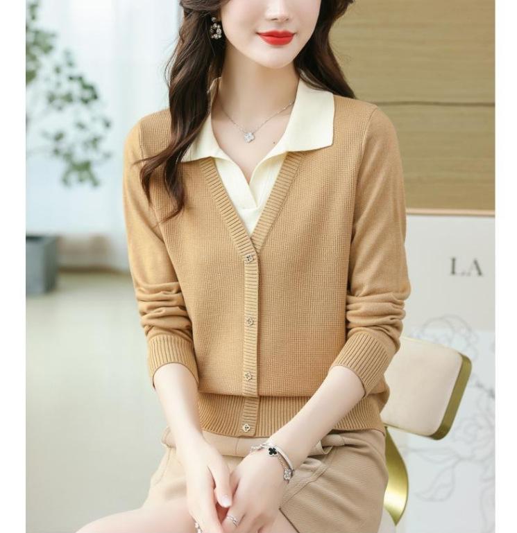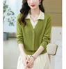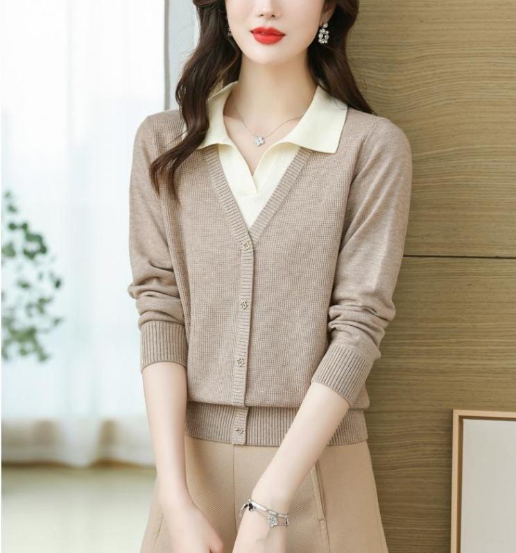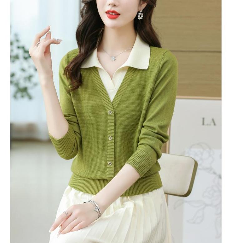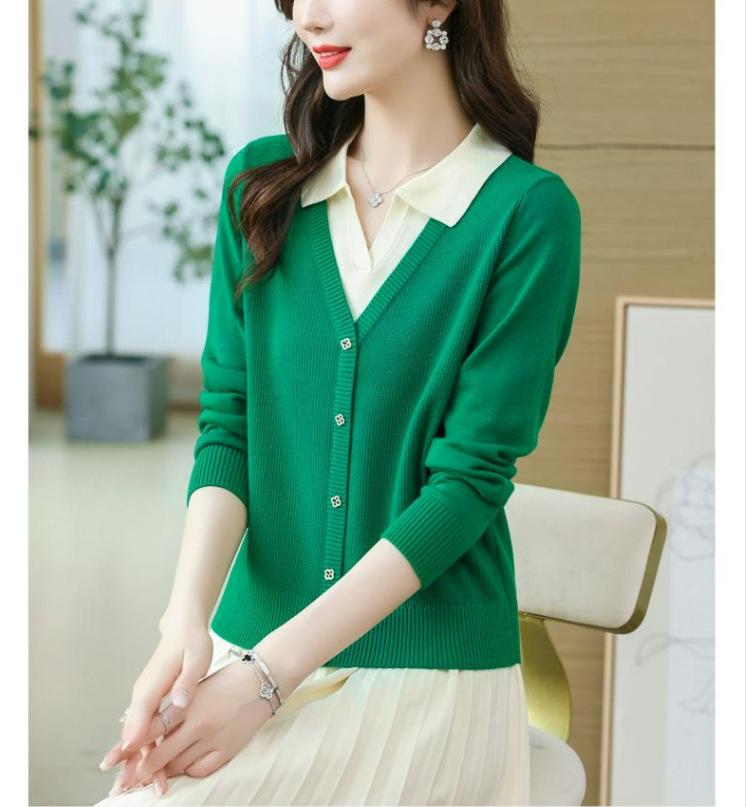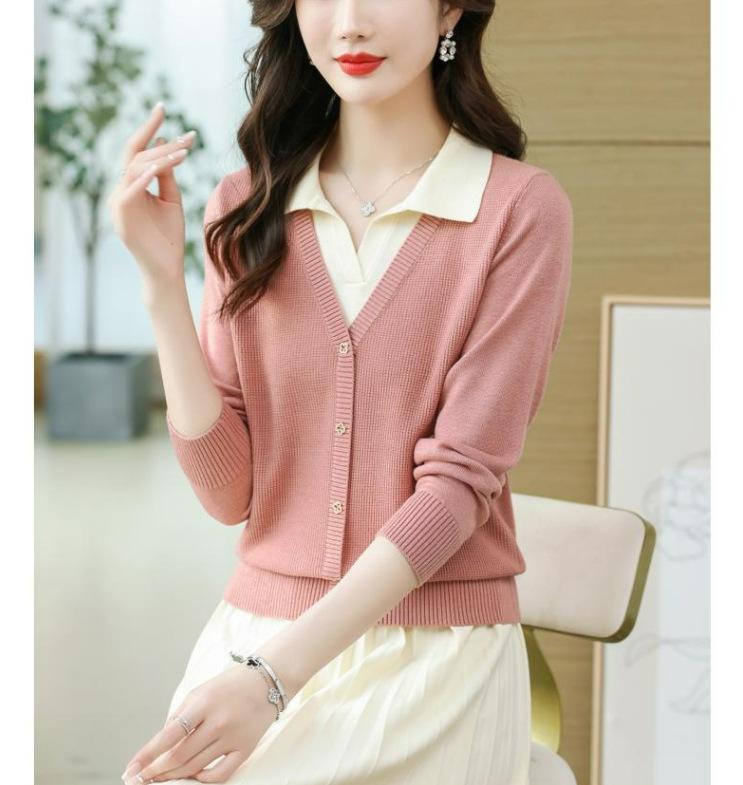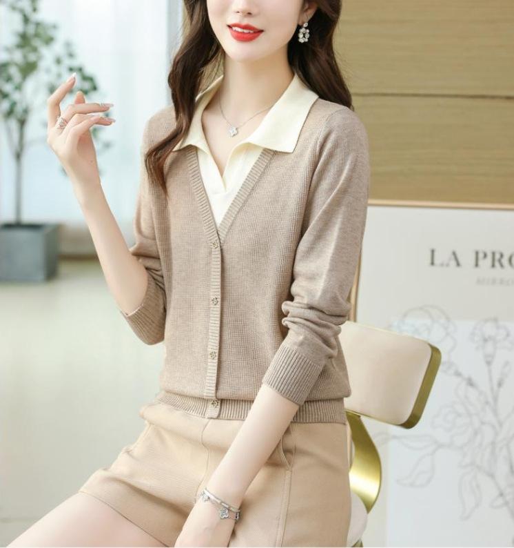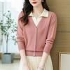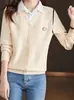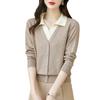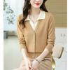 Suéter de Moda de Dos Piezas Falsas con Cuello de Camisa para Mujer 2023 Primavera y Otoño Nuevo Abrigo Color Block Tejido Suelto Camisa Base