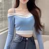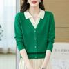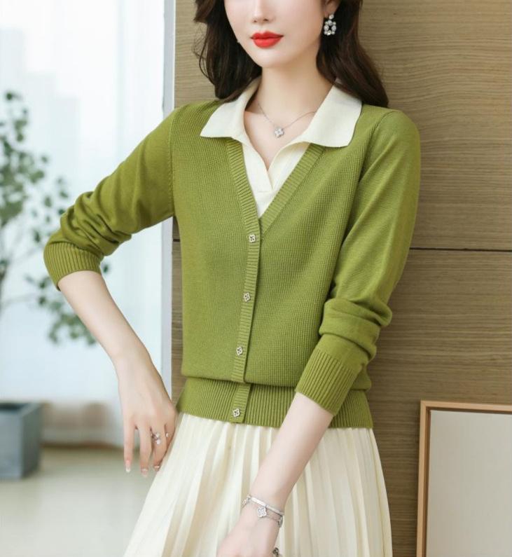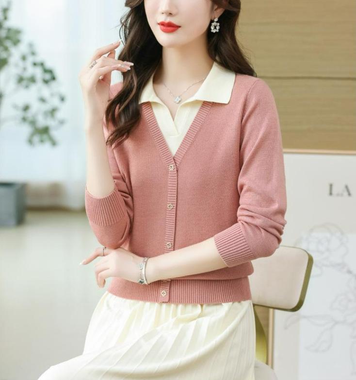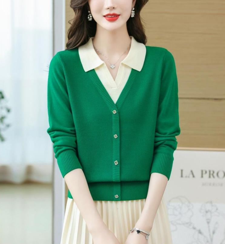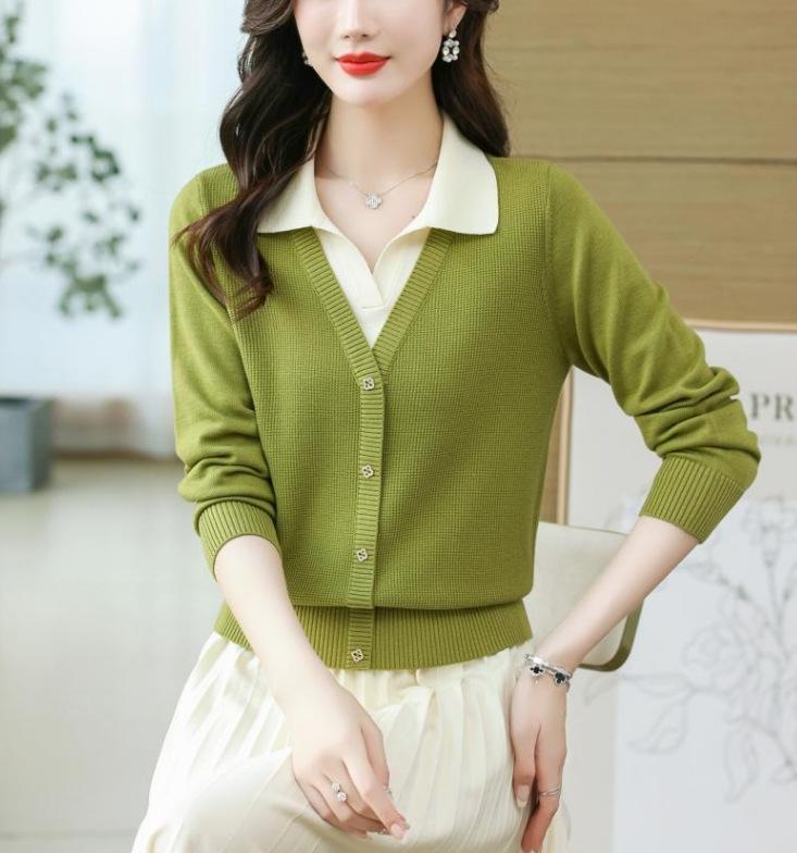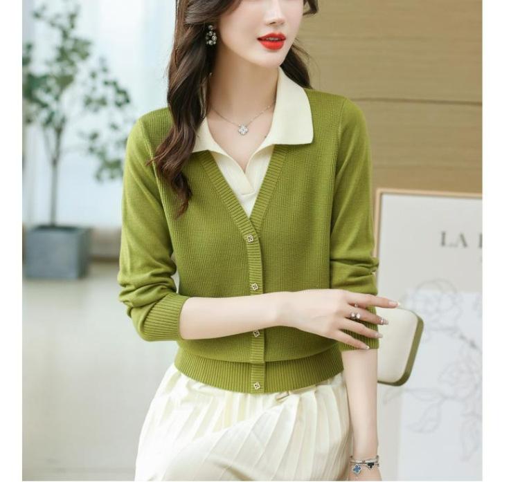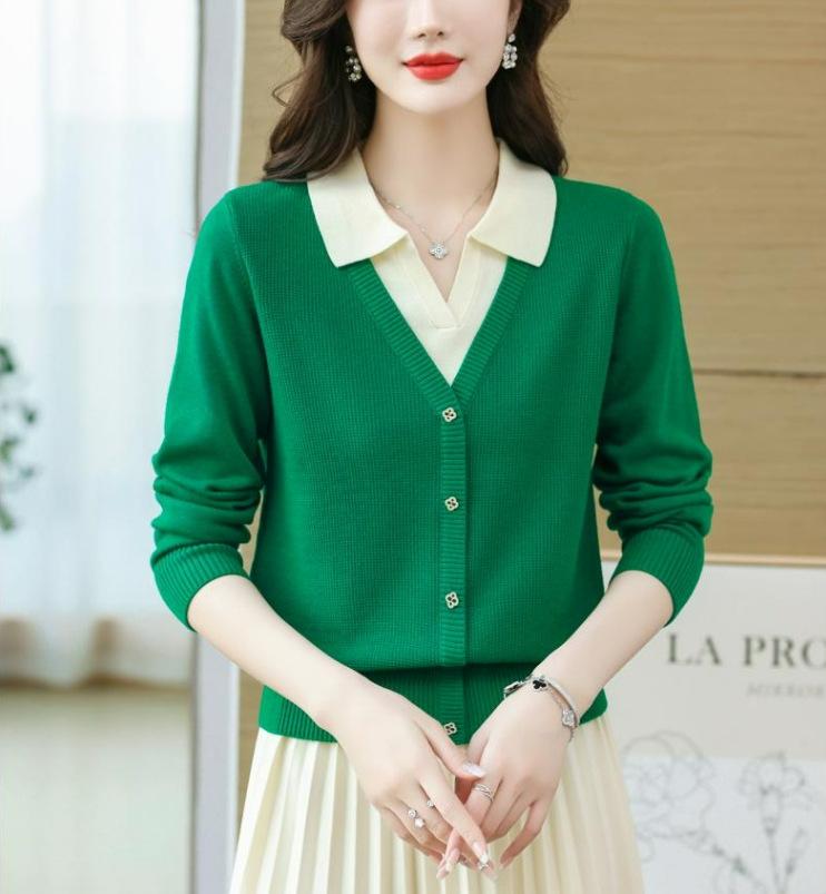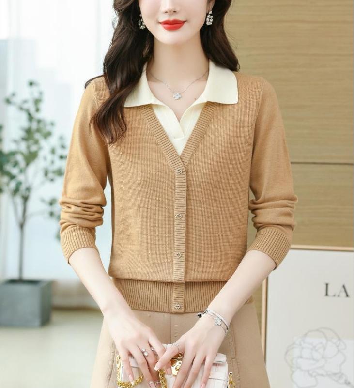 Suéter de Moda de Dos Piezas Falsas con Cuello de Camisa para Mujer 2023 Primavera y Otoño Nuevo Abrigo Color Block Tejido Suelto Camisa Base