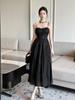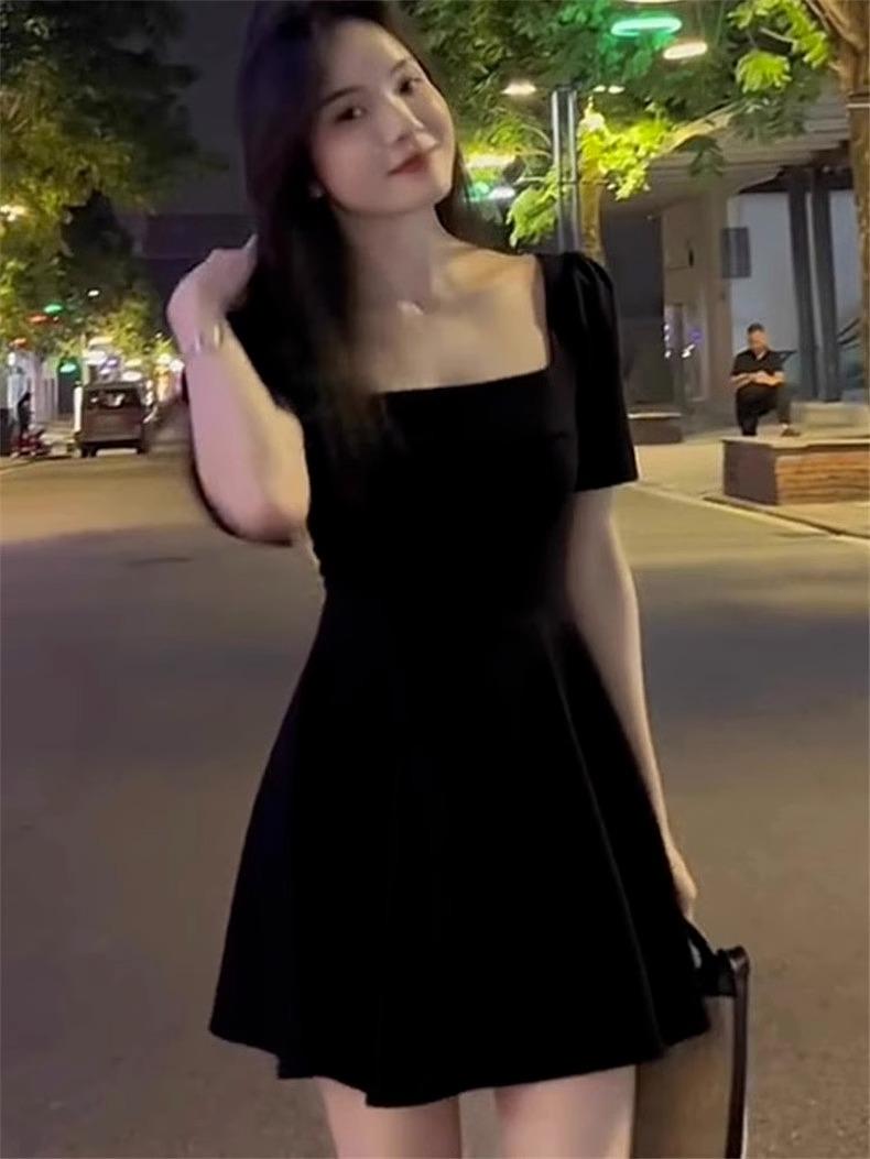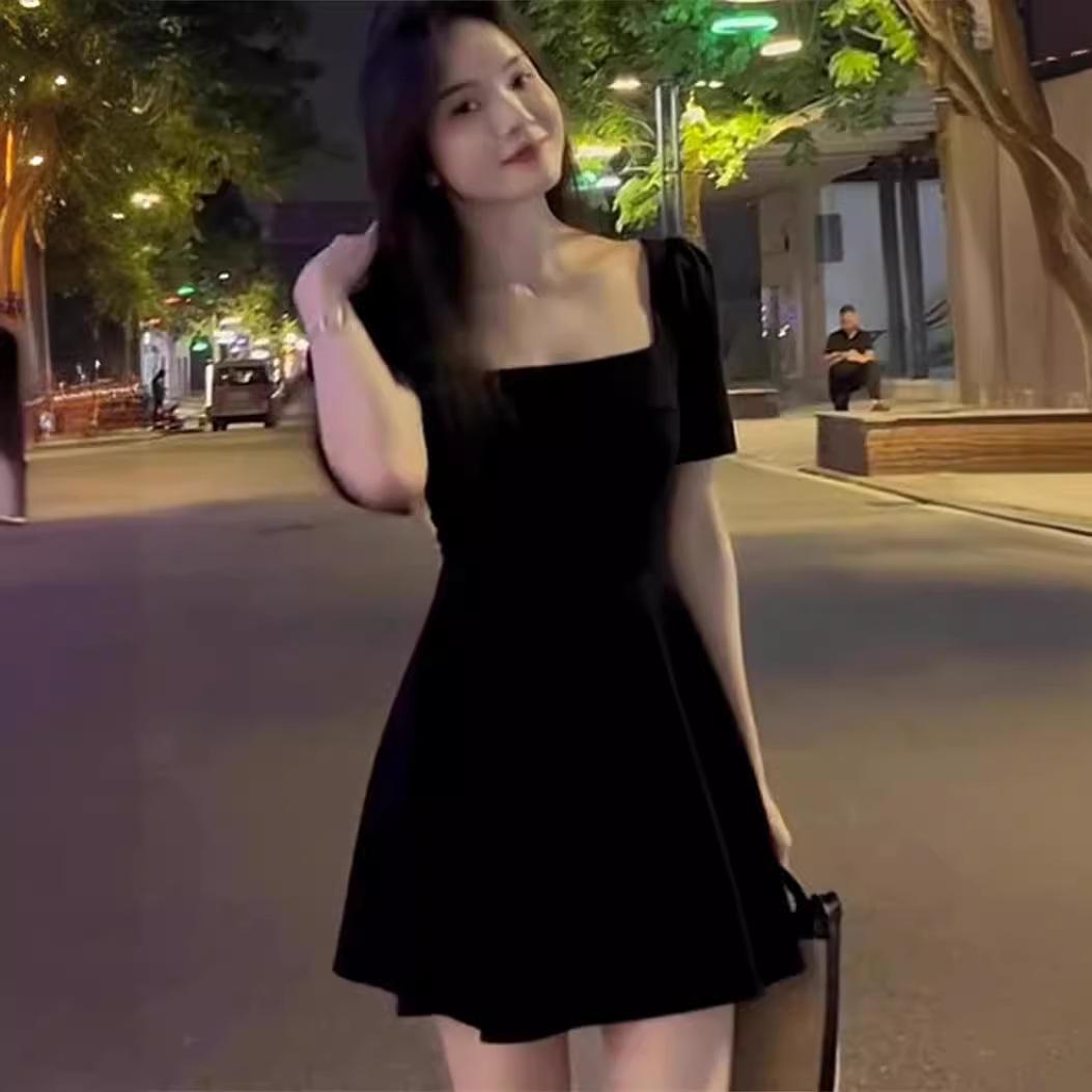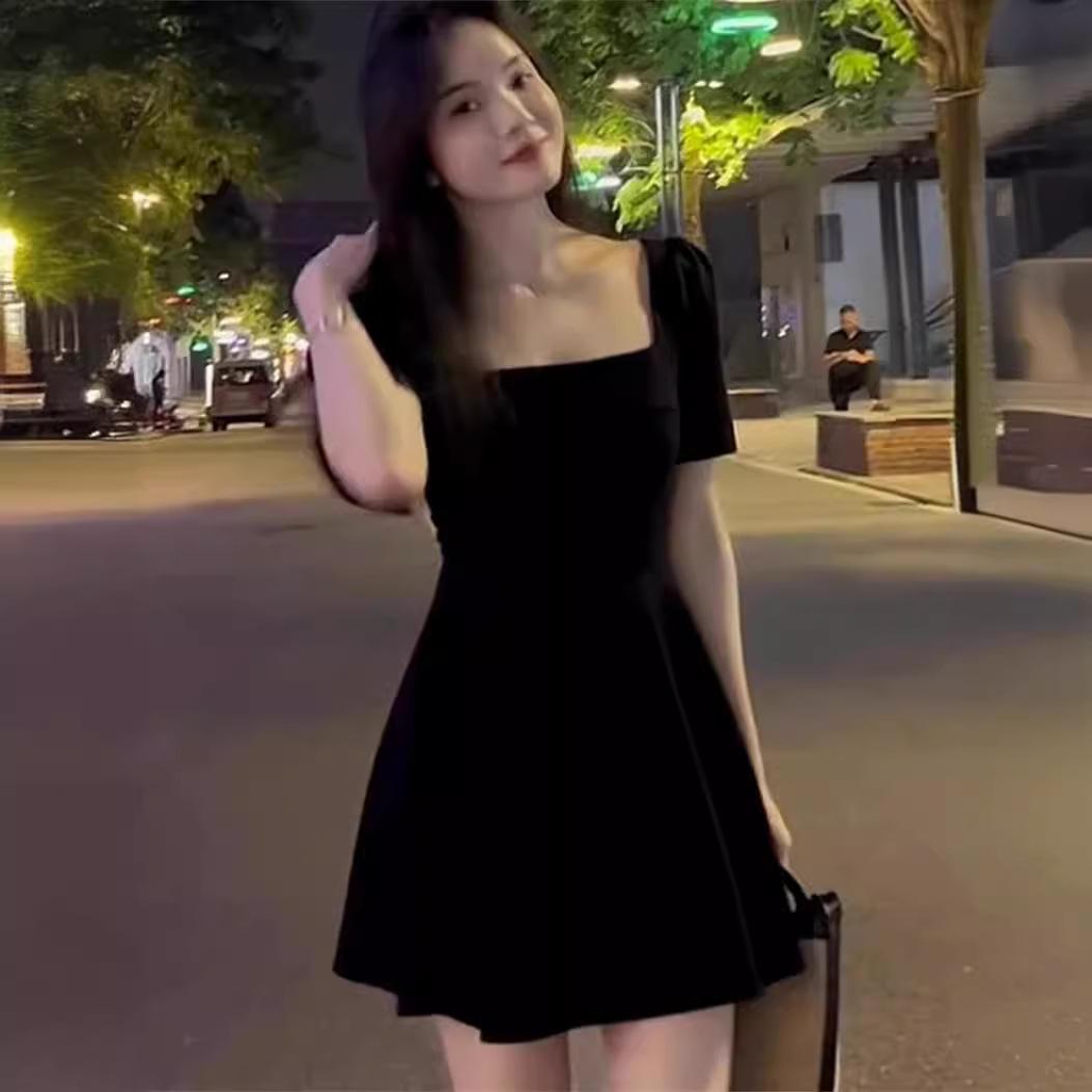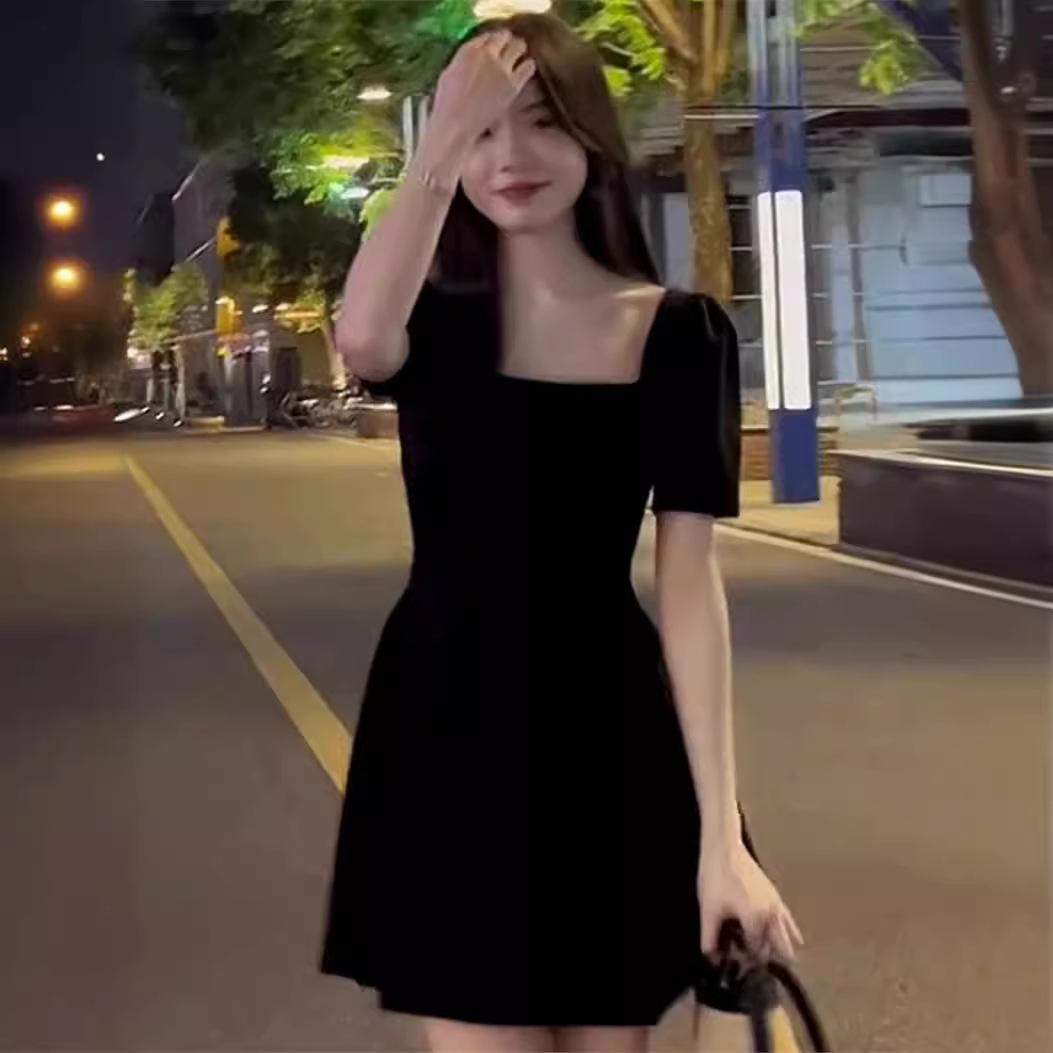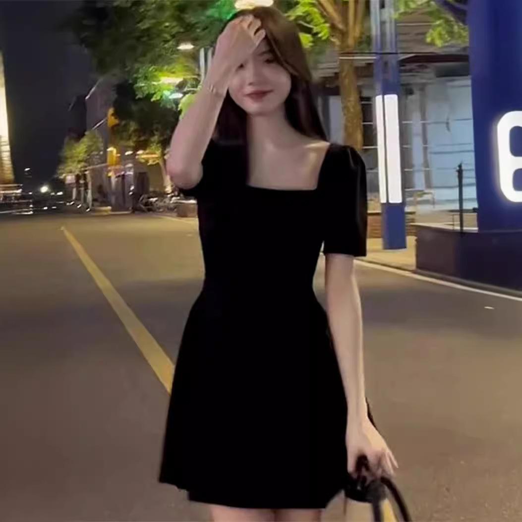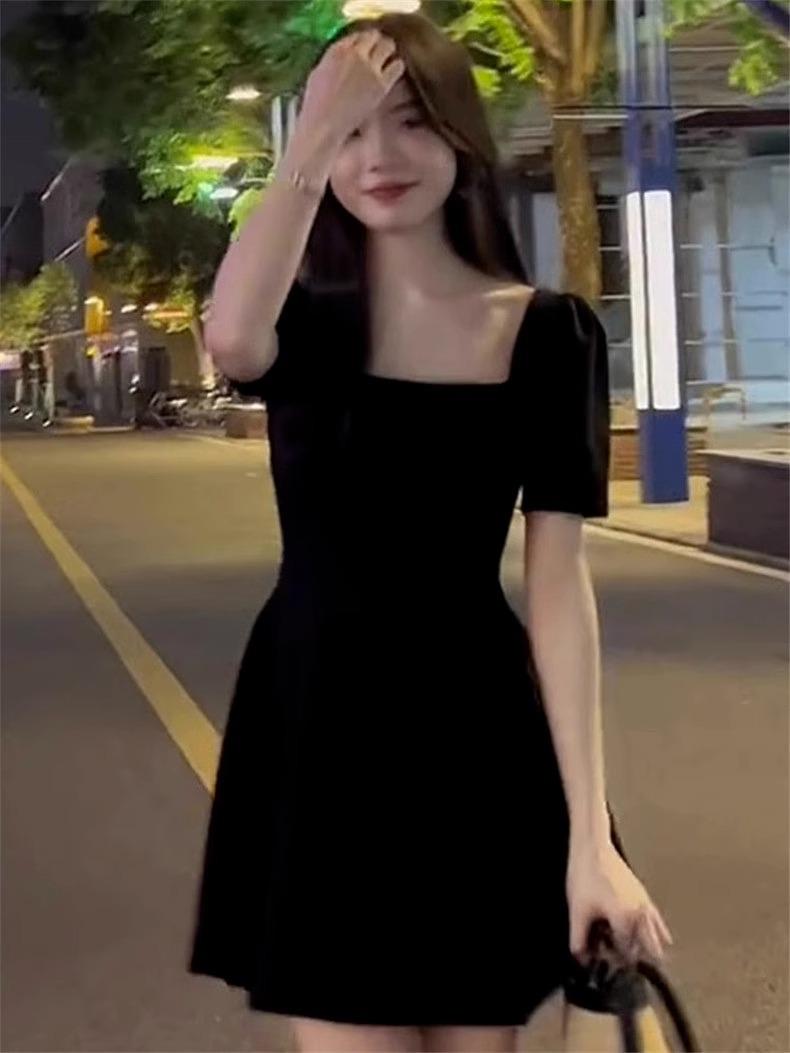 Vestido Negro de Cuello Cuadrado y Manga Corta para Mujer Verano 2024 Nuevo Estilo Francés Hepburn Estilo Occidental Pequeño Vestido Negro