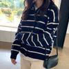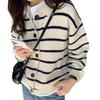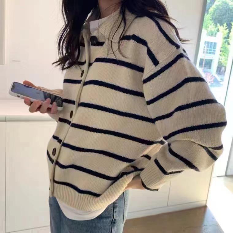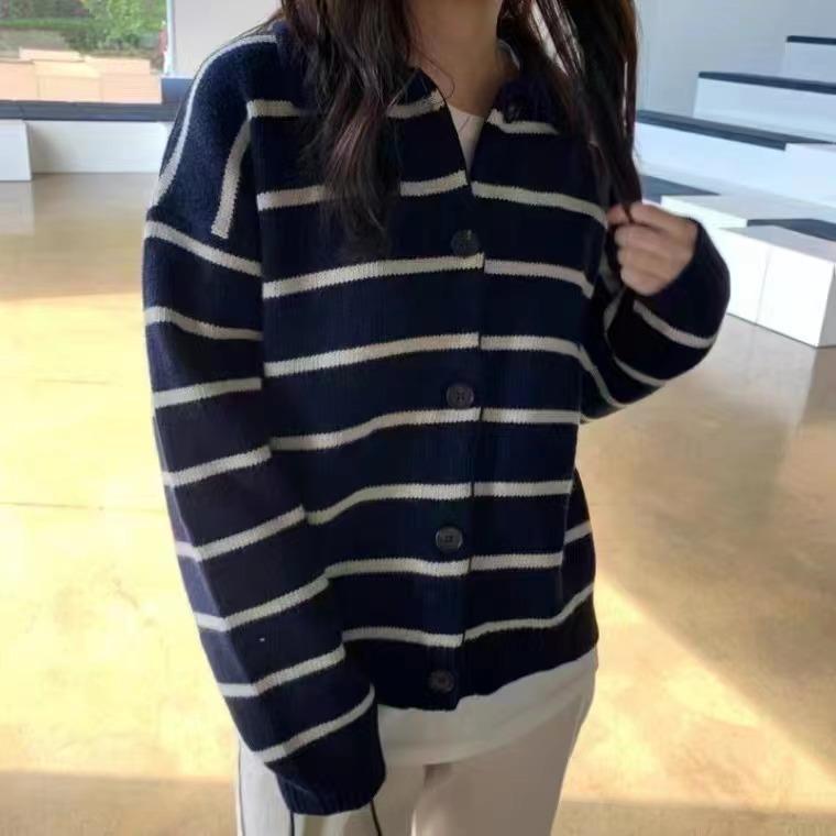 Cárdigan Suéter de Punto Rayado Coreano Chic Otoño e Invierno Estilo Retro Solapa Cruzado Sencillo Casual Holgado Versátil para Mujer