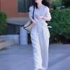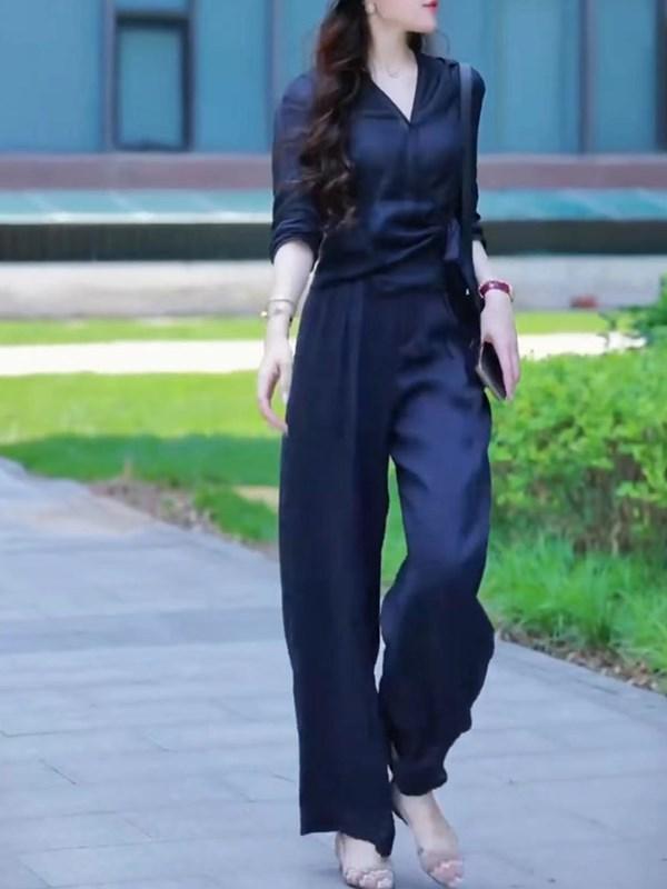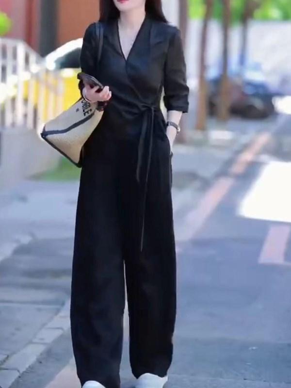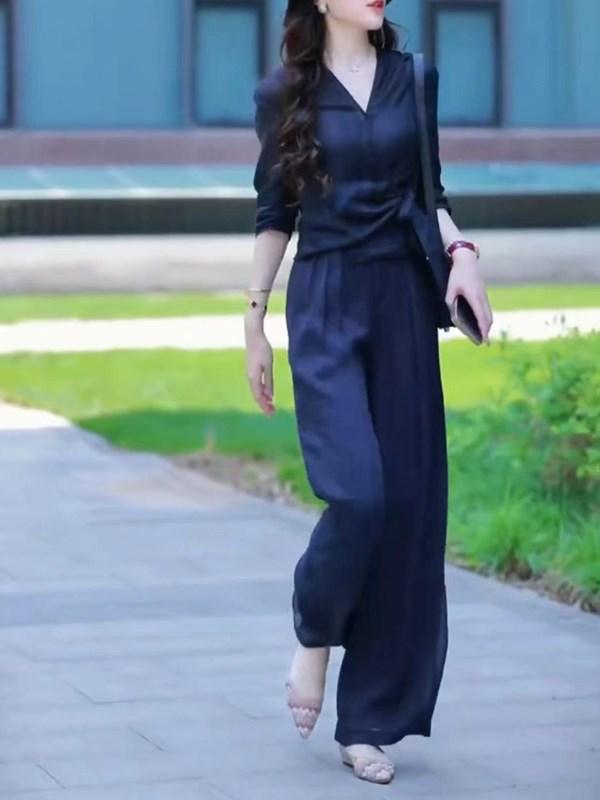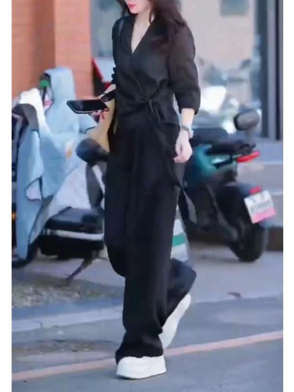 24165 Love Meiyuan 2025 Verano Nuevo Top de Encaje con Cordones de Cuello en V de Gama Alta Pantalones de Pierna Ancha de Cintura Alta para un Look Adelgazante Mujeres