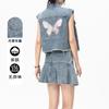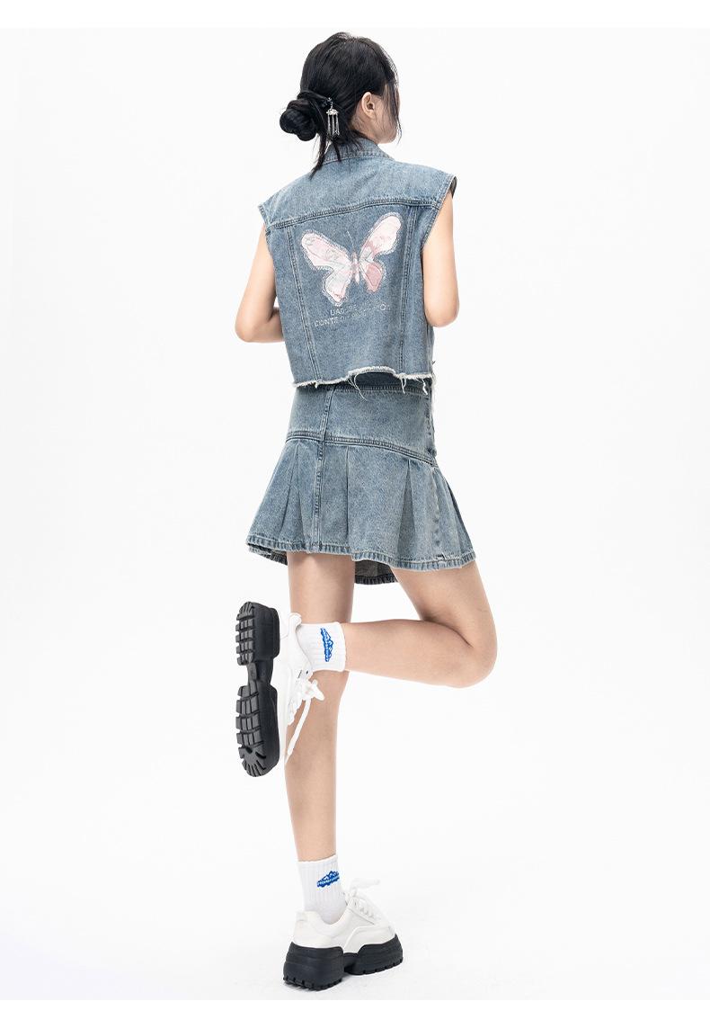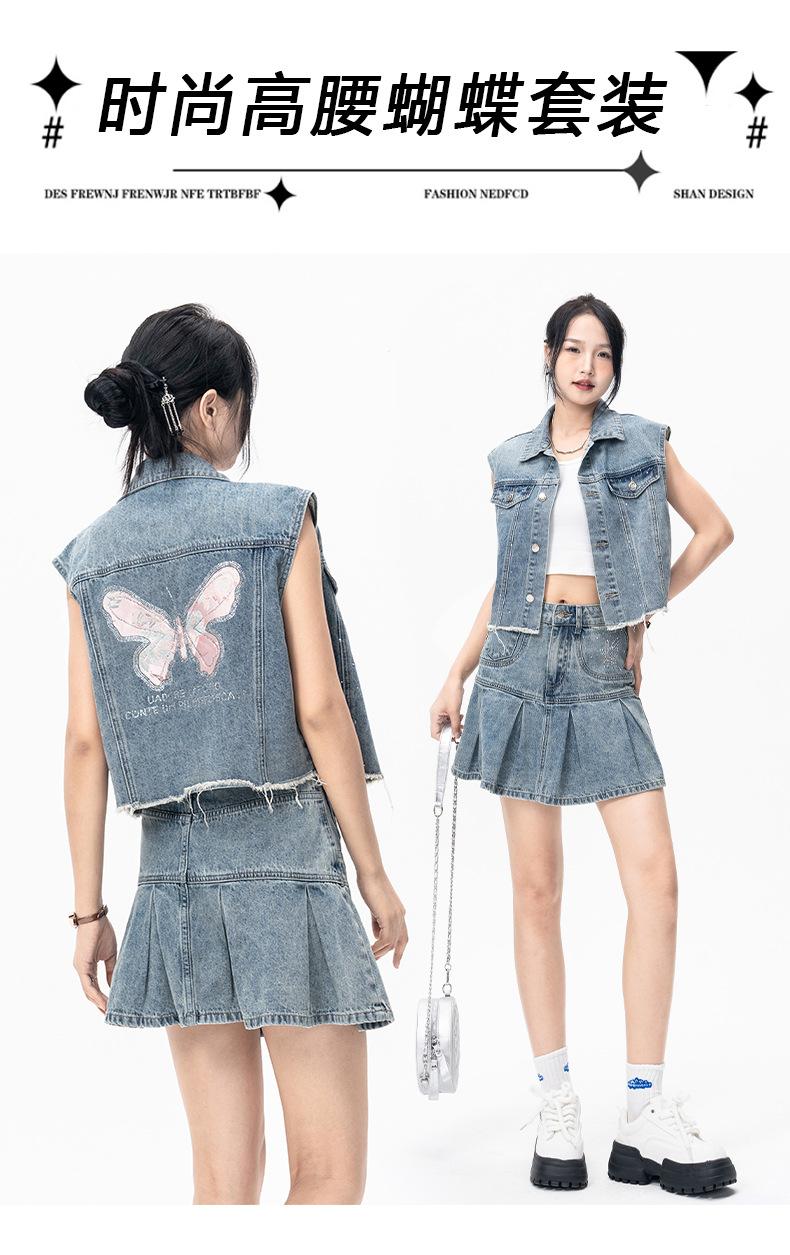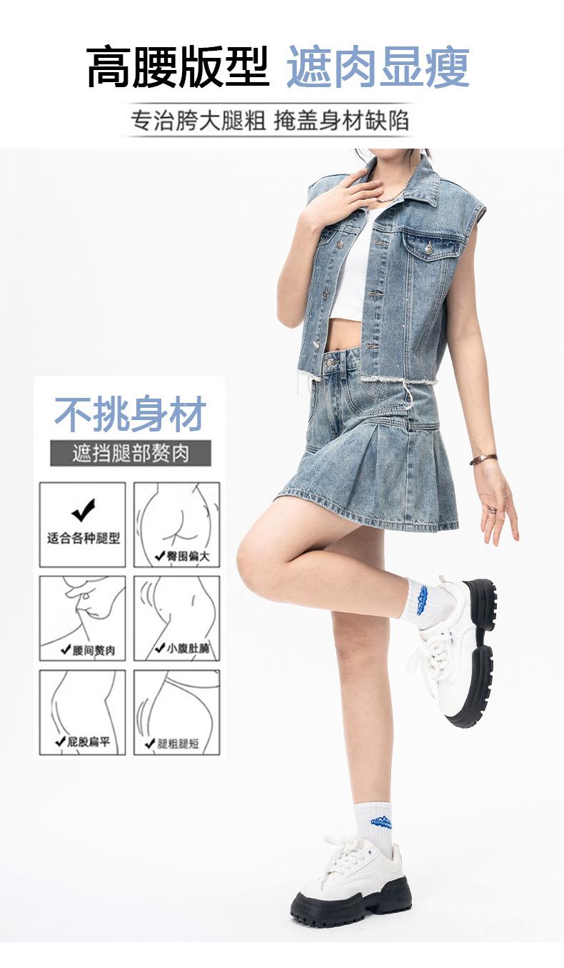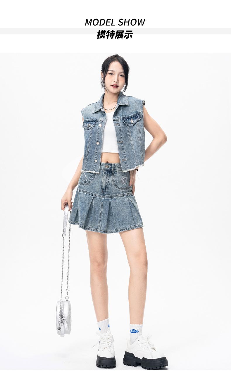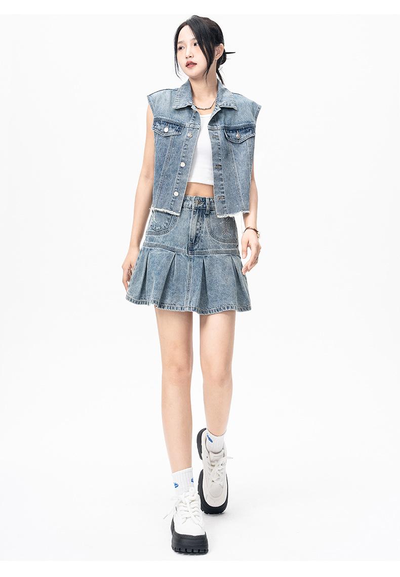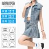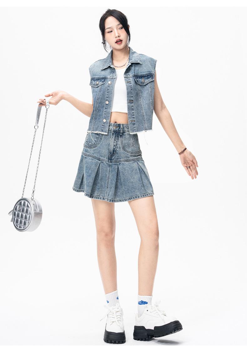 Traje de mezclilla azul claro para mujer, dos piezas, verano 2025, nuevo, pequeño, diamante caliente, sin mangas, falda plisada, traje