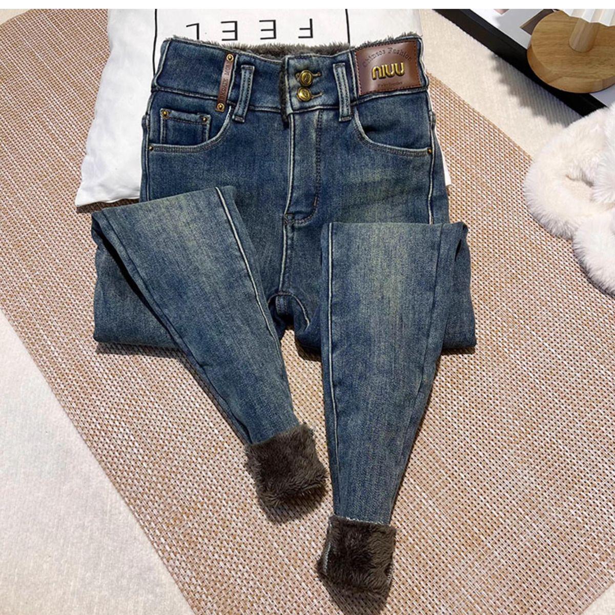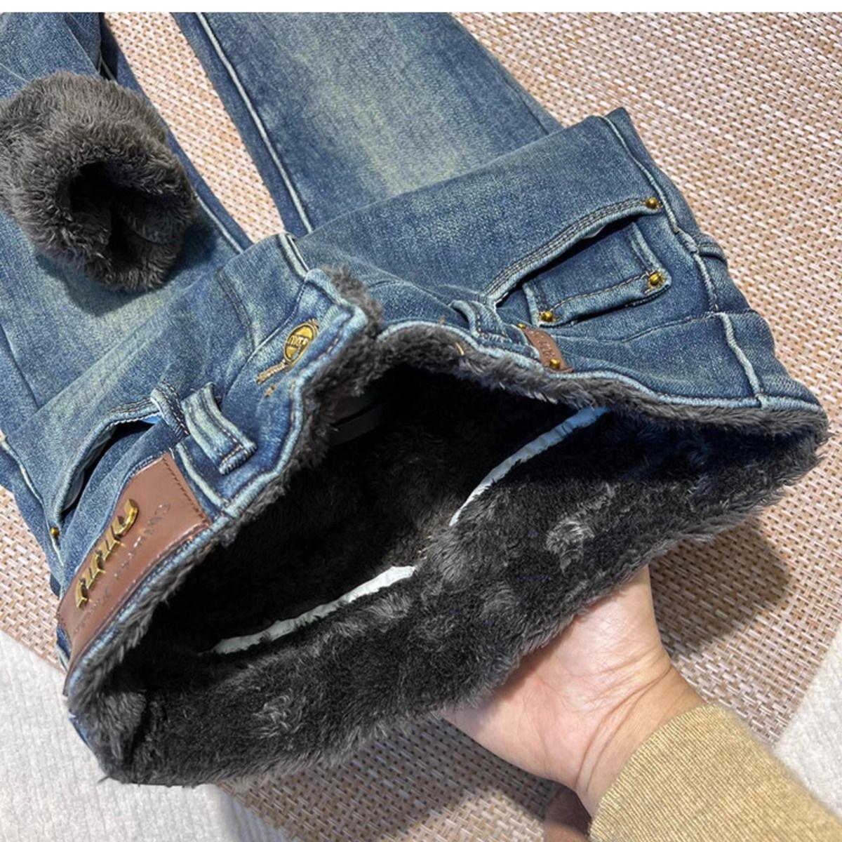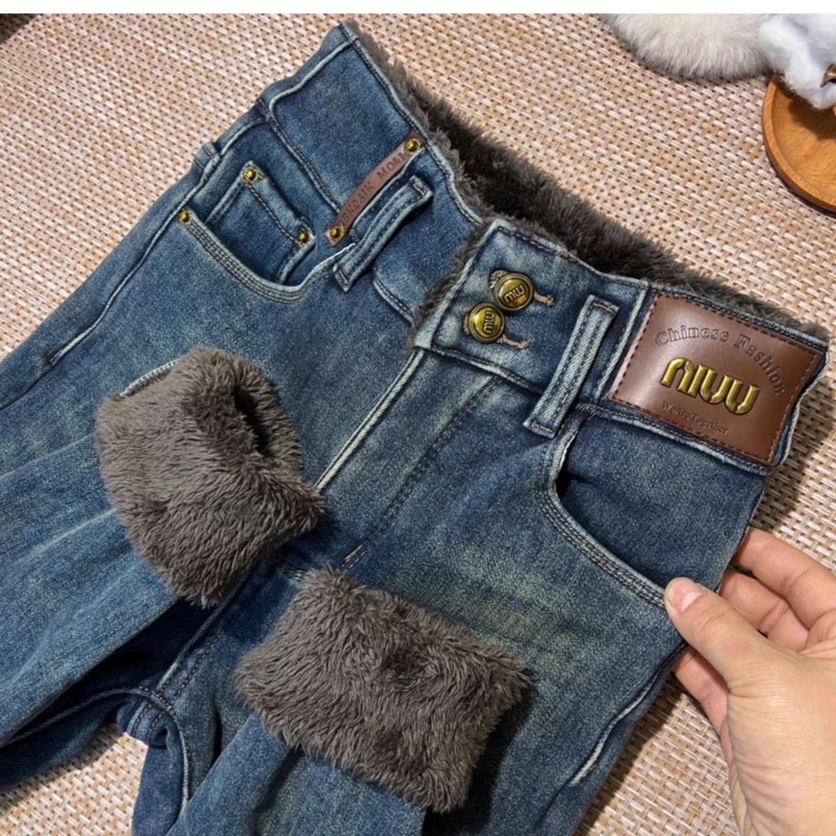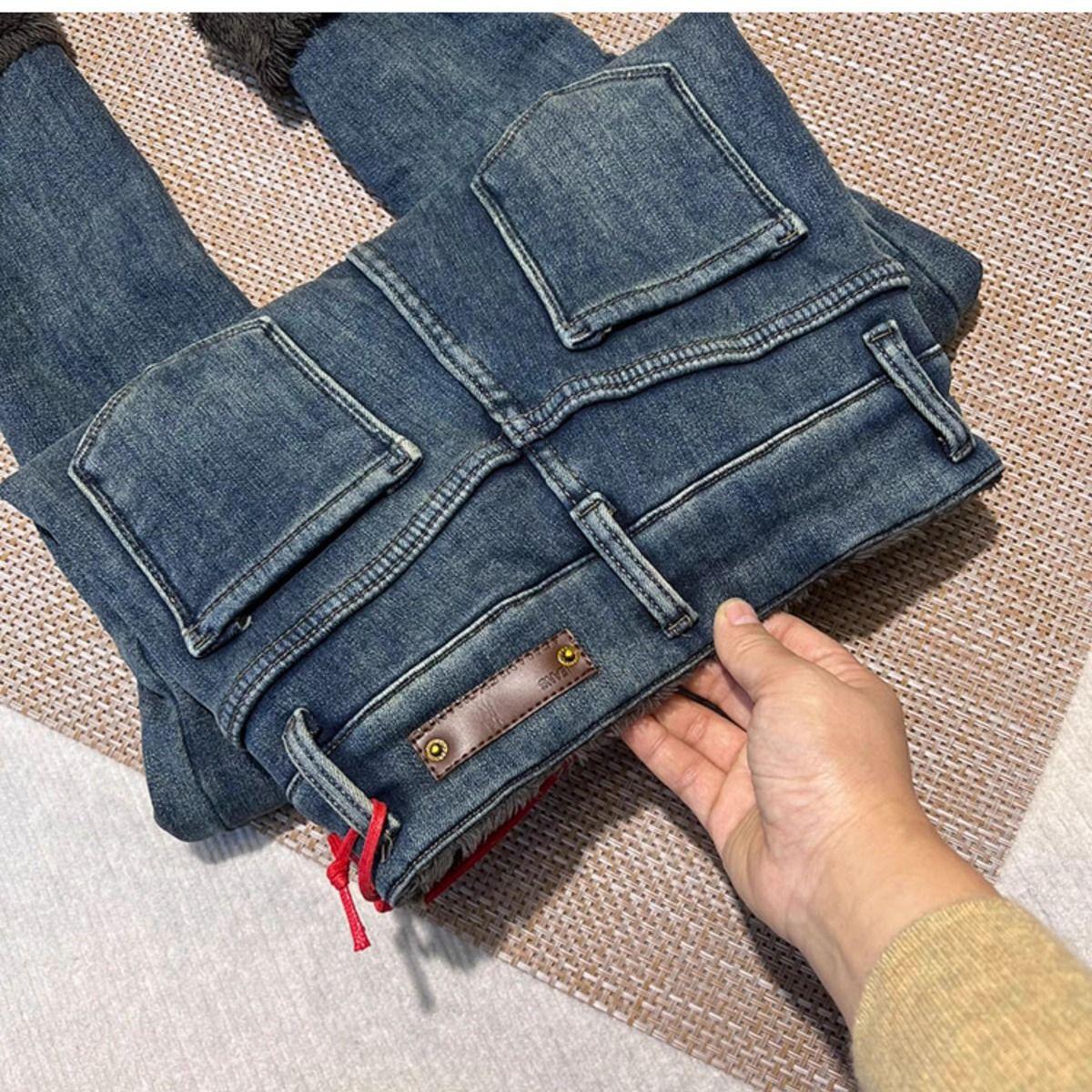 Pantalones vaqueros gruesos de color azul grisáceo con forro polar para mujer, de Chubby Girl, de invierno, nuevos, de cintura alta, ajustados, con diseño adelgazante, ajustados, pantalones de tubo