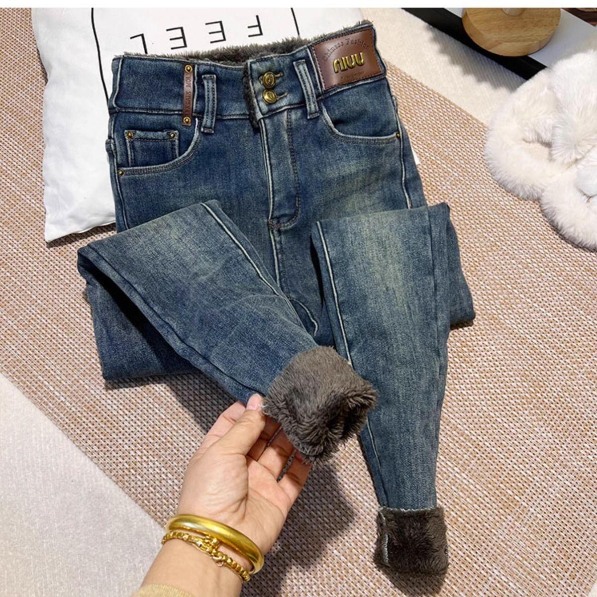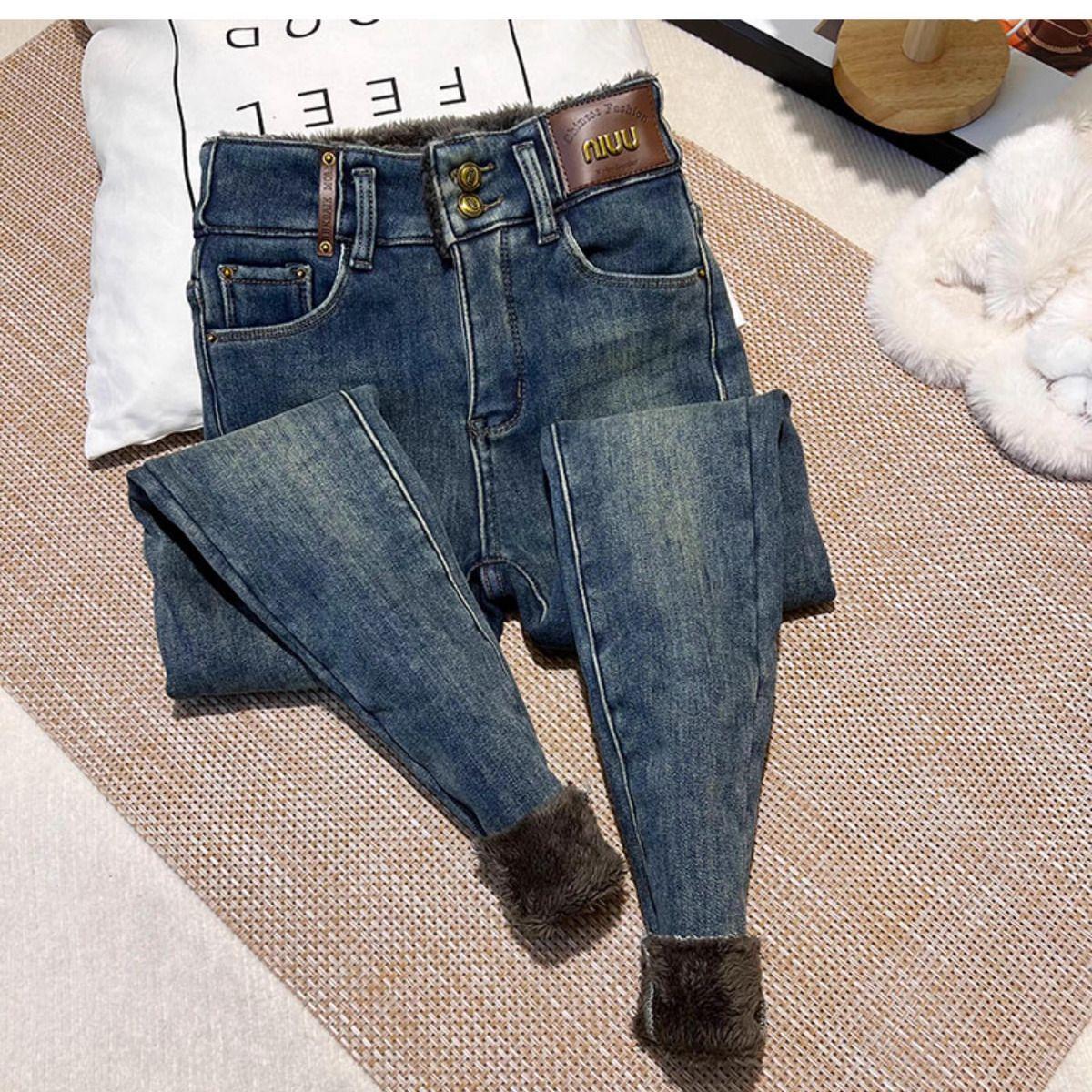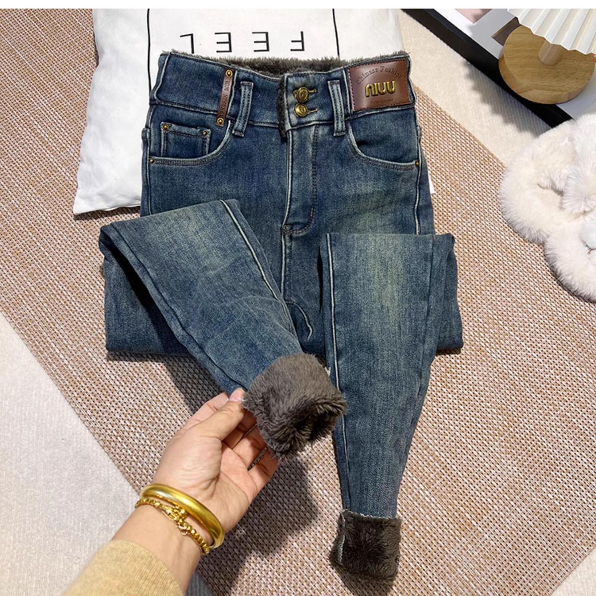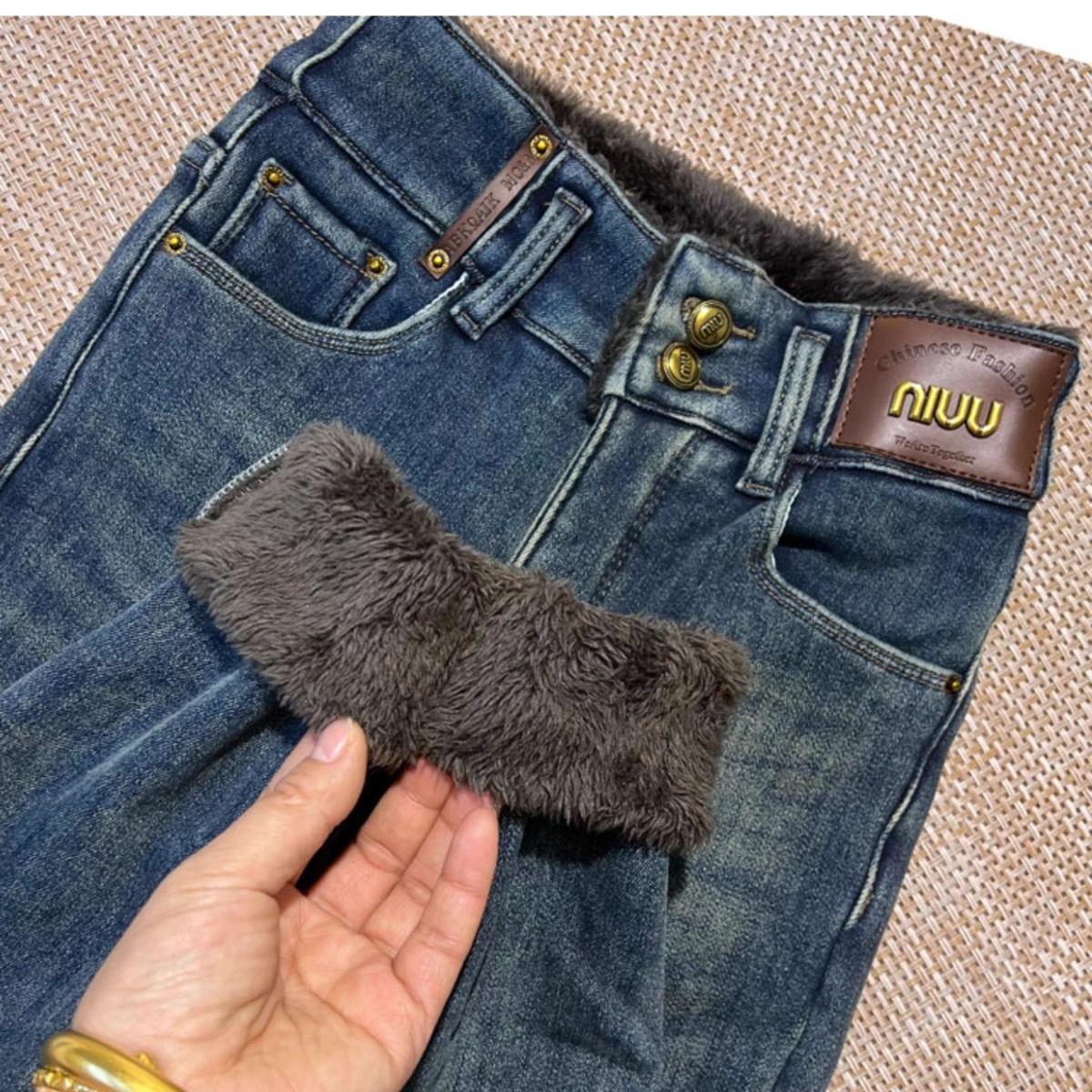 Pantalones vaqueros gruesos de color azul grisáceo con forro polar para mujer, de Chubby Girl, de invierno, nuevos, de cintura alta, ajustados, con diseño adelgazante, ajustados, pantalones de tubo