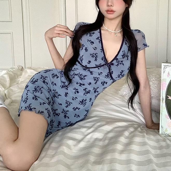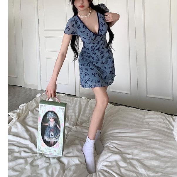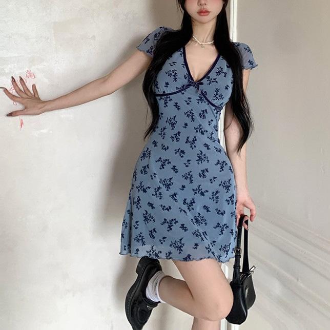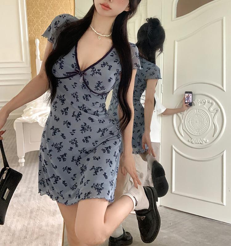 Verano Nuevo Estilo Rosa Cuello Cuadrado Manga Corta Vestido Femenino Petite Francés Dulce y Picante Falda