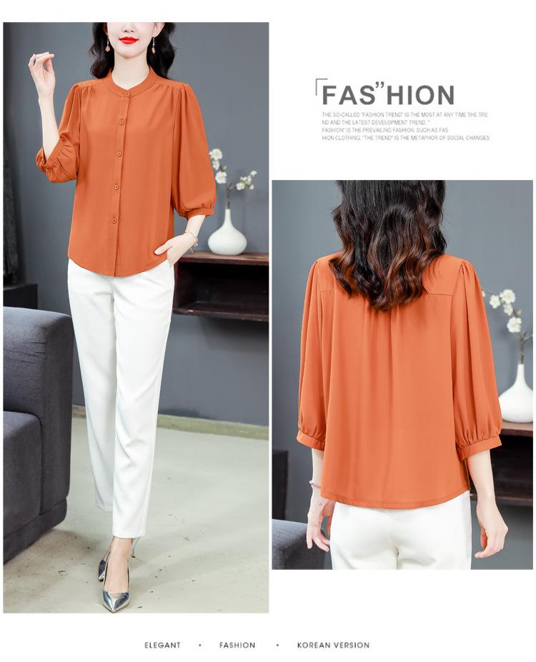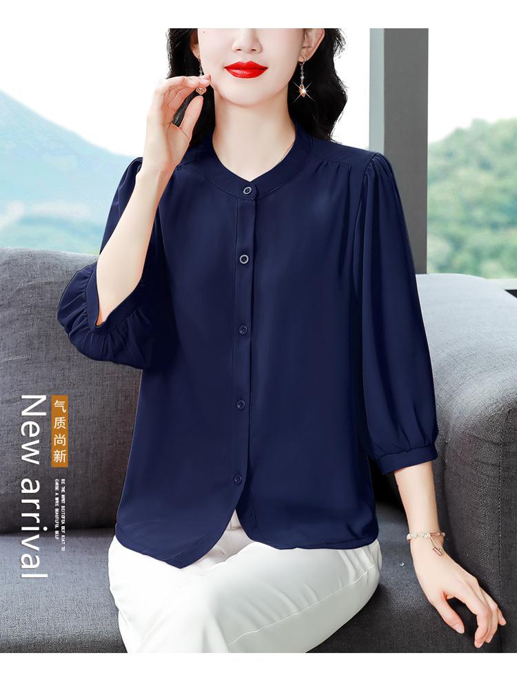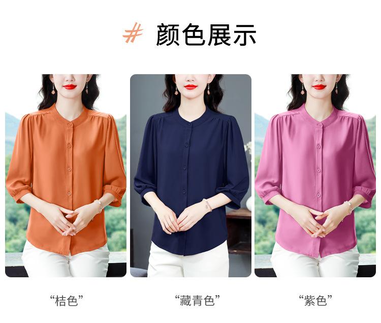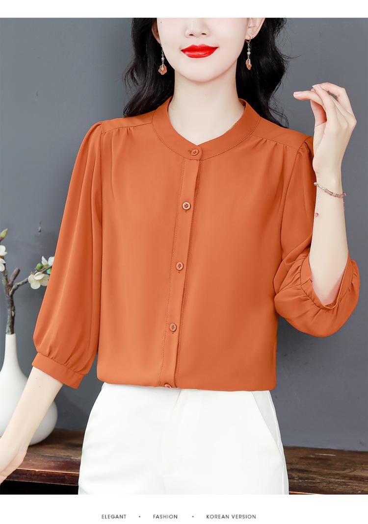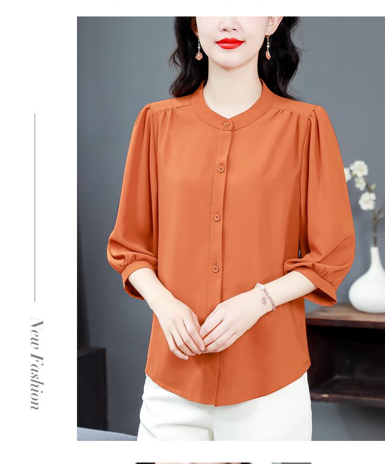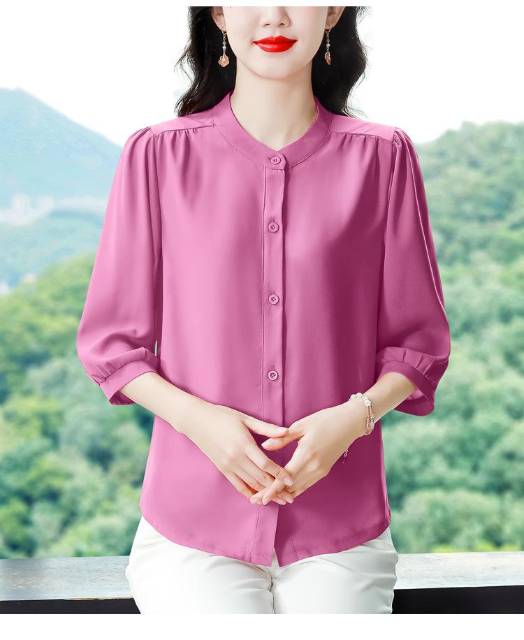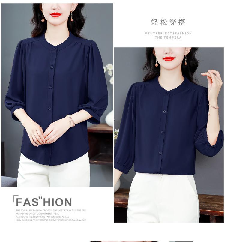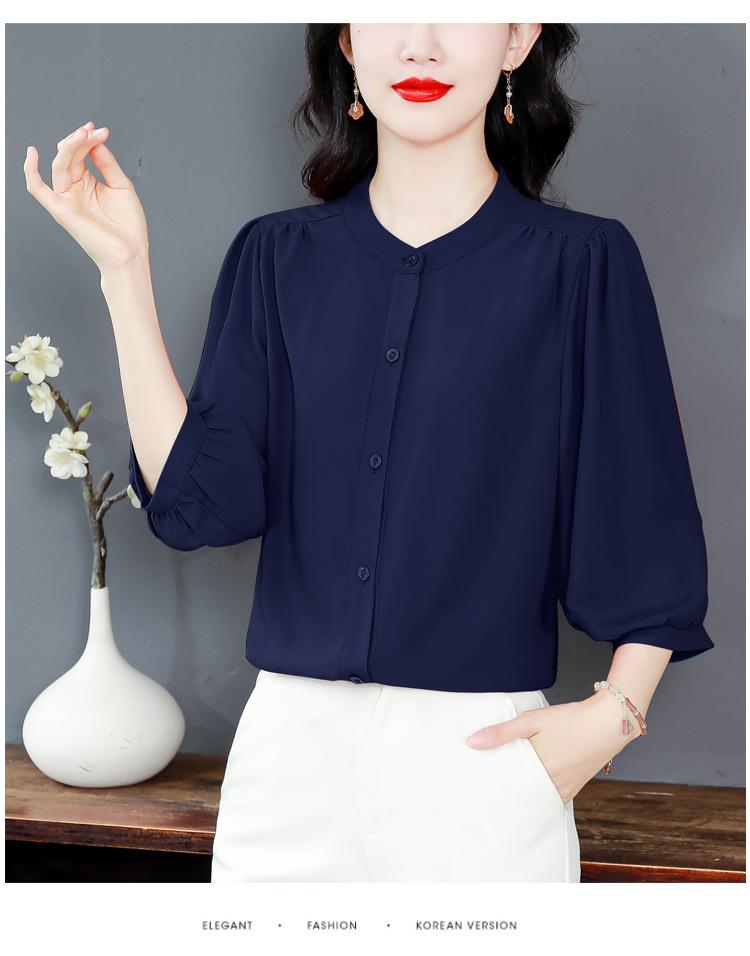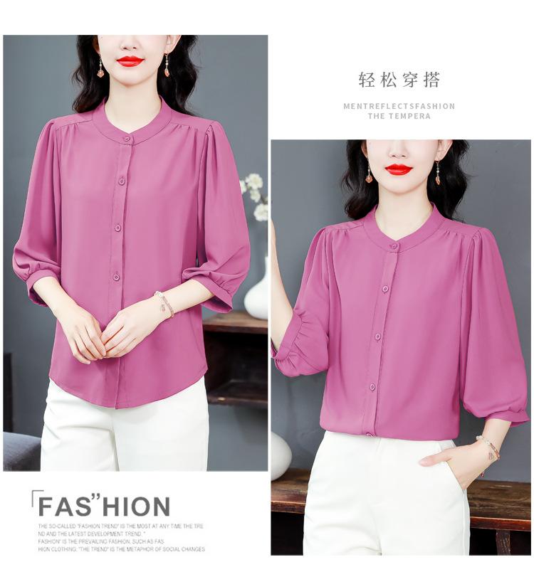 Camisa de Chifón de Manga Tres Cuartos con Cuello Mao para Mujer Verano 2024 Nuevo Diseño Versátil de Top de Media Manga Camisa Estilo Occidental