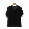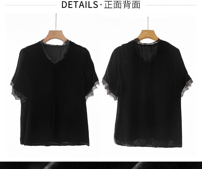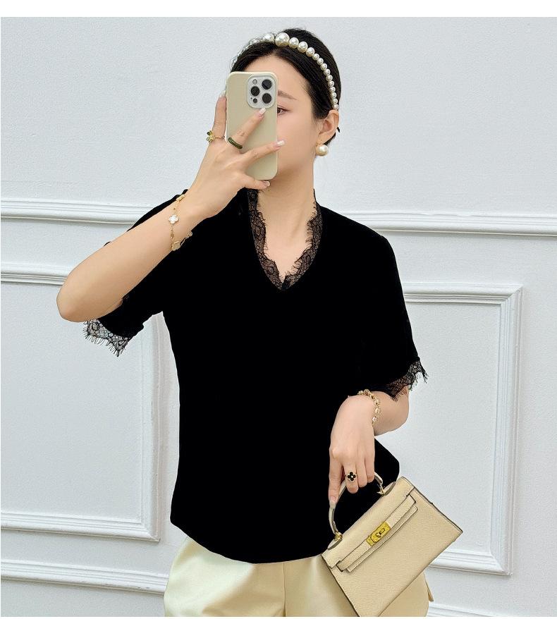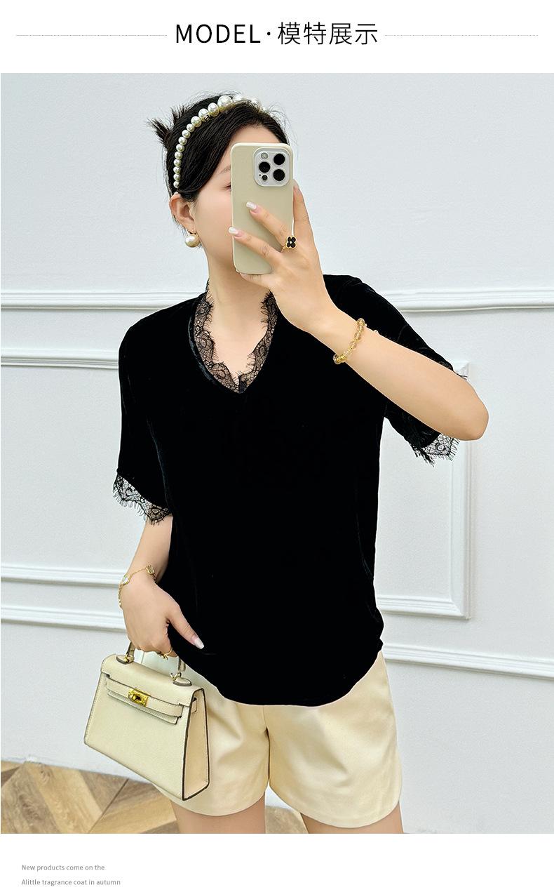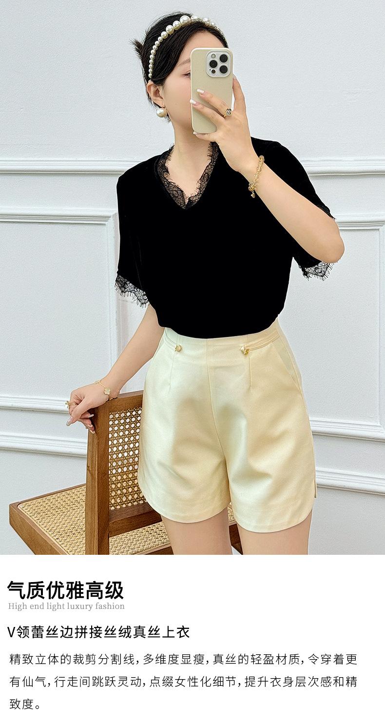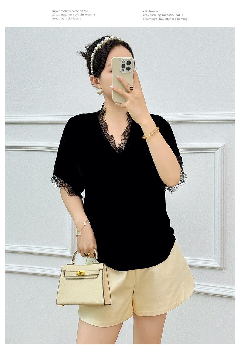 2418205-Top de Terciopelo de Seda Estilo Francés Elegante Calidad Encaje Empalmado Seda de Morera Camiseta de Verano para Mujer