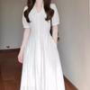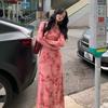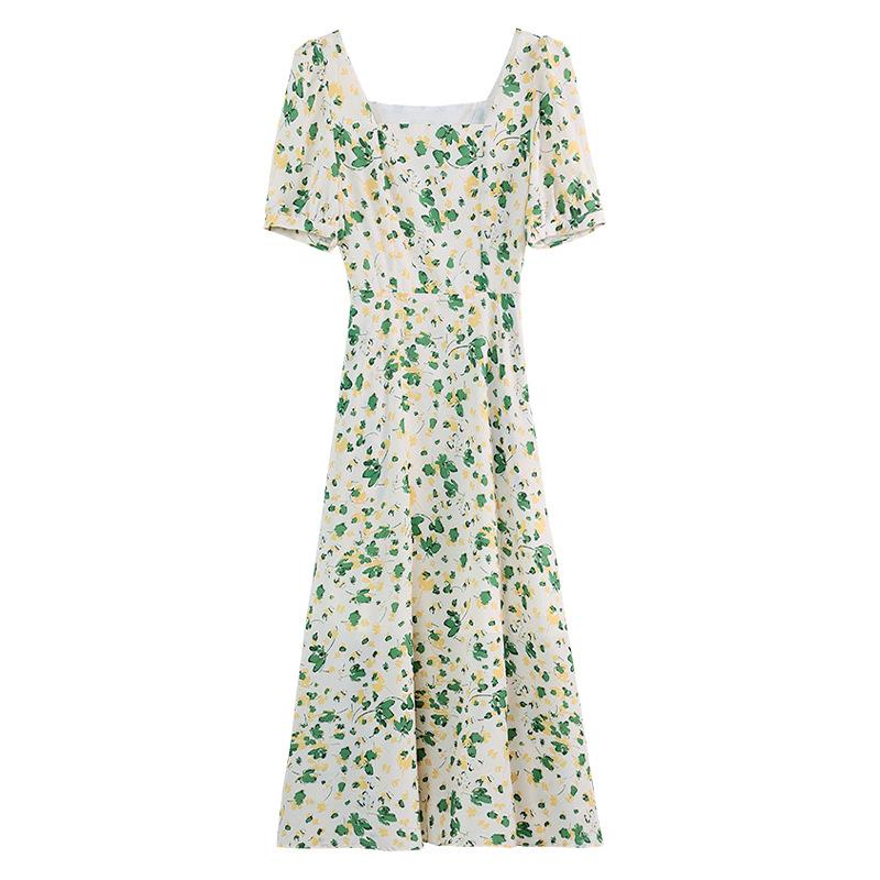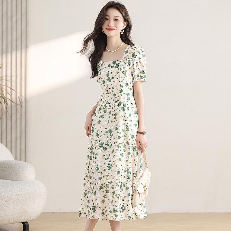 Vestido Floral Verde para Mujer 2025 Verano Nuevo Estilo Pequeño Slim Elegante Cuello Cuadrado A-Línea Chifón Falda Larga