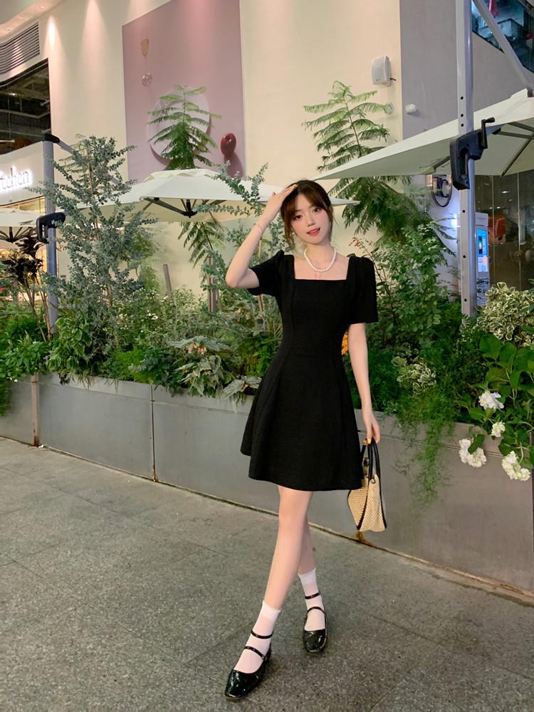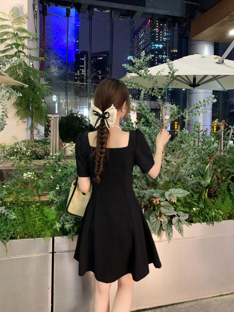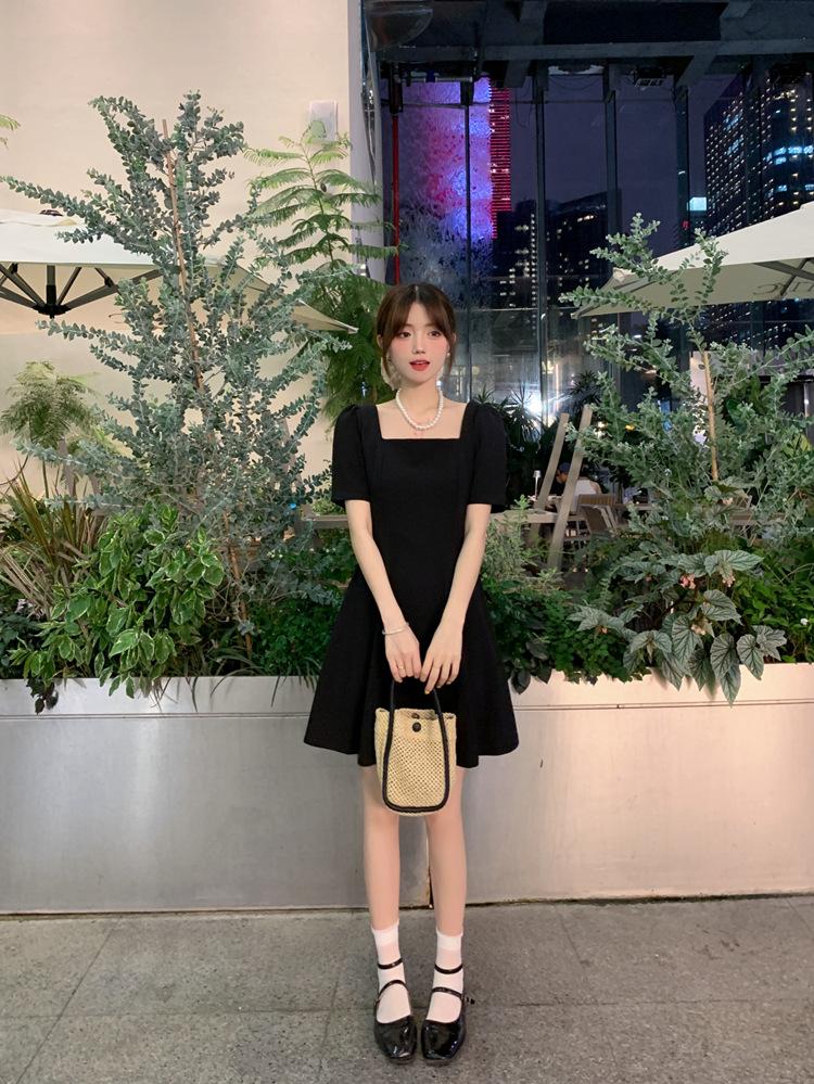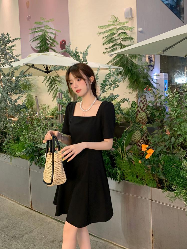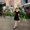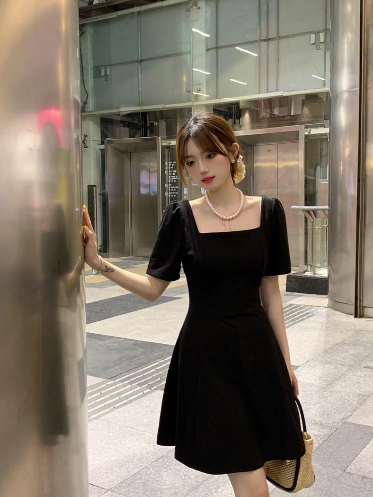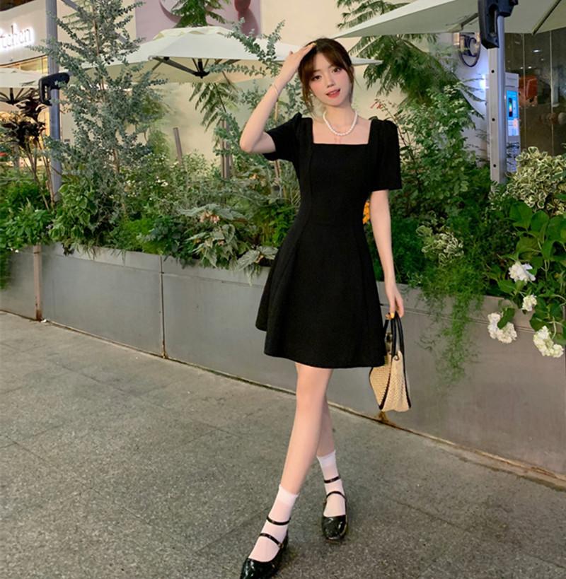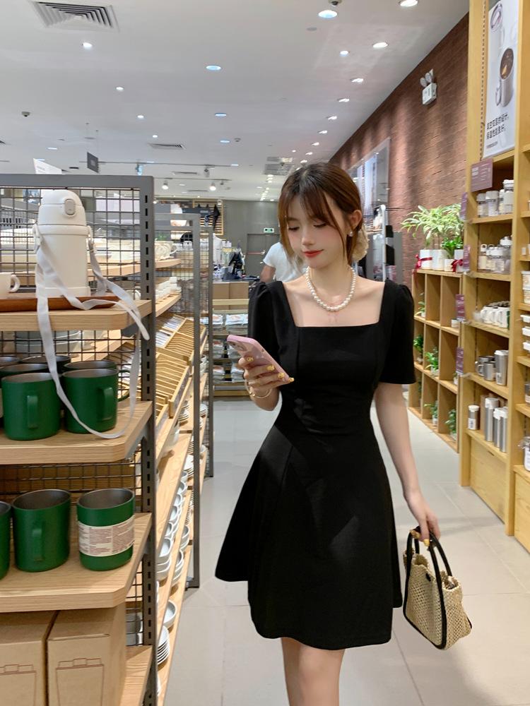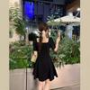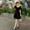 Vestido negro pequeño con cuello cuadrado, estilo francés Hepburn, para mujer, verano, falda acampanada, 2024