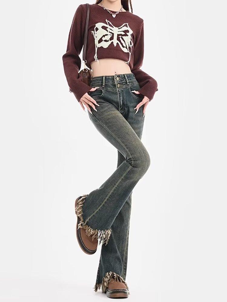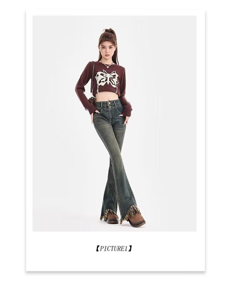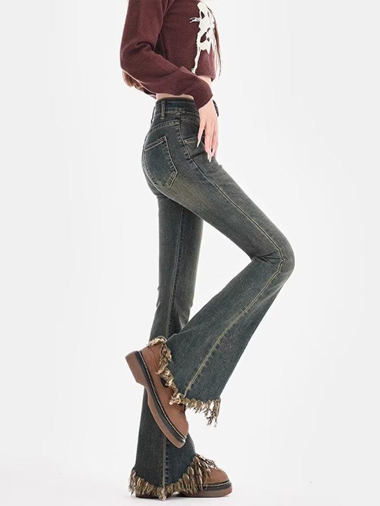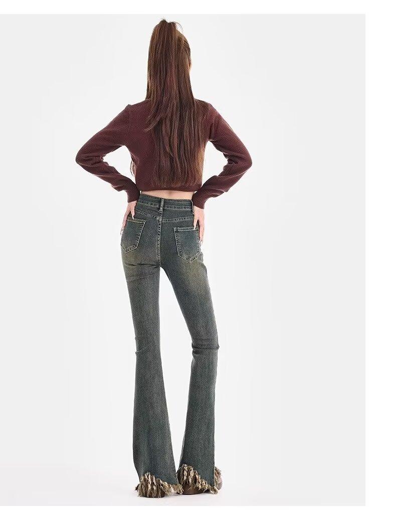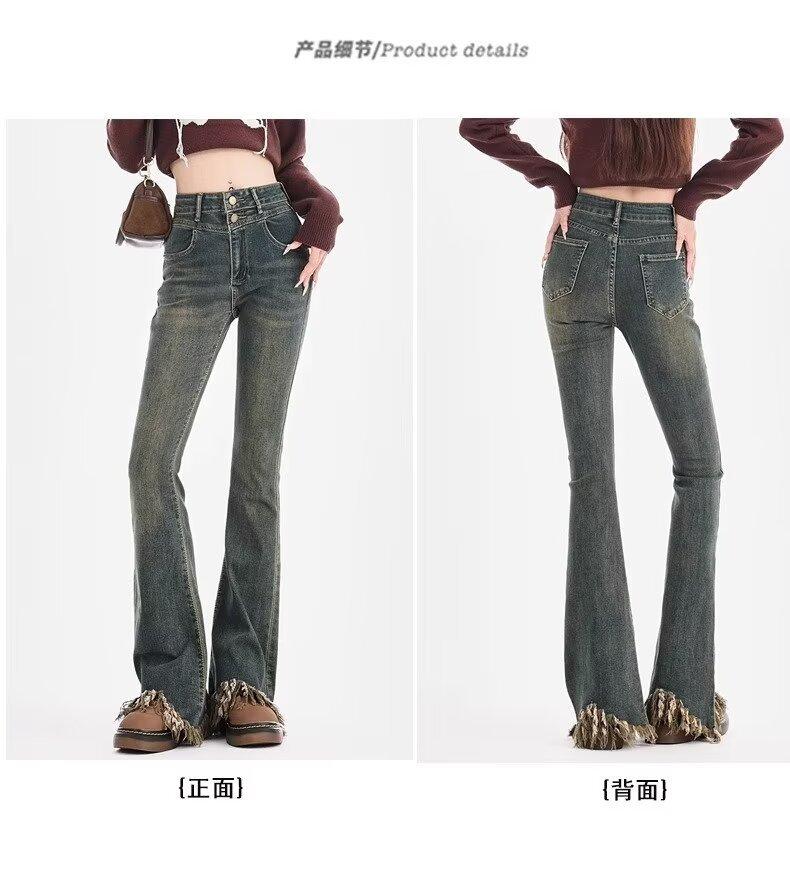 Vaqueros acampanados de cintura alta para mujer, diseño nuevo de primavera y otoño, pantalones de herradura deshilachados con borlas vintage que adelgazan.