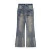 Distressed, washed, polished, zipper style, buttons, multiple flap pocket pants, scratch pattern, holes, frayed, cuffed